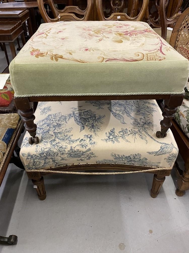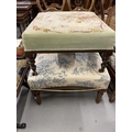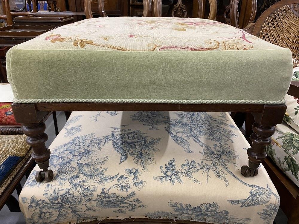 19th cent. Two large mahogany footstools with floral cushioned upholstery.