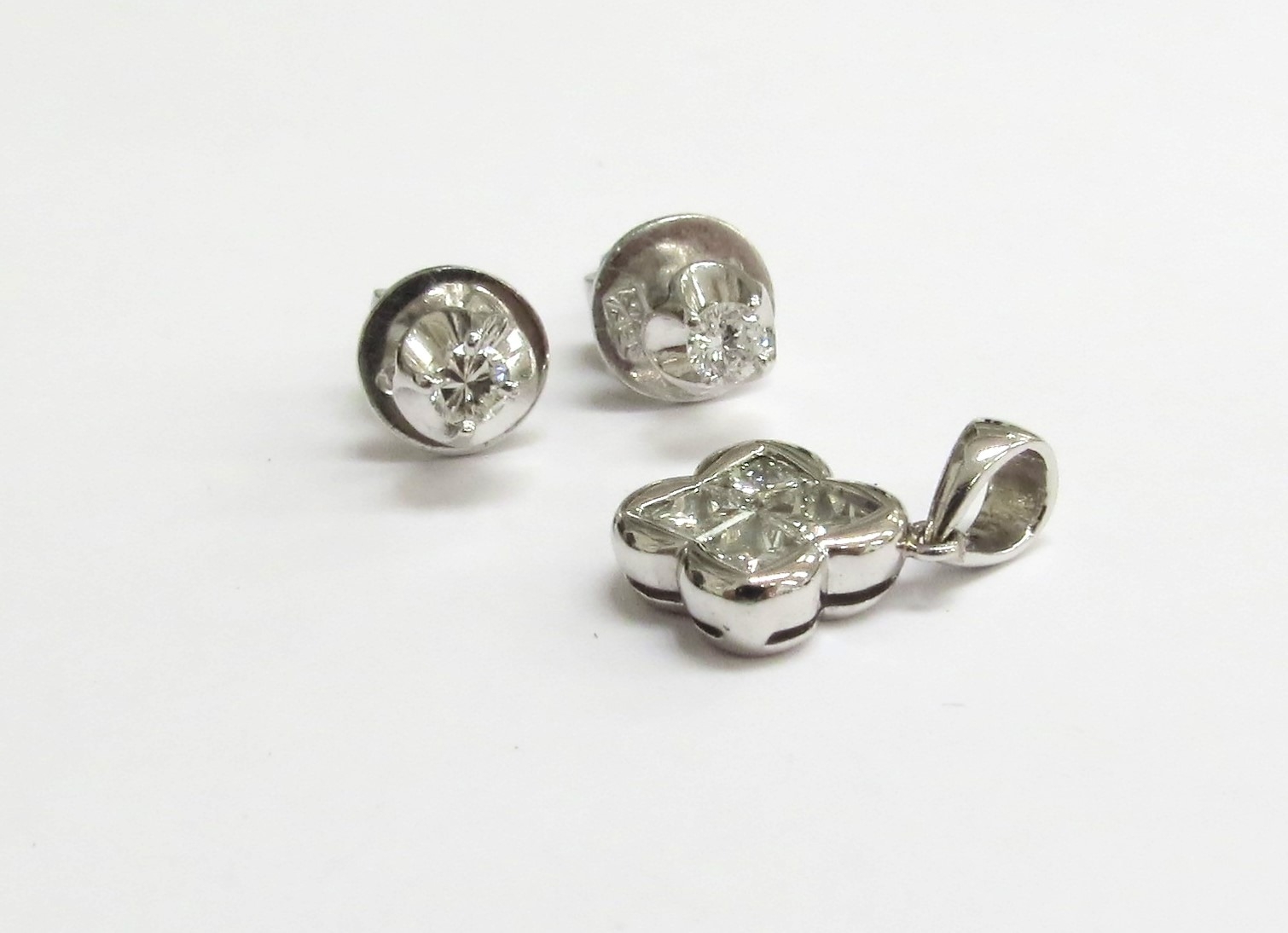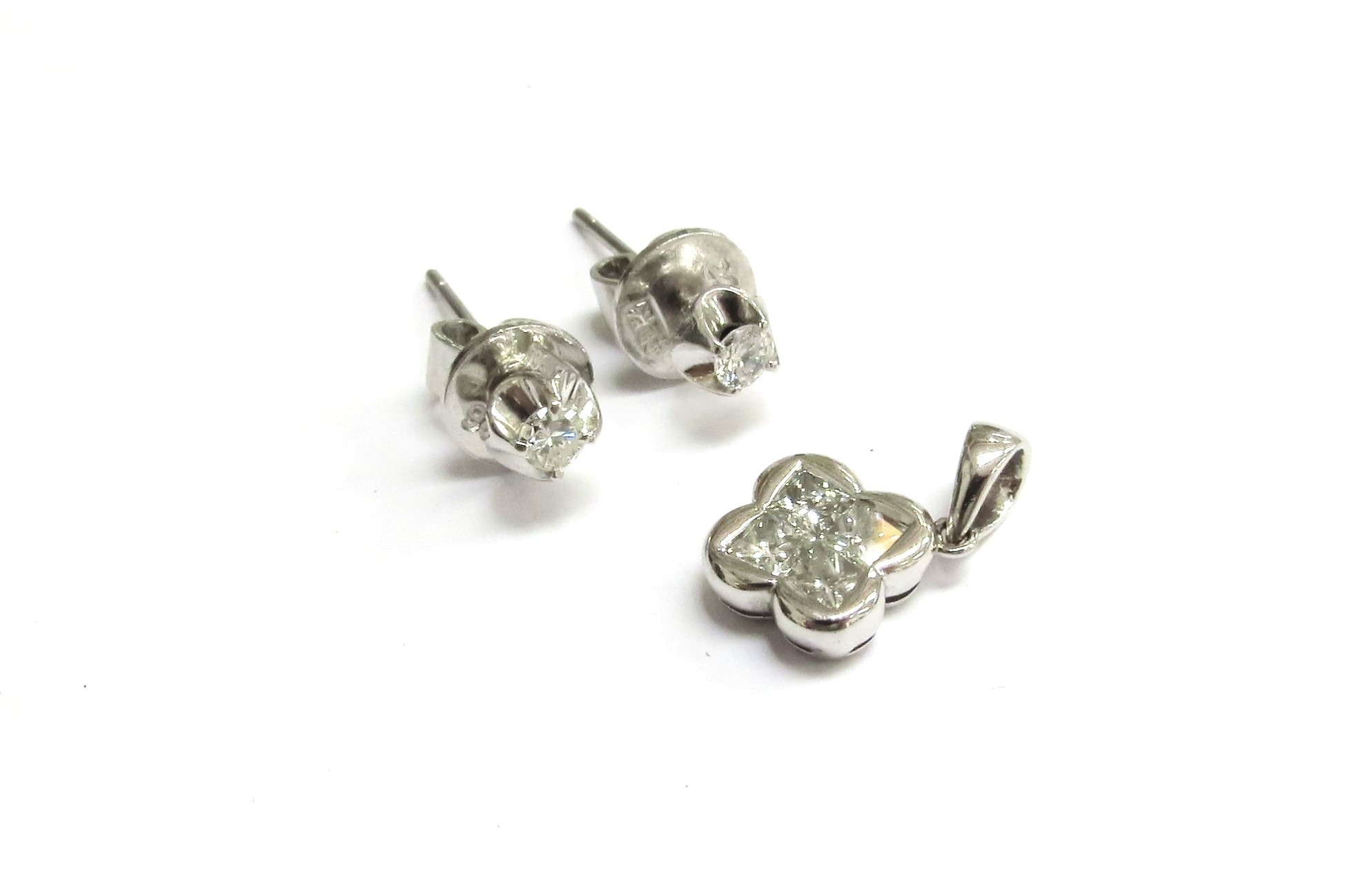 A white gold pendant set with four square cut diamonds, marked 750 and a pair of diamond stud earrings, Chinese mark to back, 4.1g total