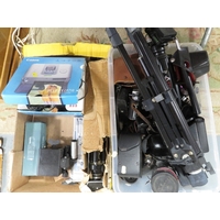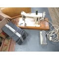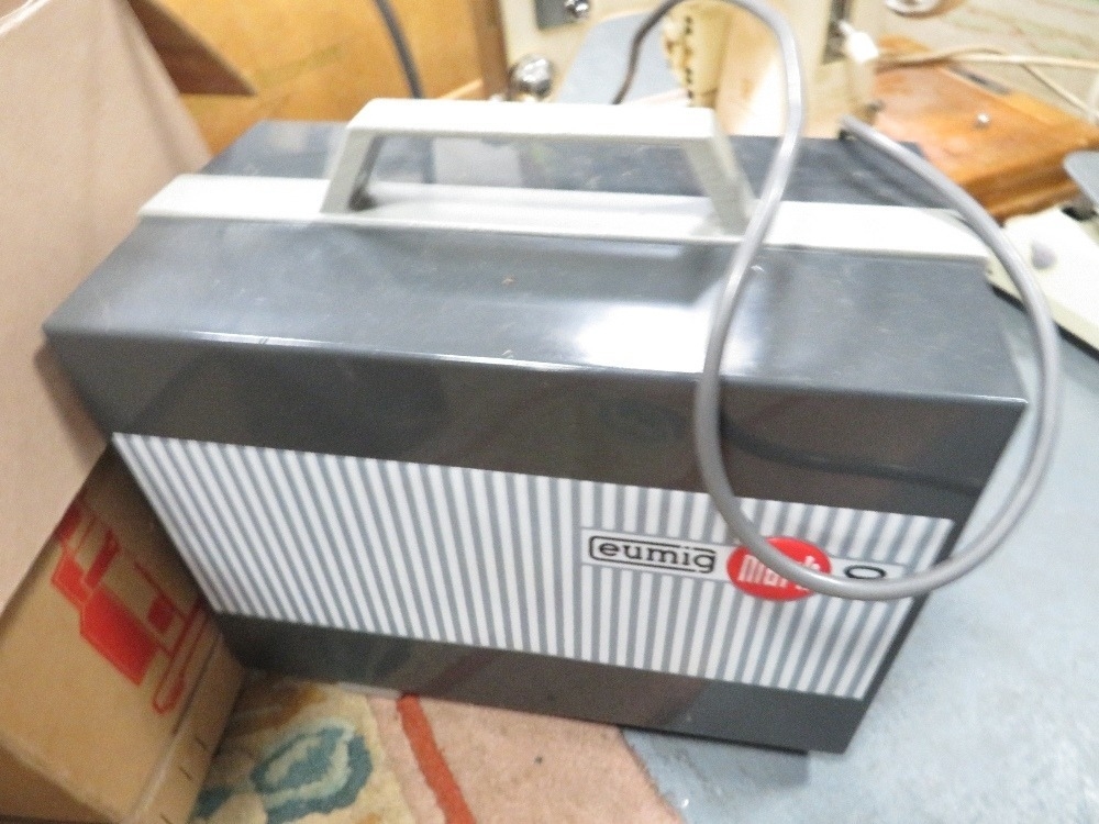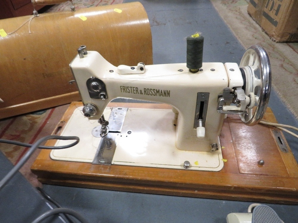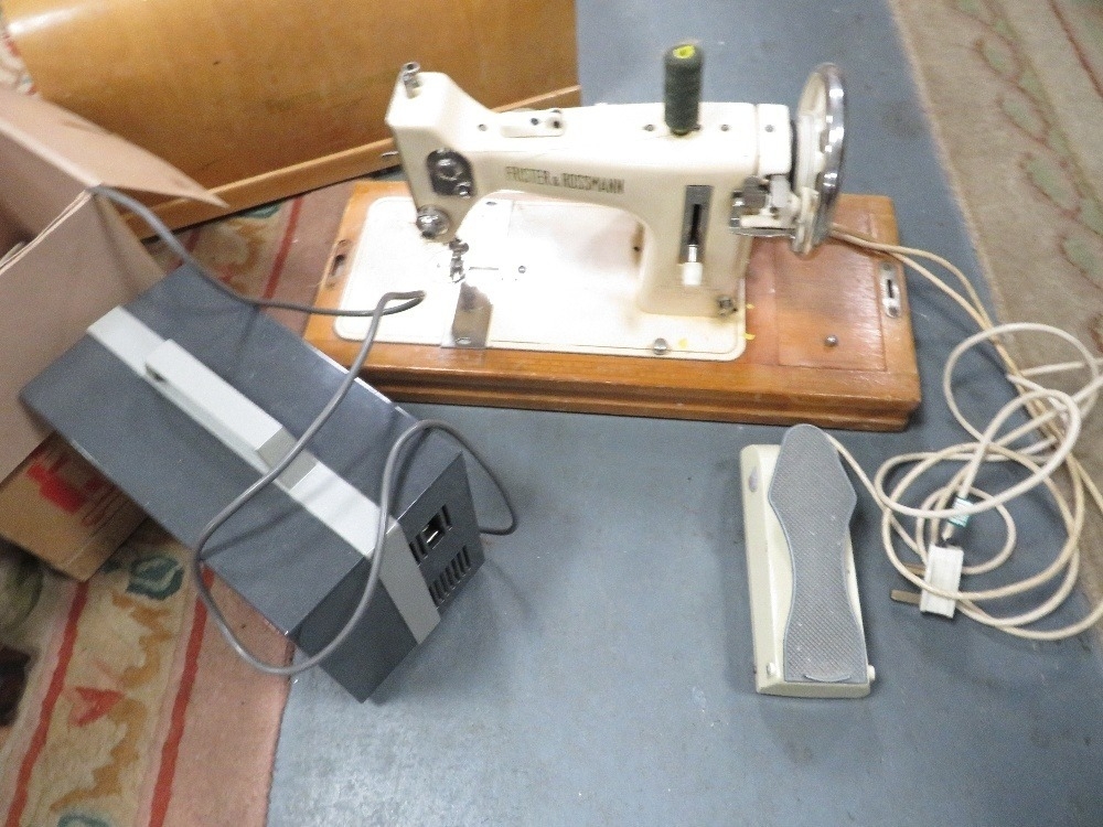 A vintage Frister & Rossmann electric sewing machine together with a projector