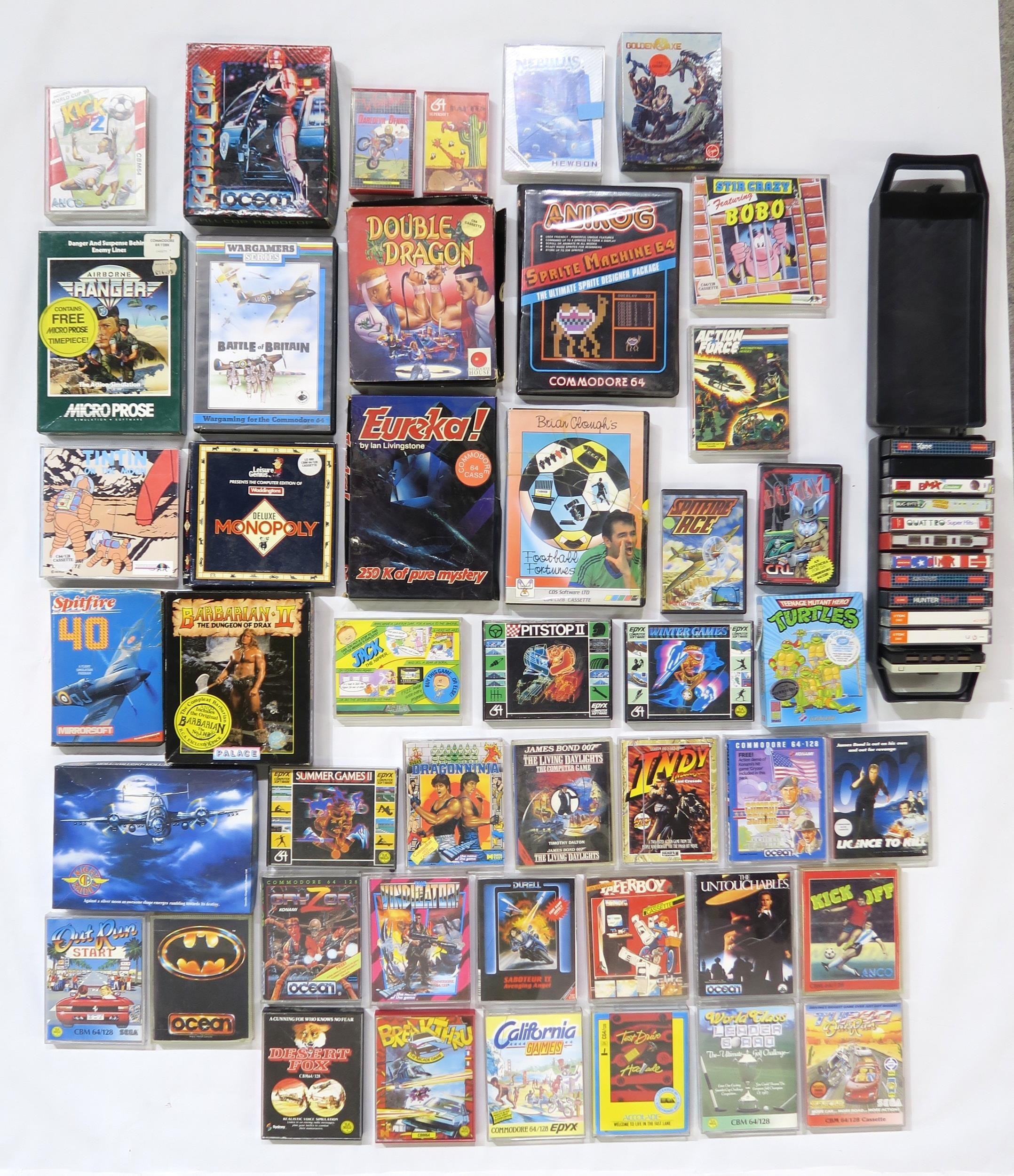 A collection of Commodore 64/128 game cassettes, to include Indy: Indiana Jones and the Last Crusade, Teenage Mutant Ninja Turtles, James Bond: Licence to Kill and the Living Daylights, Bugsy, Action Force: International Heroes, Spitfire 40, Batman, Gryzor, Barbarian II: the Dungeon of Drax, Double Dragon and many others; together with various boxed reels of recording tape, boxed Viewmaster 3-Dimension Viewer and assorted modern books on shipping, the railways etc.
