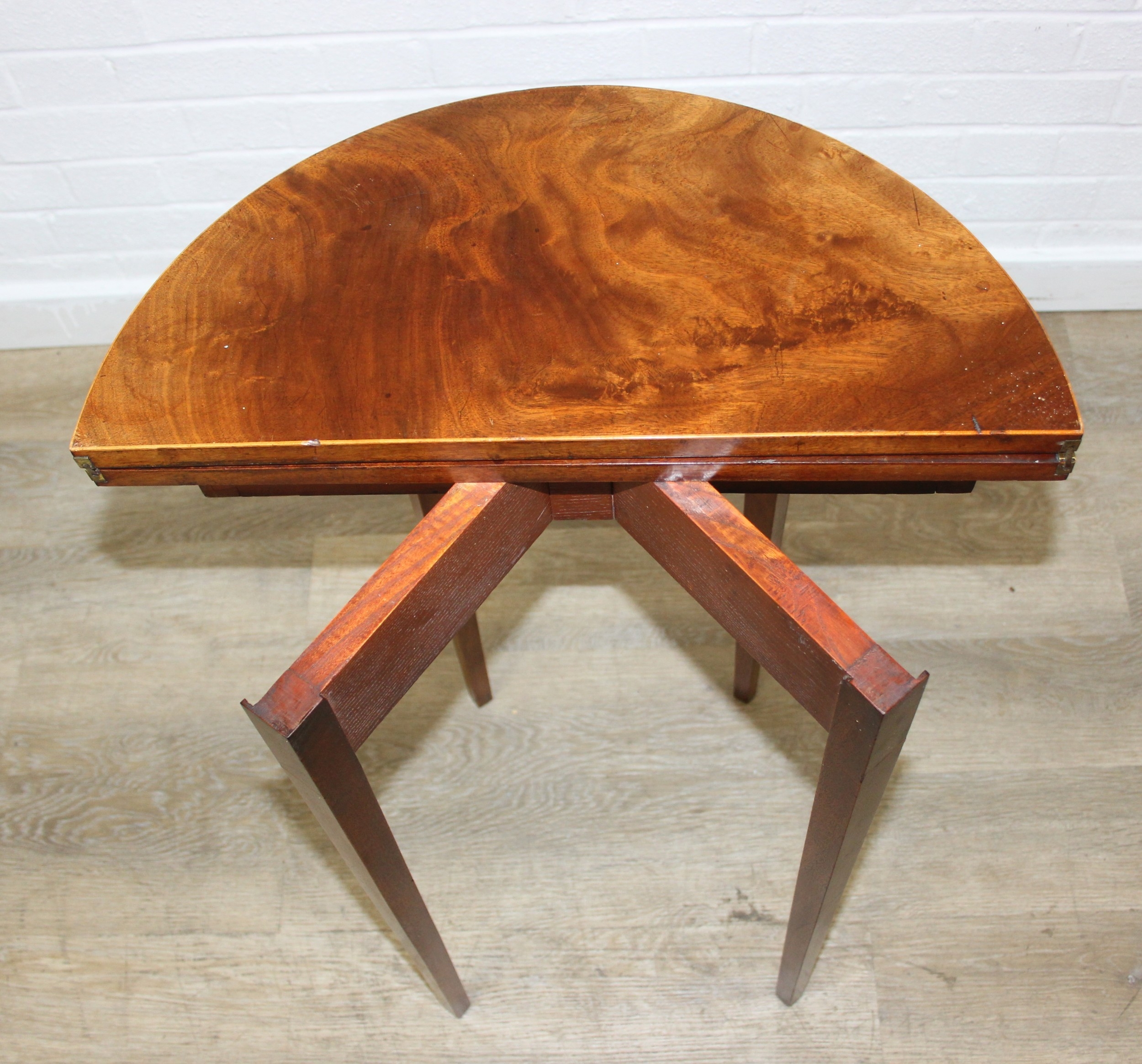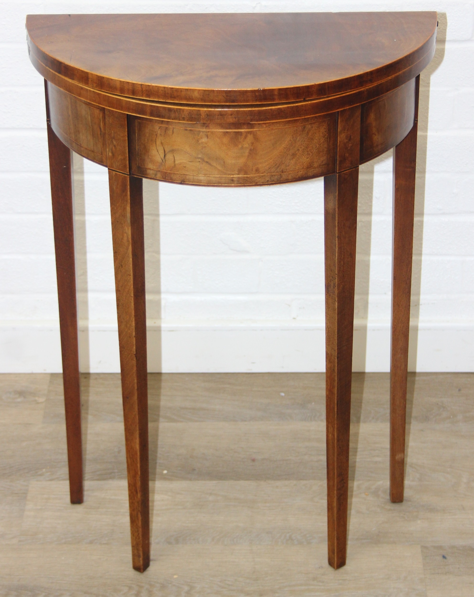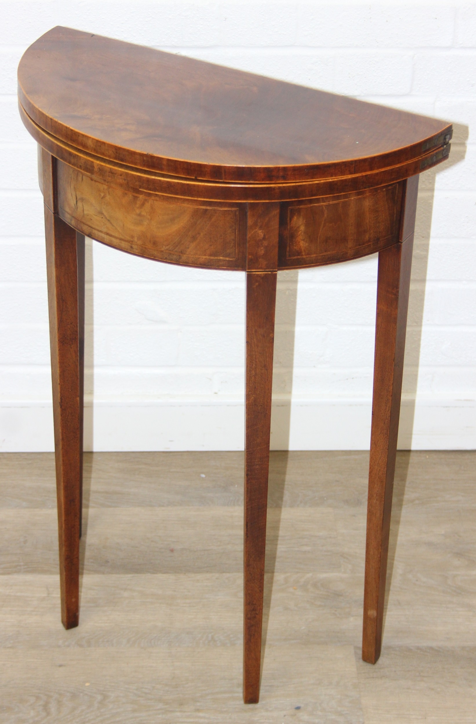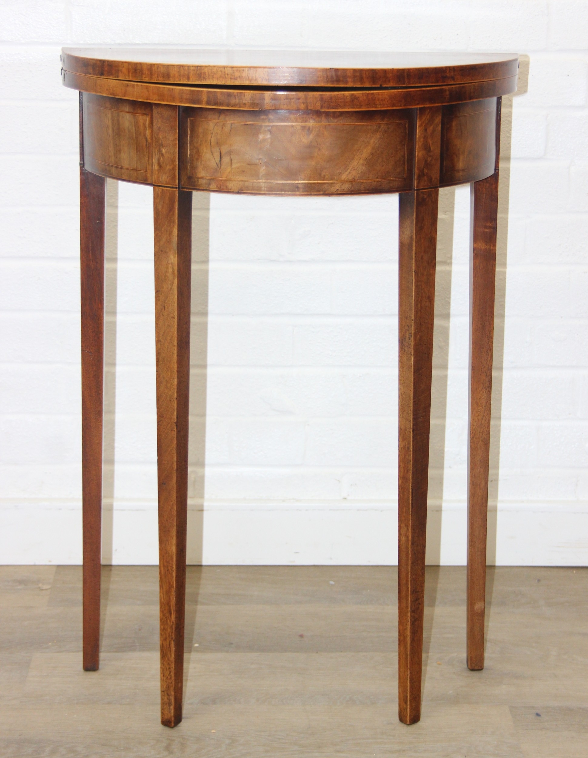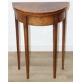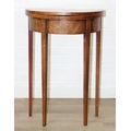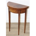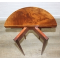 An antique metamorphic demi-lune table with fold over top and thin tapering legs, 54cm x 26cm x 75cm when closed
