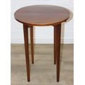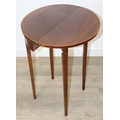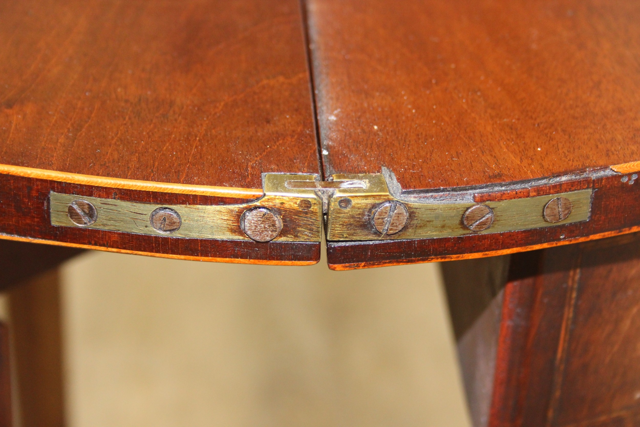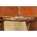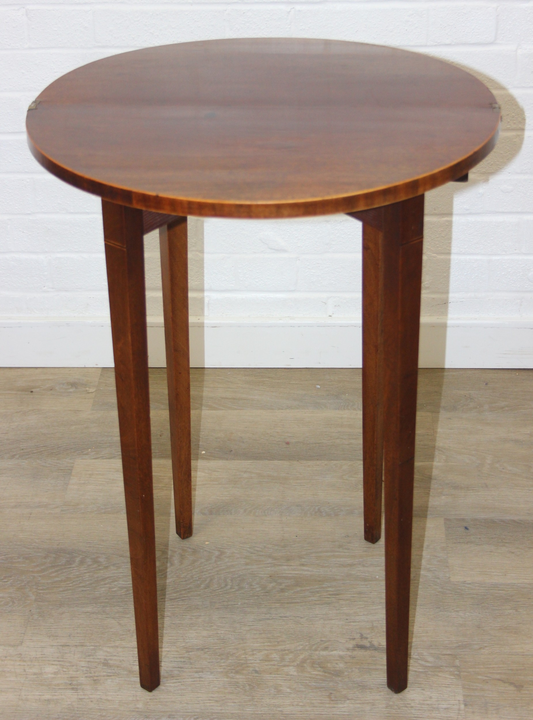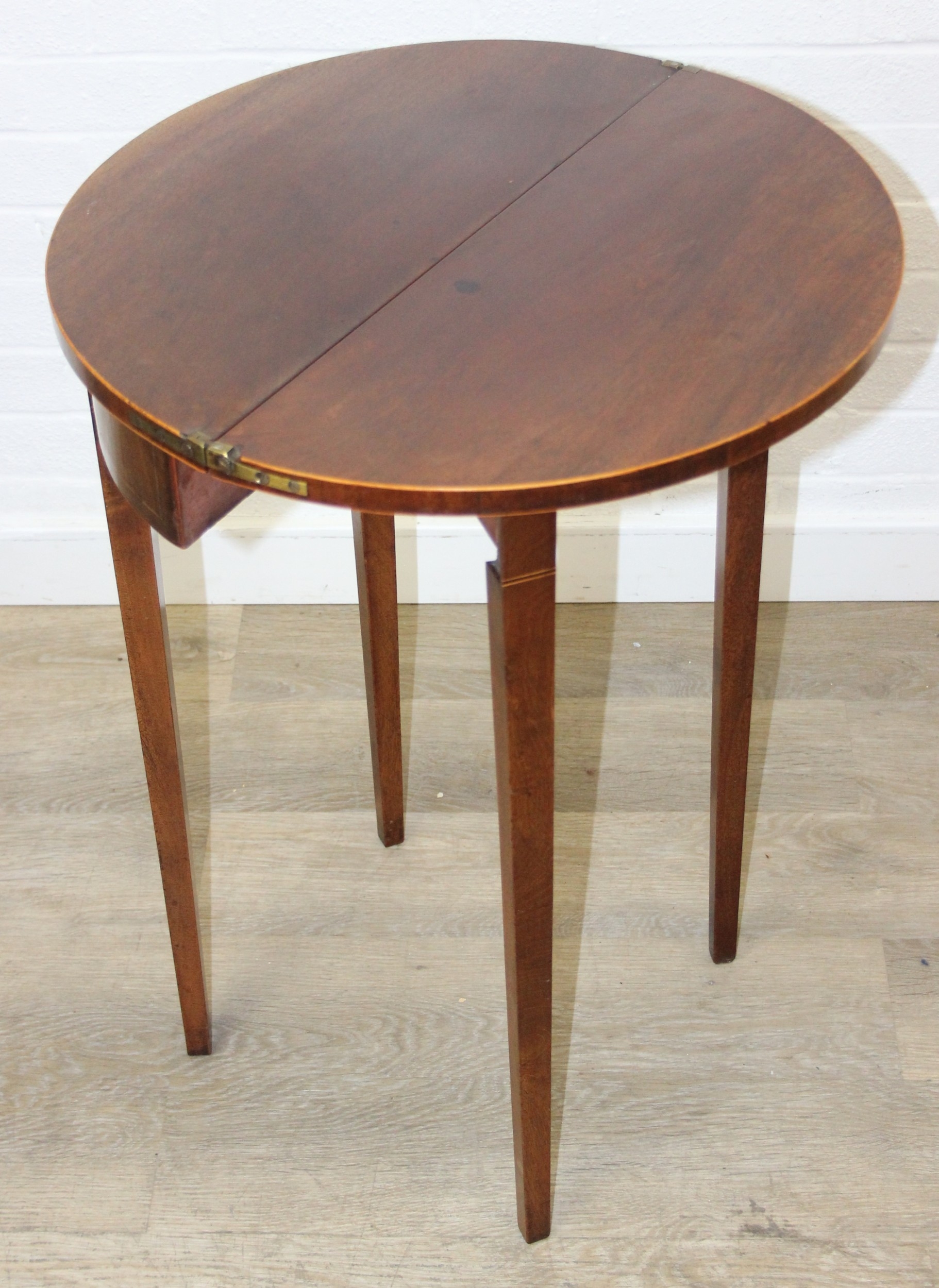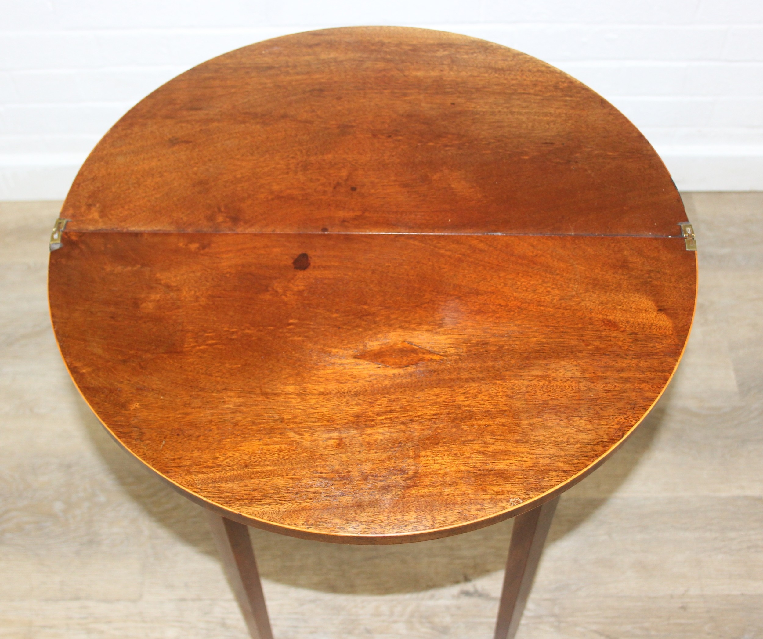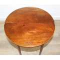 An antique metamorphic demi-lune table with fold over top and thin tapering legs, 54cm x 26cm x 75cm when closed