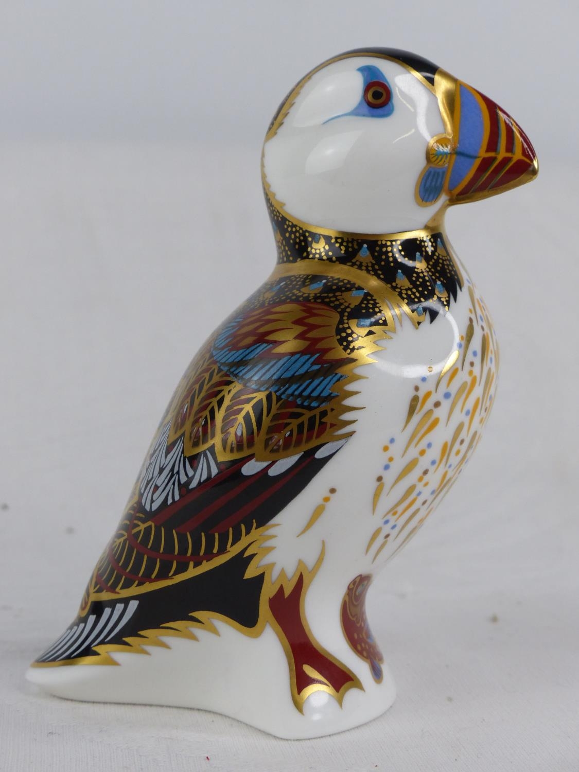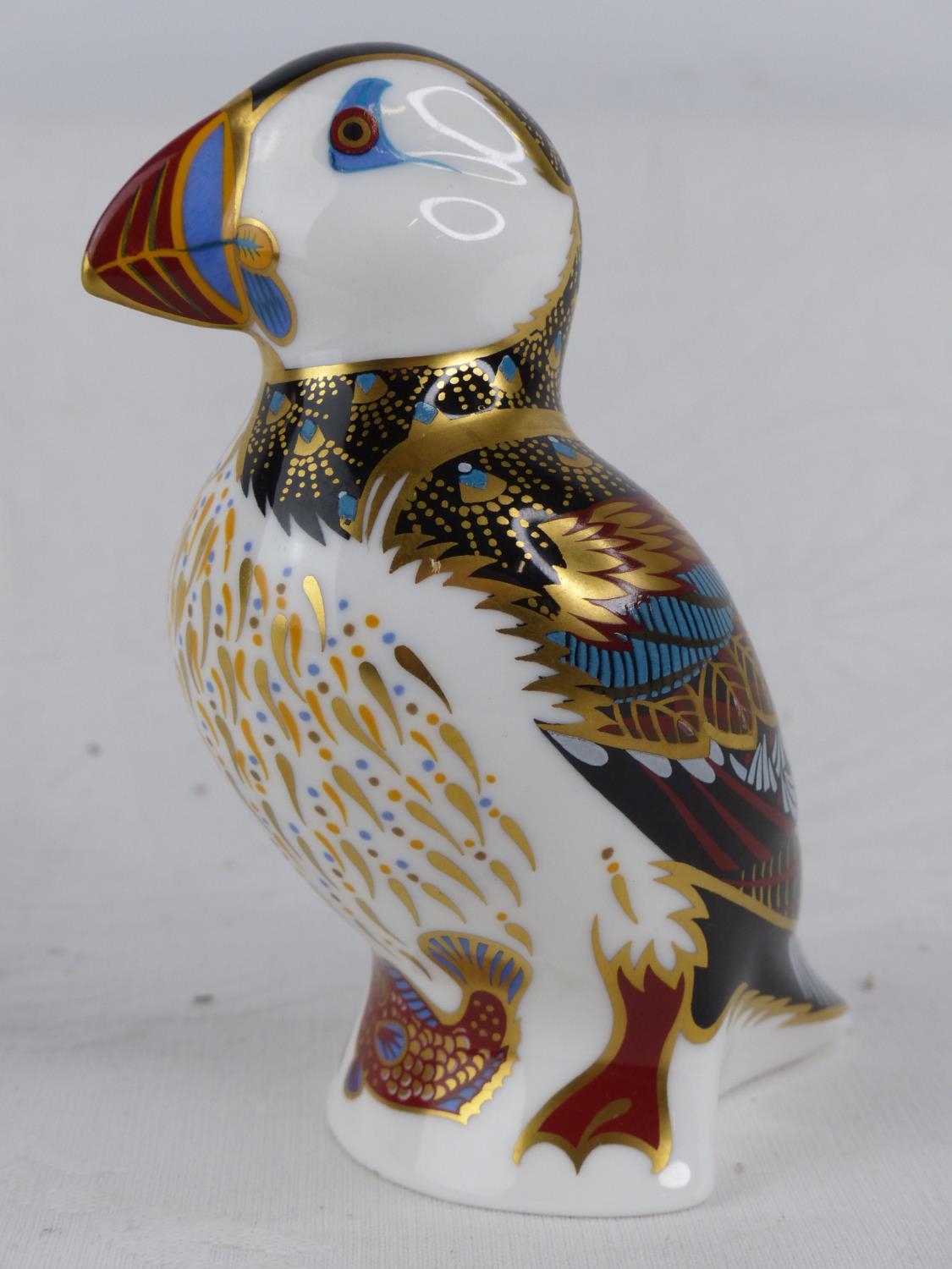 A Royal Crown Derby puffin paperweight, with silver stopper.