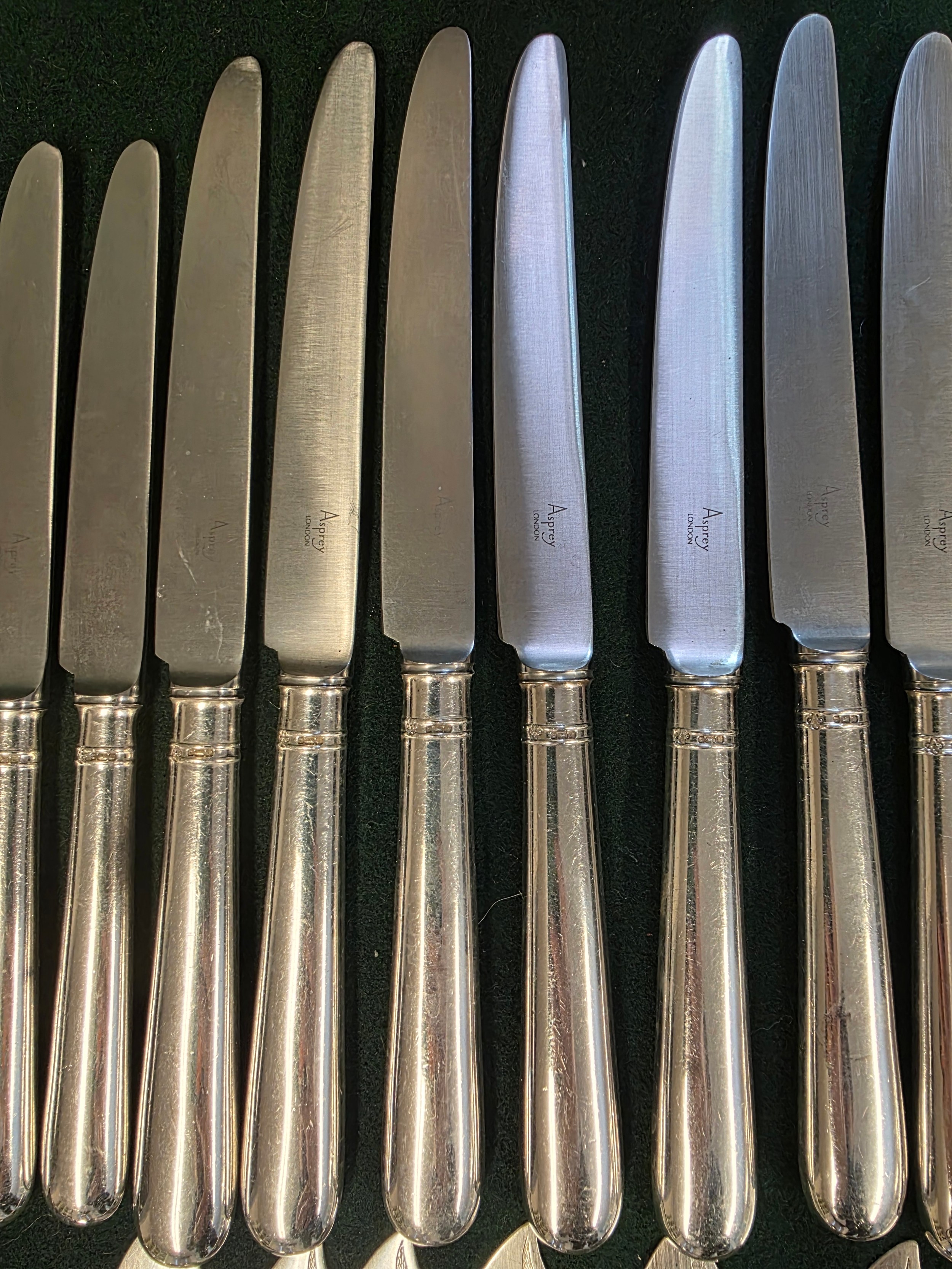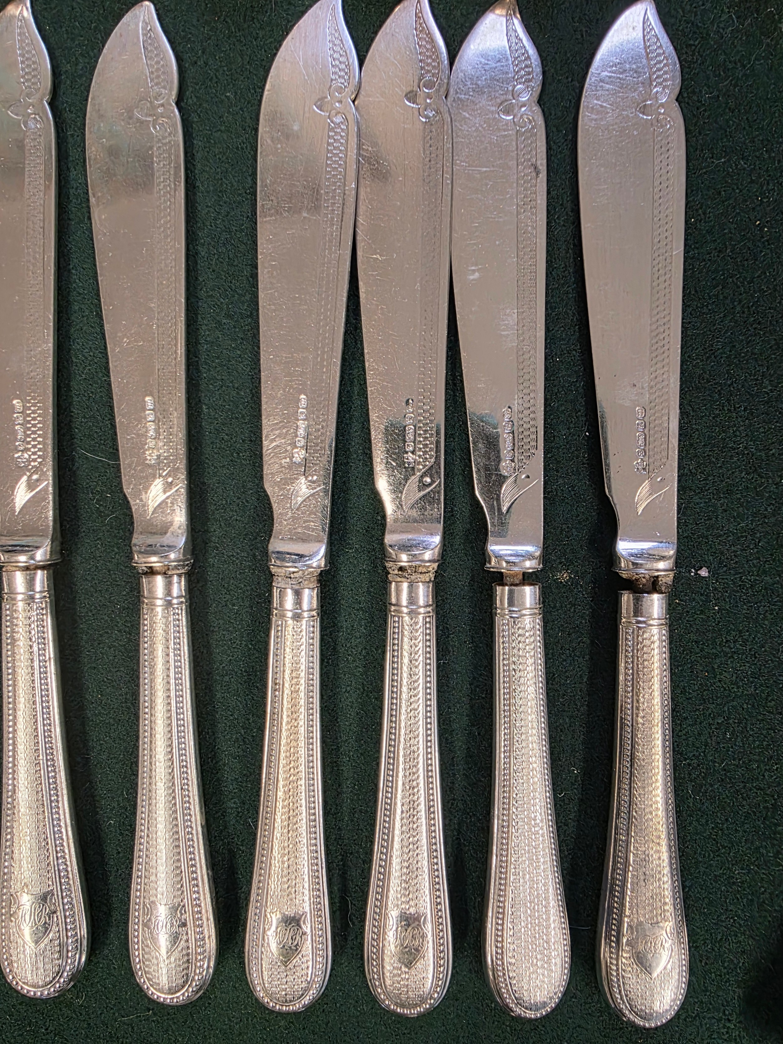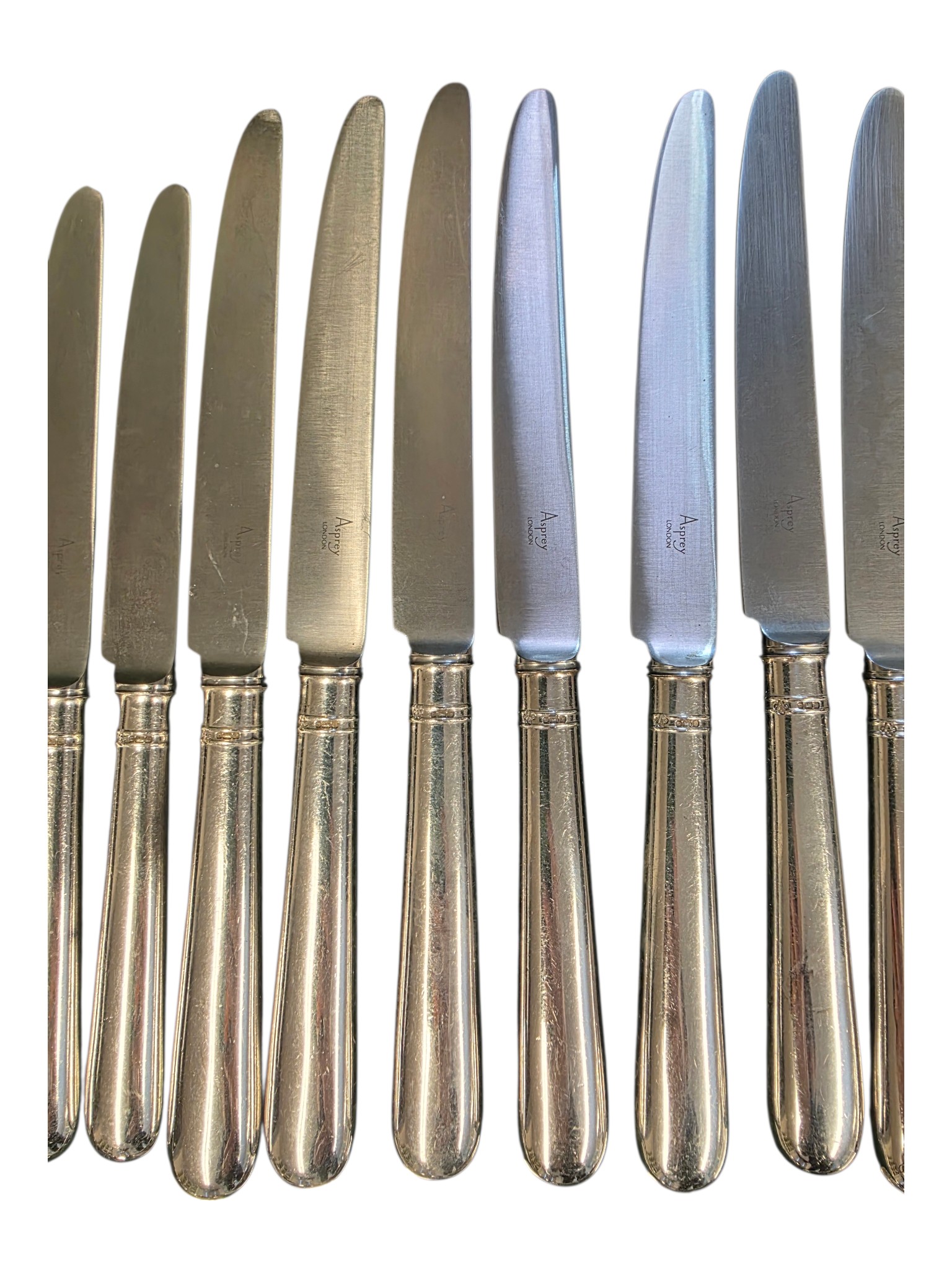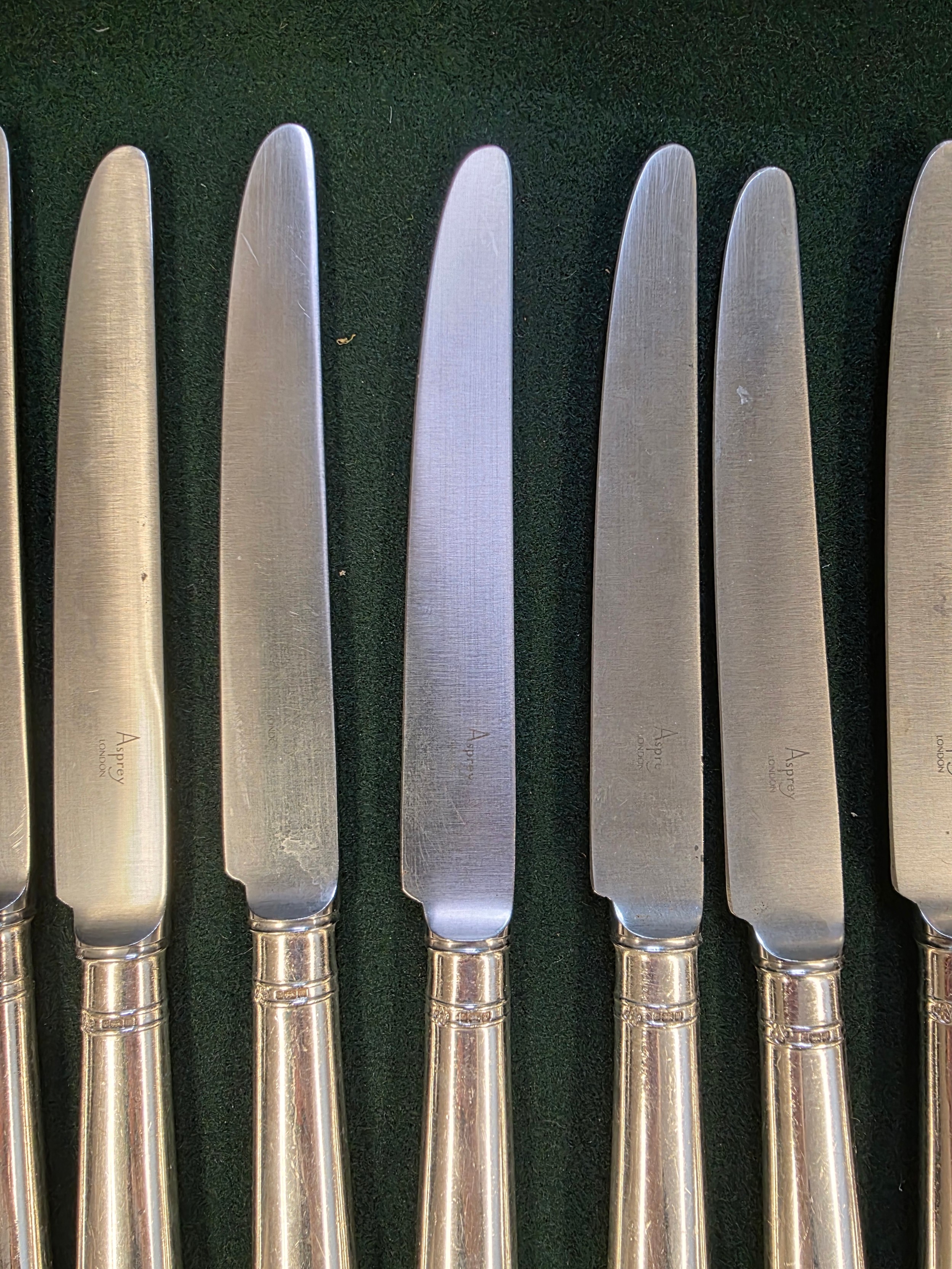 A collection of sterling silver and white metal handled knives, two of the sets by Asprey's .