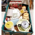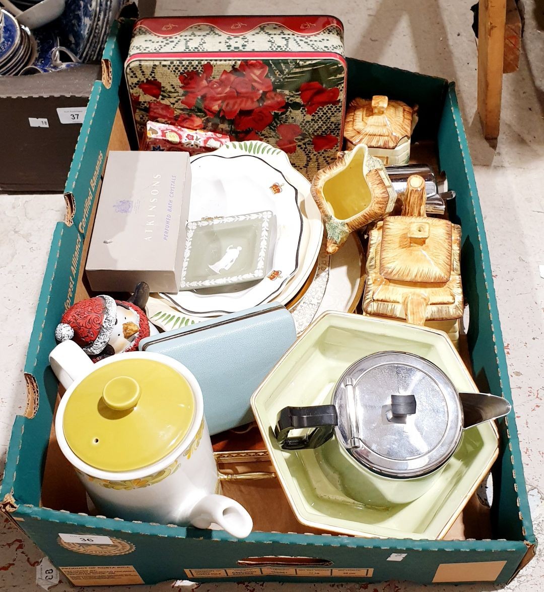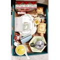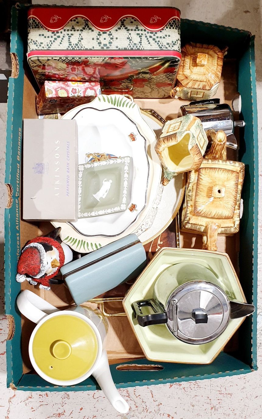 A box including a cottage ware style tea ware and other assorted ceramics. No shipping. Arrange collection or your own packer and shipper, please.