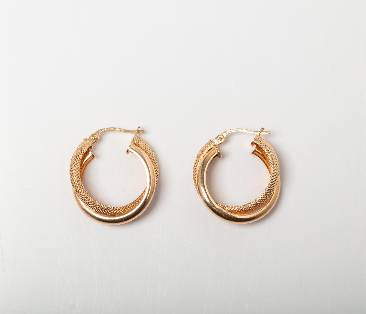 9CT GOLD CROSSOVER HOOP EARRINGS A pair of Crossover polished and textured hinged hoop earrings crafted in 9ct yellow gold weighing 1.57g