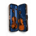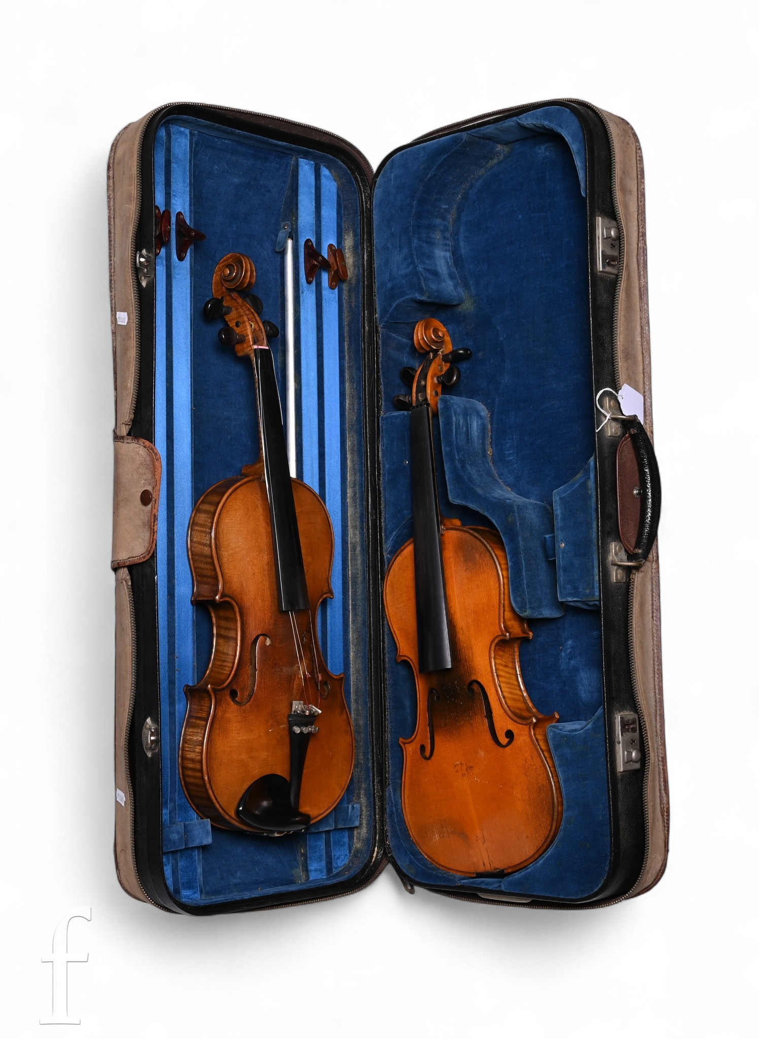 A late 19th Century German violin, bears facsimile label Violon Ecole Grandini Antonius Stradiuarius 1721, figured back, length 36cm, and a similar violin labelled Nicolaus Amati, length 36cm, both in the same fitted case. (2)