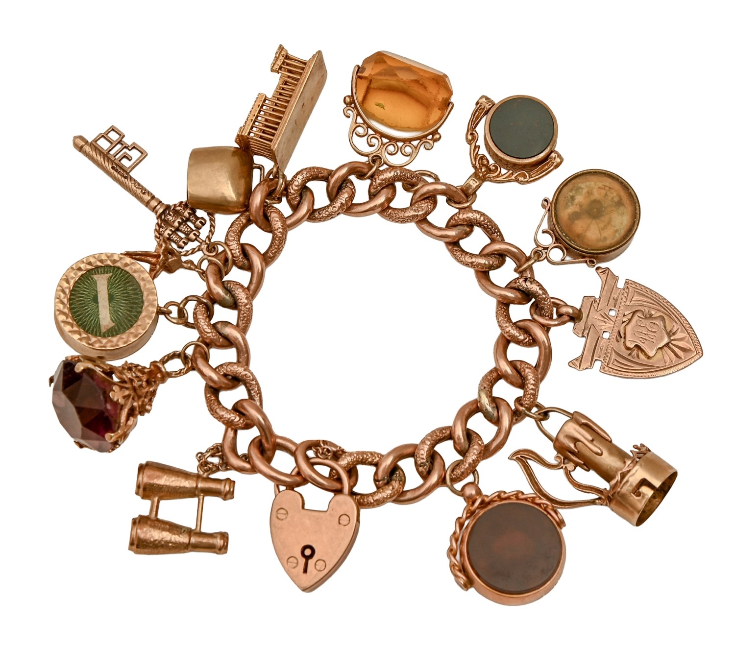 A gold charm bracelet, with padlock and a collection of gold charms, including binoculars, candlestick and three watch fob swivel seals, approx 17cm l, 66.6g