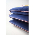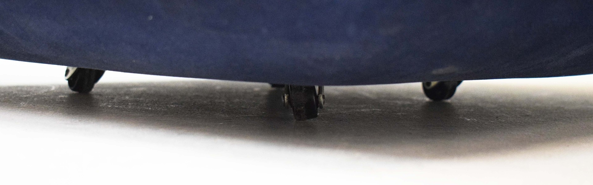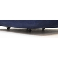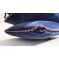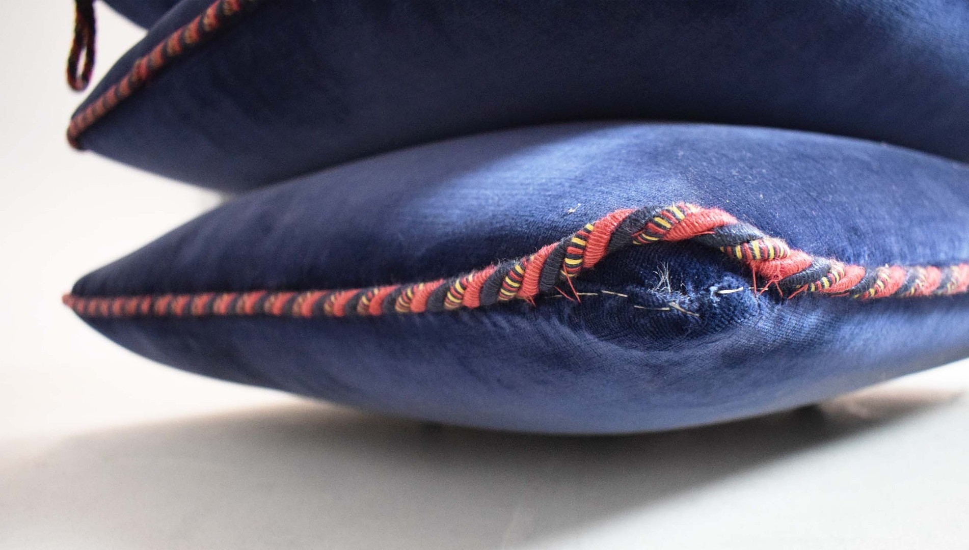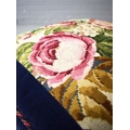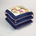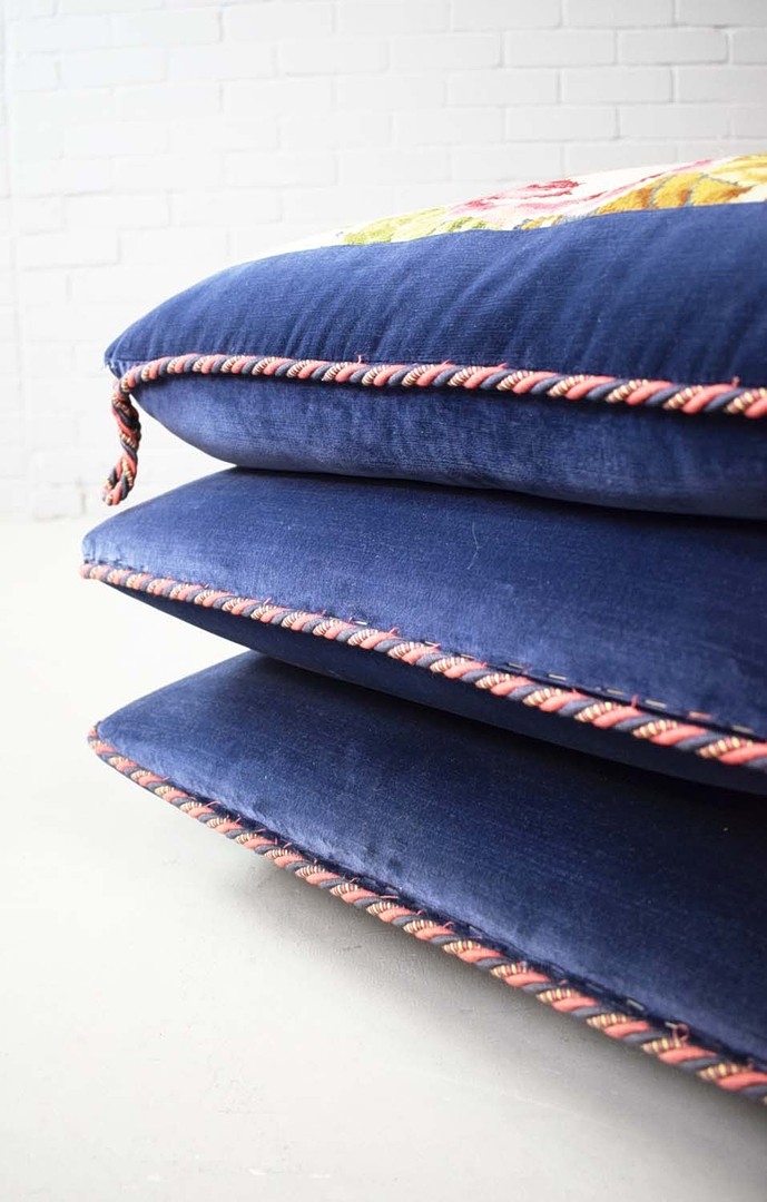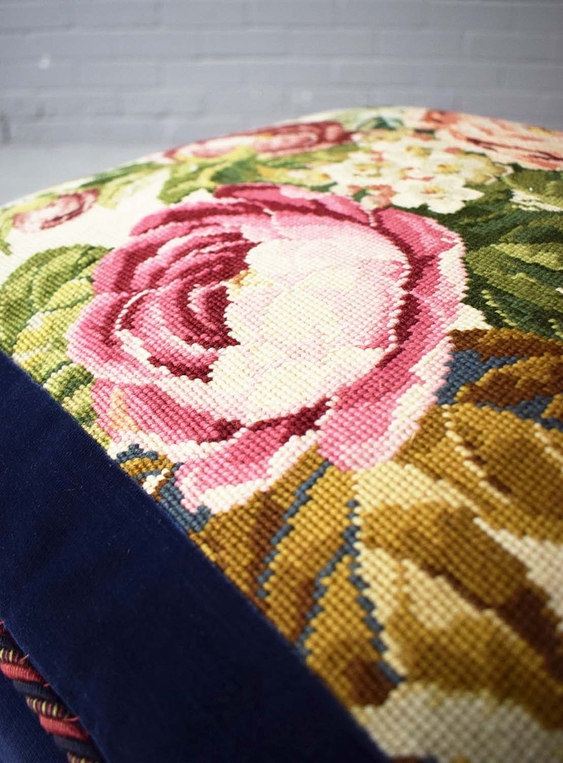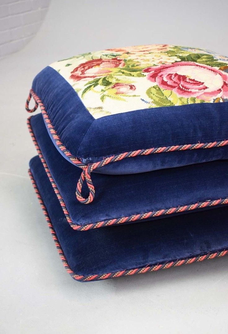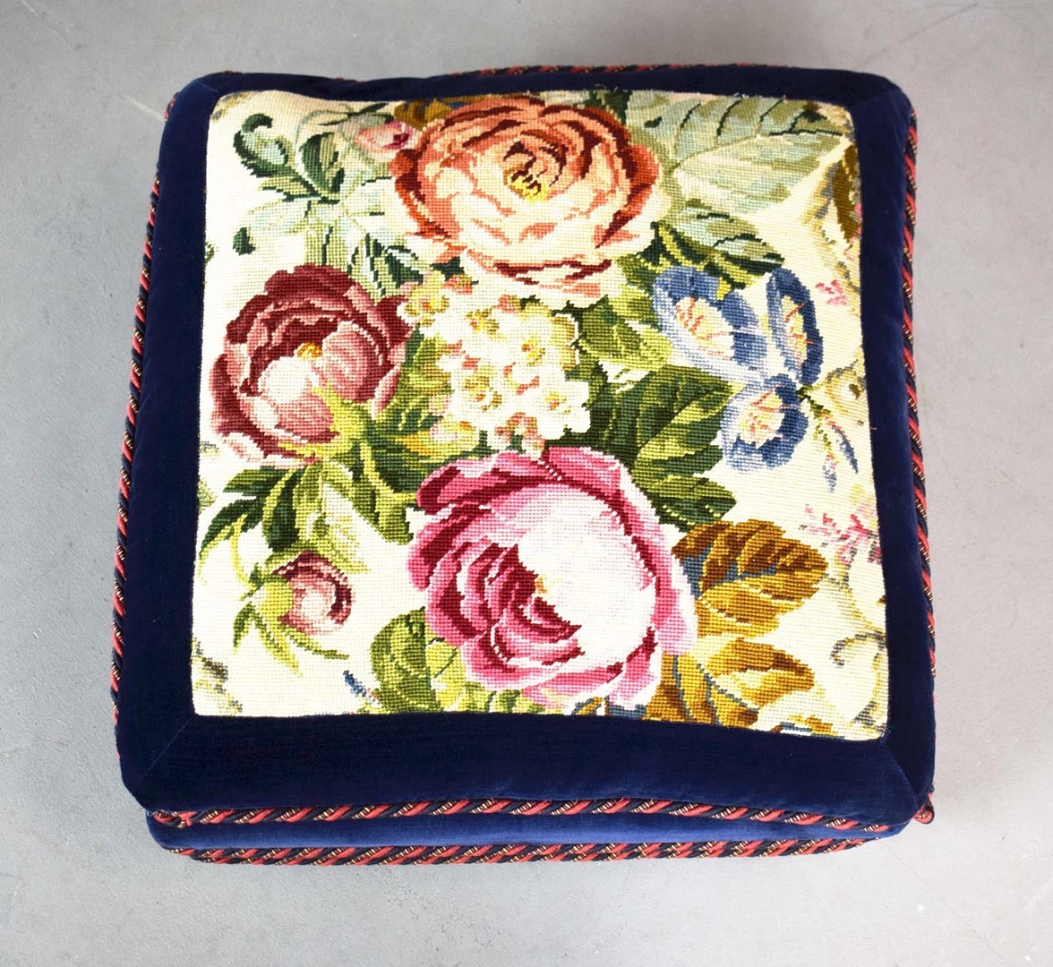 NEEDLEWORK AND BLUE VELVET POUFFE. in the form of stacked cushions on castors, 41cm H 58cm W x 58cm D.