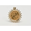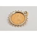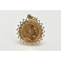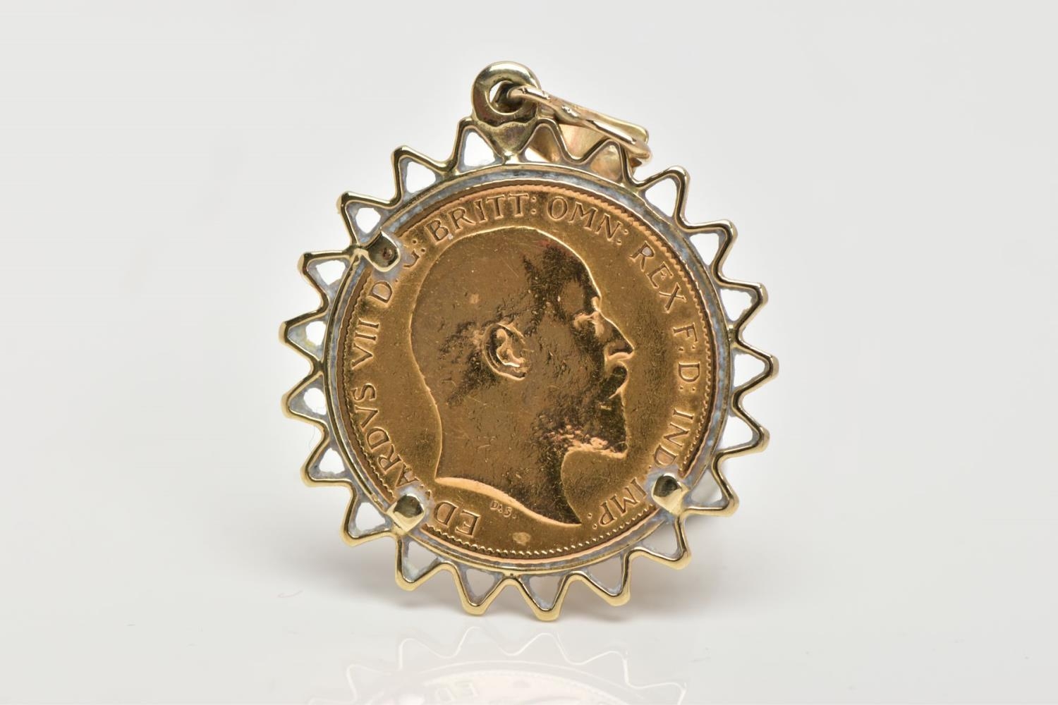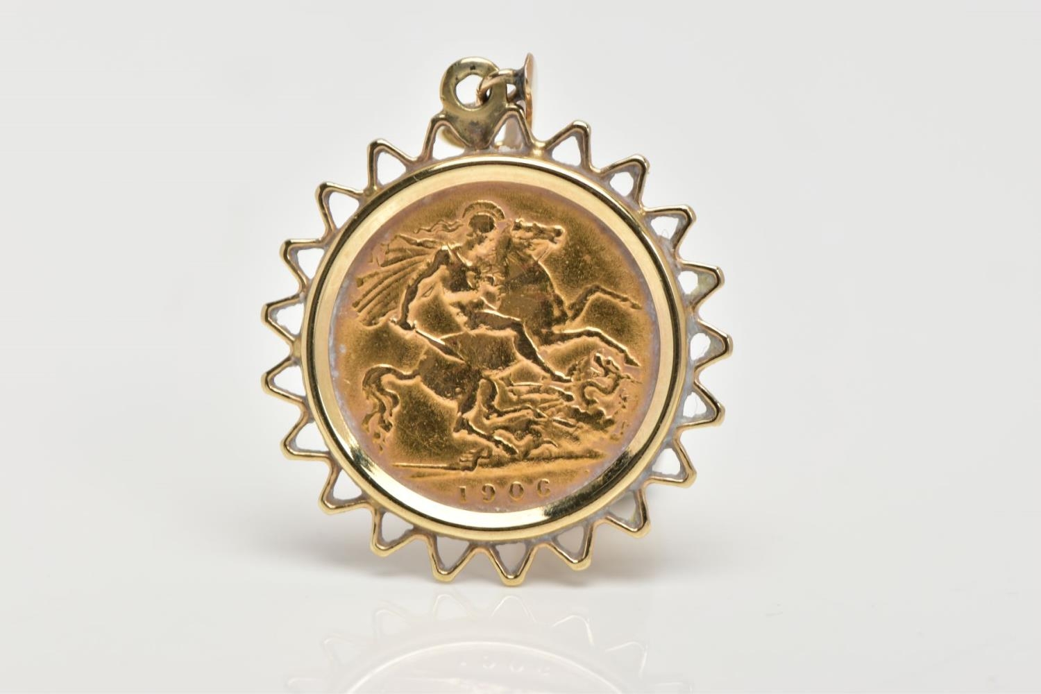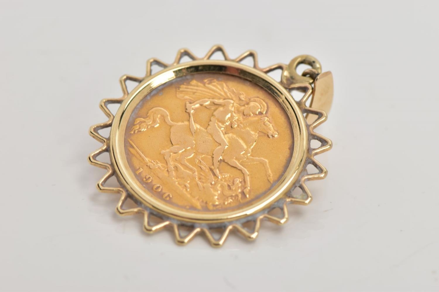 A MOUNTED HALF SOVEREIGN PENDANT, half sovereign depicting King Edward VII, with George and the dragon to the reverse dated 1906, within a yellow metal zig-zag openwork surround, fitted with a tapered bail (unmarked), approximate gross weight 5.4 grams (condition report: general light wear, would benefit from a gentle clean, overall condition good)