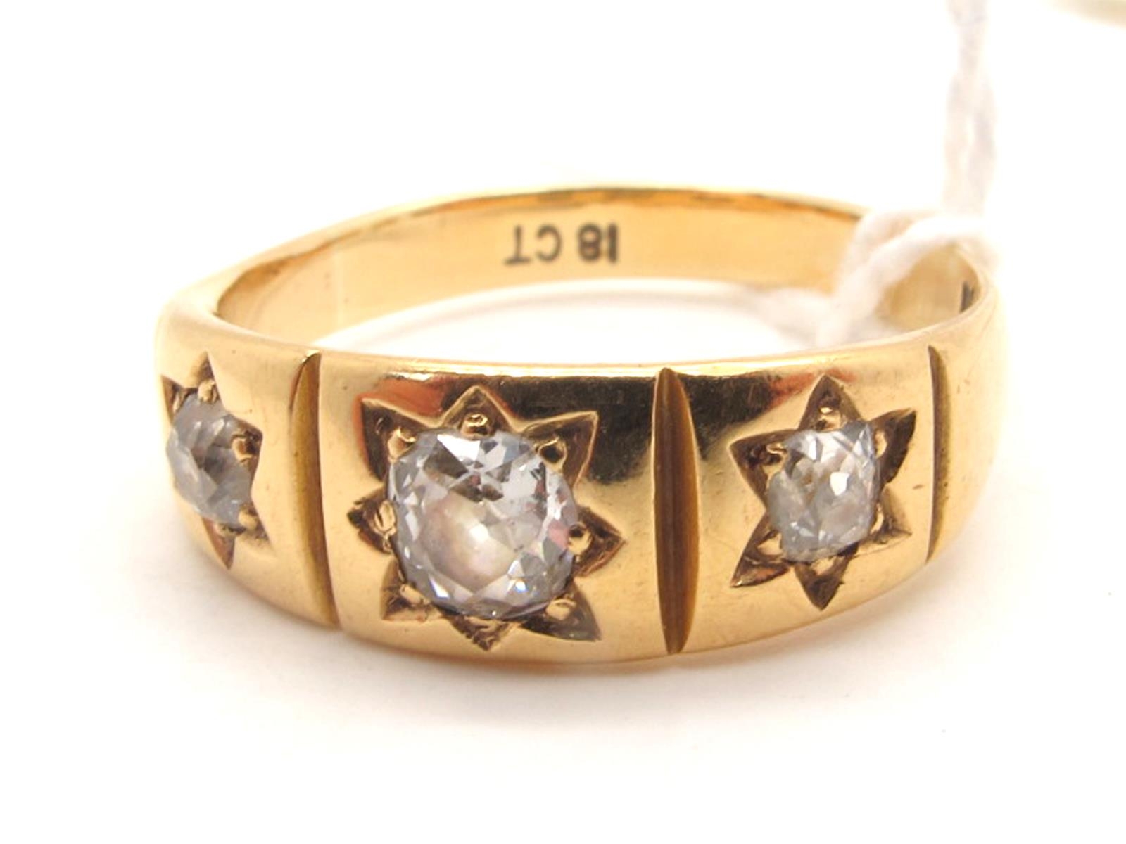 A Large Victorian Style Three Stone Diamond Ring, star set with graduated old cut stones, stamped "18ct" (finger size U).