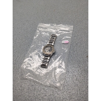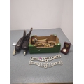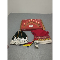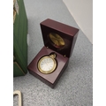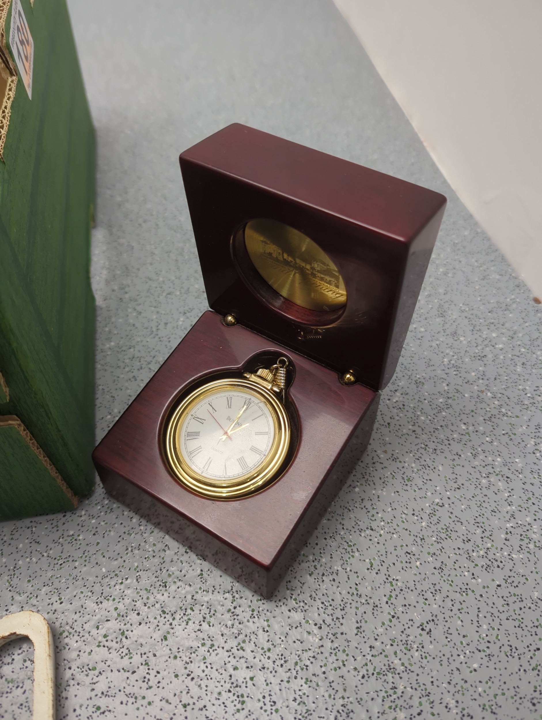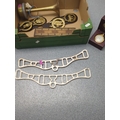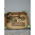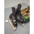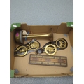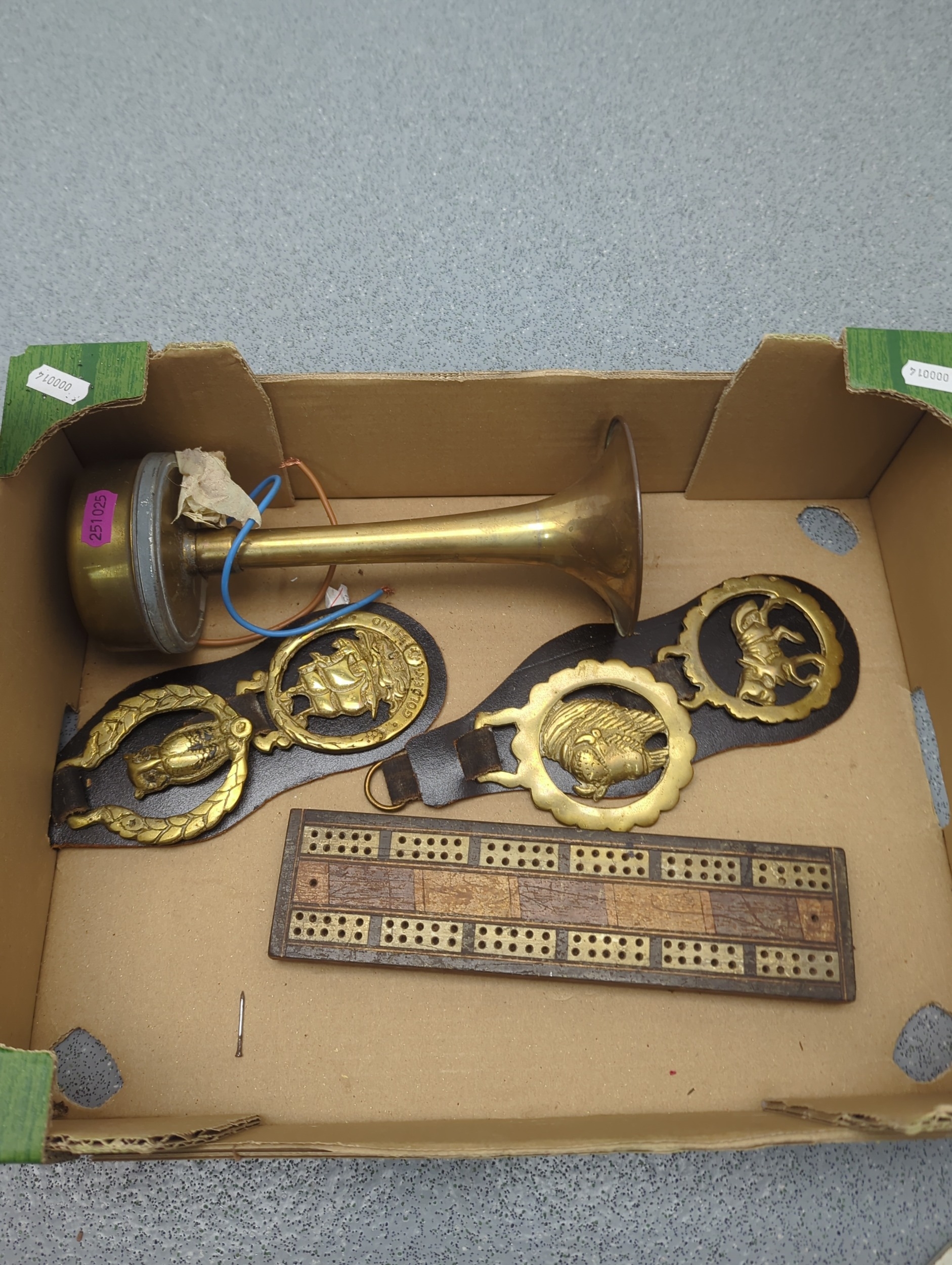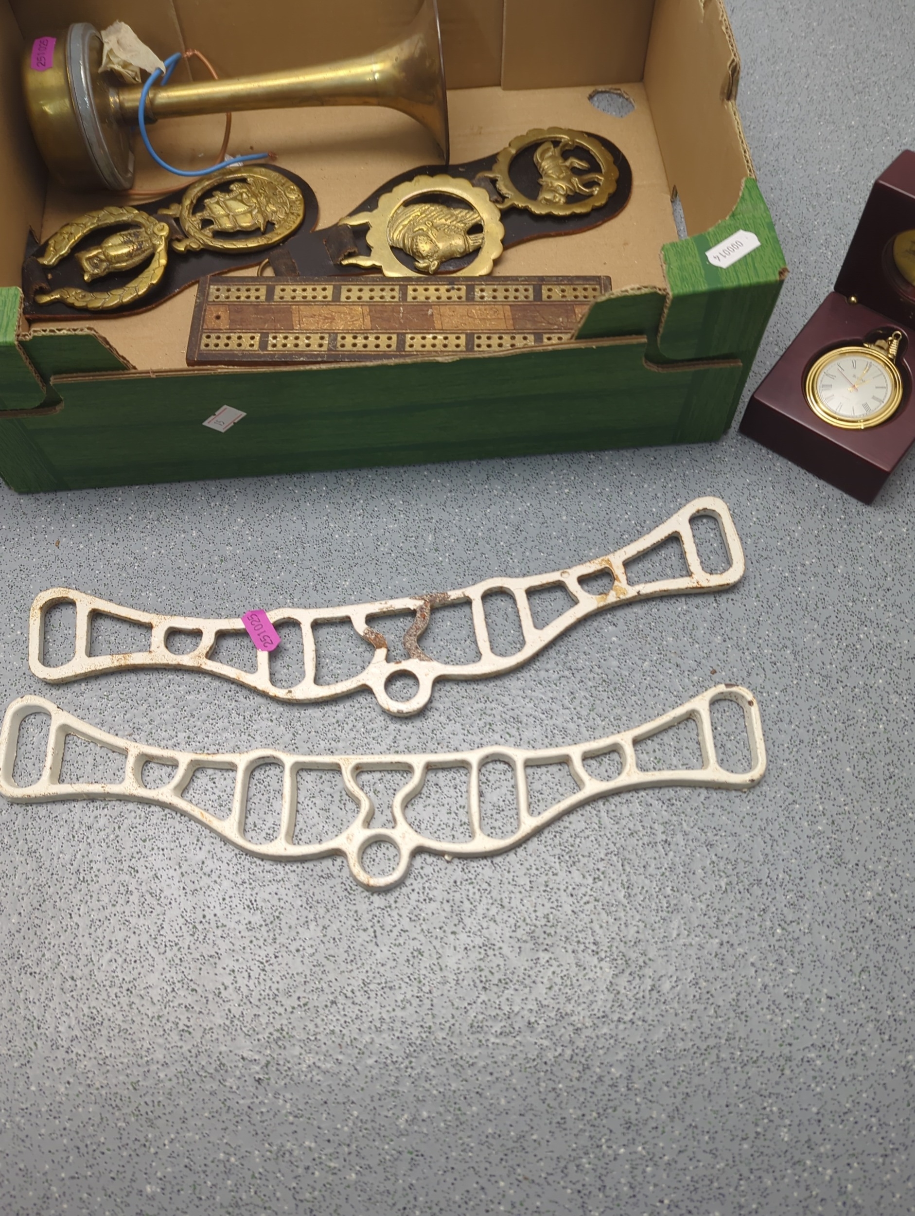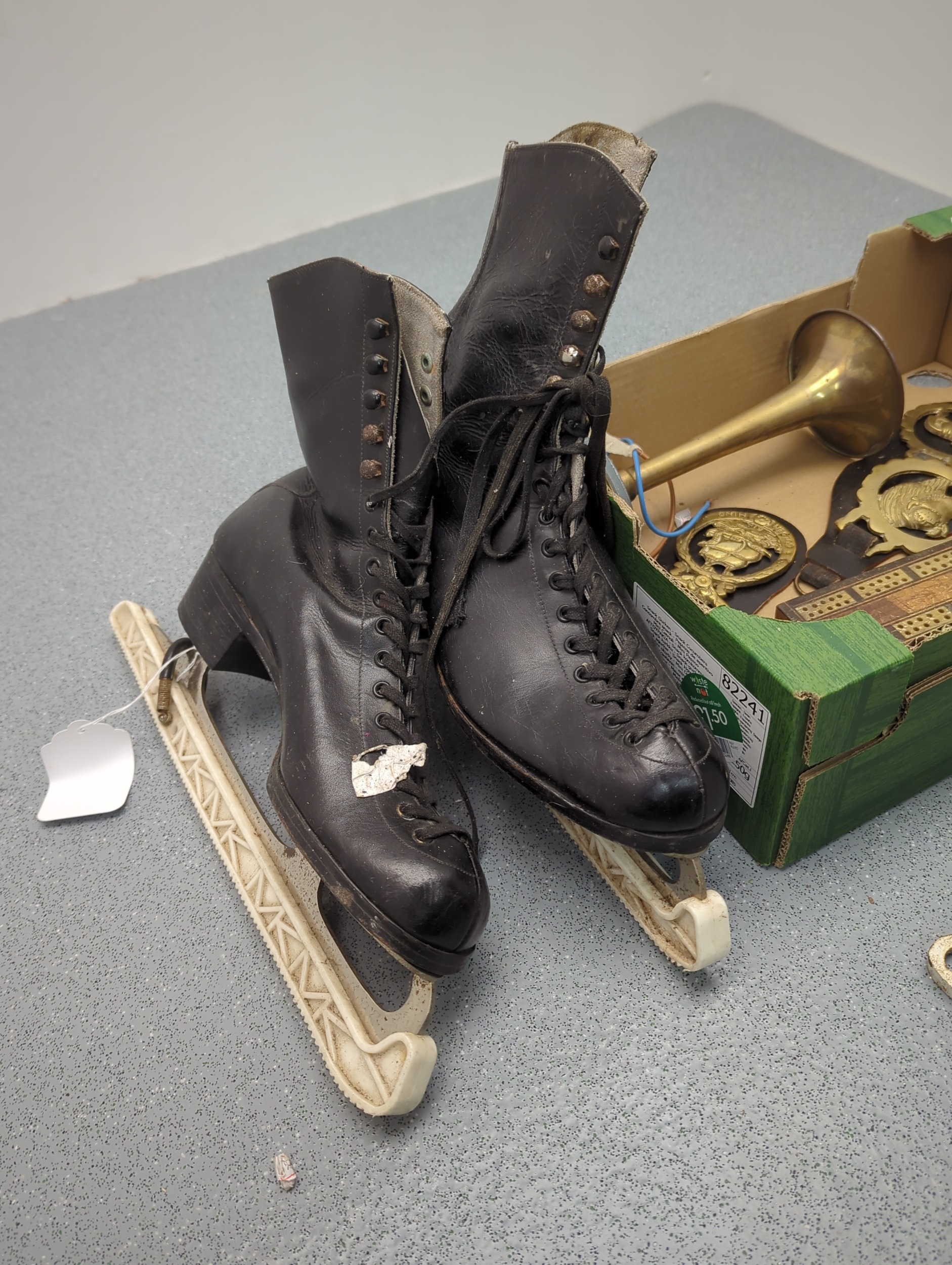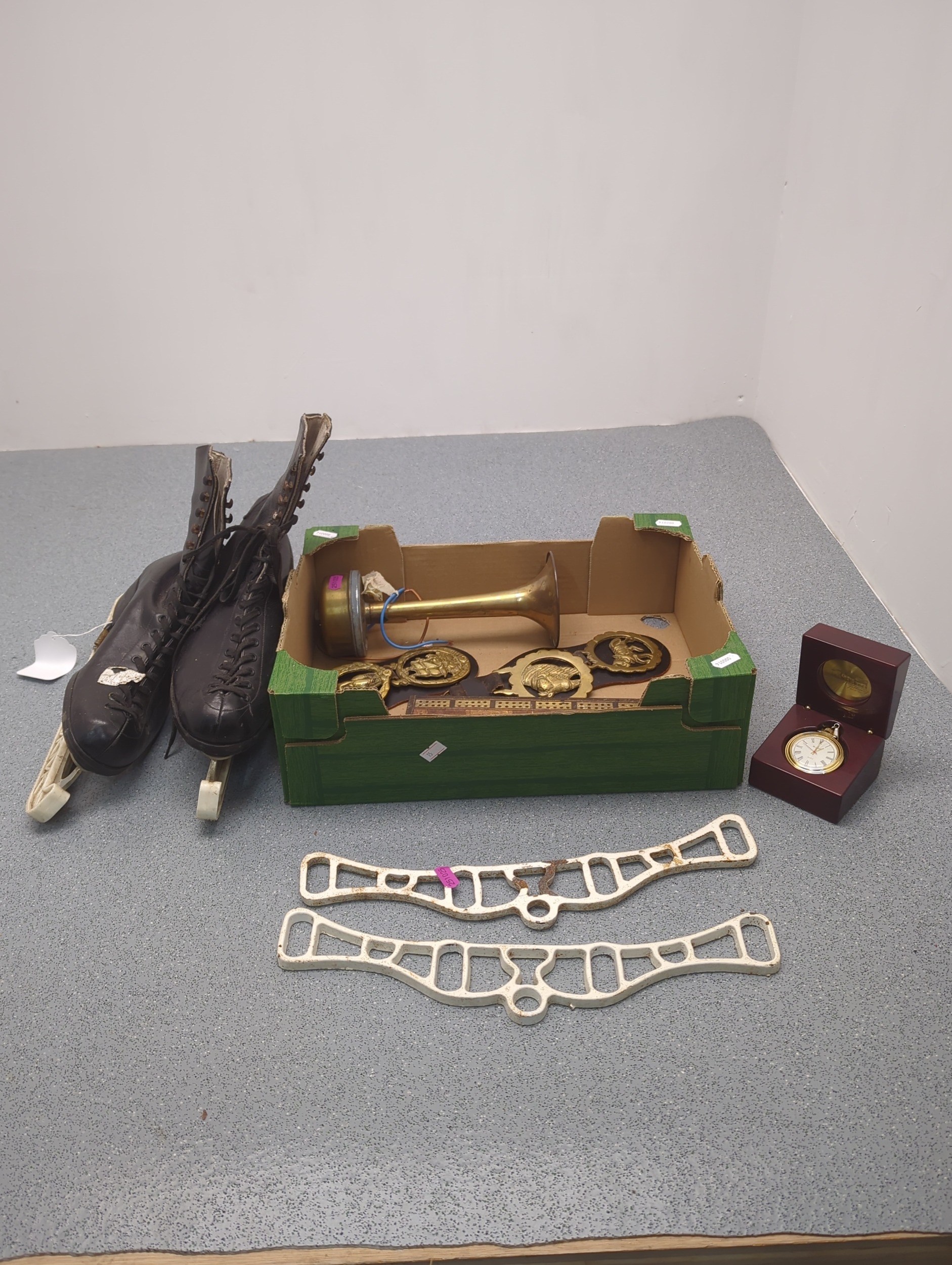 This lot includes a variety of miscellaneous items such as a pair of vintage-style leather ice skates with metal blades, a brass horn, and decorative emblems. Also included is a boxed pocket watch with a white dial and Roman numerals. The items come in a green storage box with multiple compartments for easy organization.