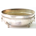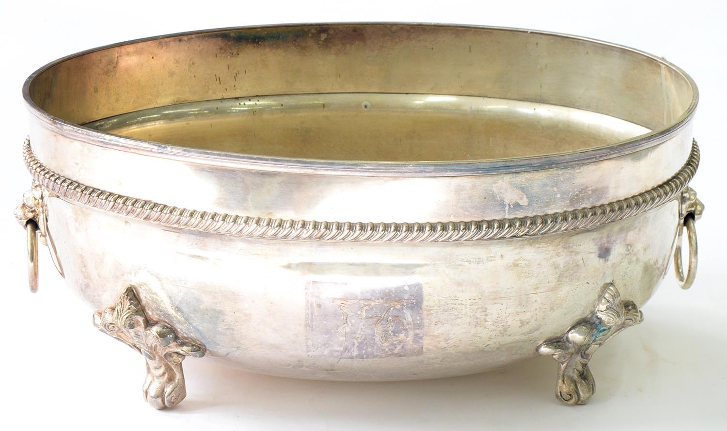 A VICTORIAN EPNS DISH COVER WITH GADROONED RIM, ADAPTED AS A JARDINIERE WITH RING HANDLES ON SCROLL FEET, 47CM L