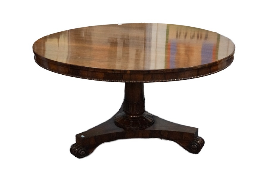 WILLIAM IV CARVED ROSEWOOD PEDESTAL CENTRE TABLE, the circular tilt-top with bobbin and reel moulded border, set above a tapering column with carved collar, and raised on a triform base with scroll feet and brass castors, 29” (73.7cm) high, 51” (129.5cm) diameter