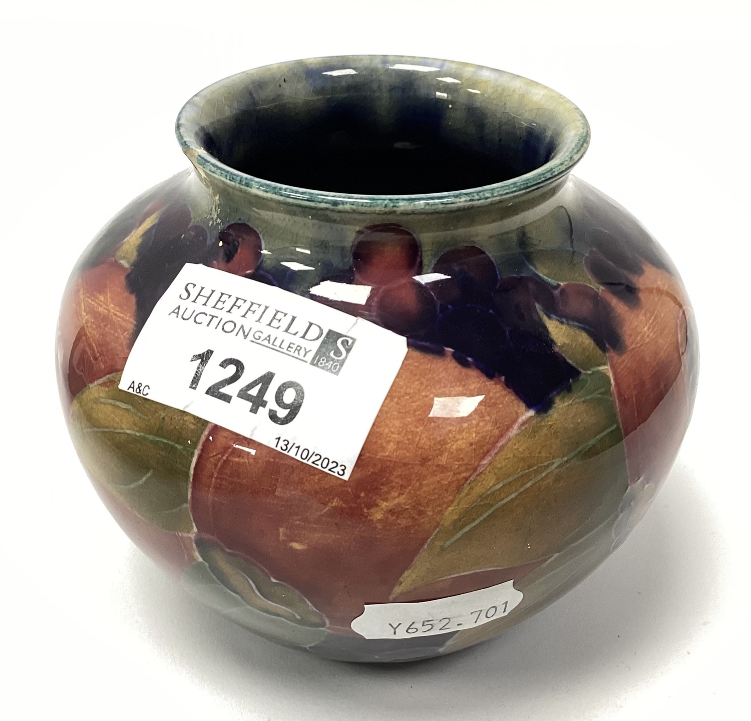 Moorcroft 'Pomegranate' Pattern Bulbous Shaped Vase, signed W. Moorcroft and stamped Moorcroft Burslem, England, under base (rim chip) 9cm high.