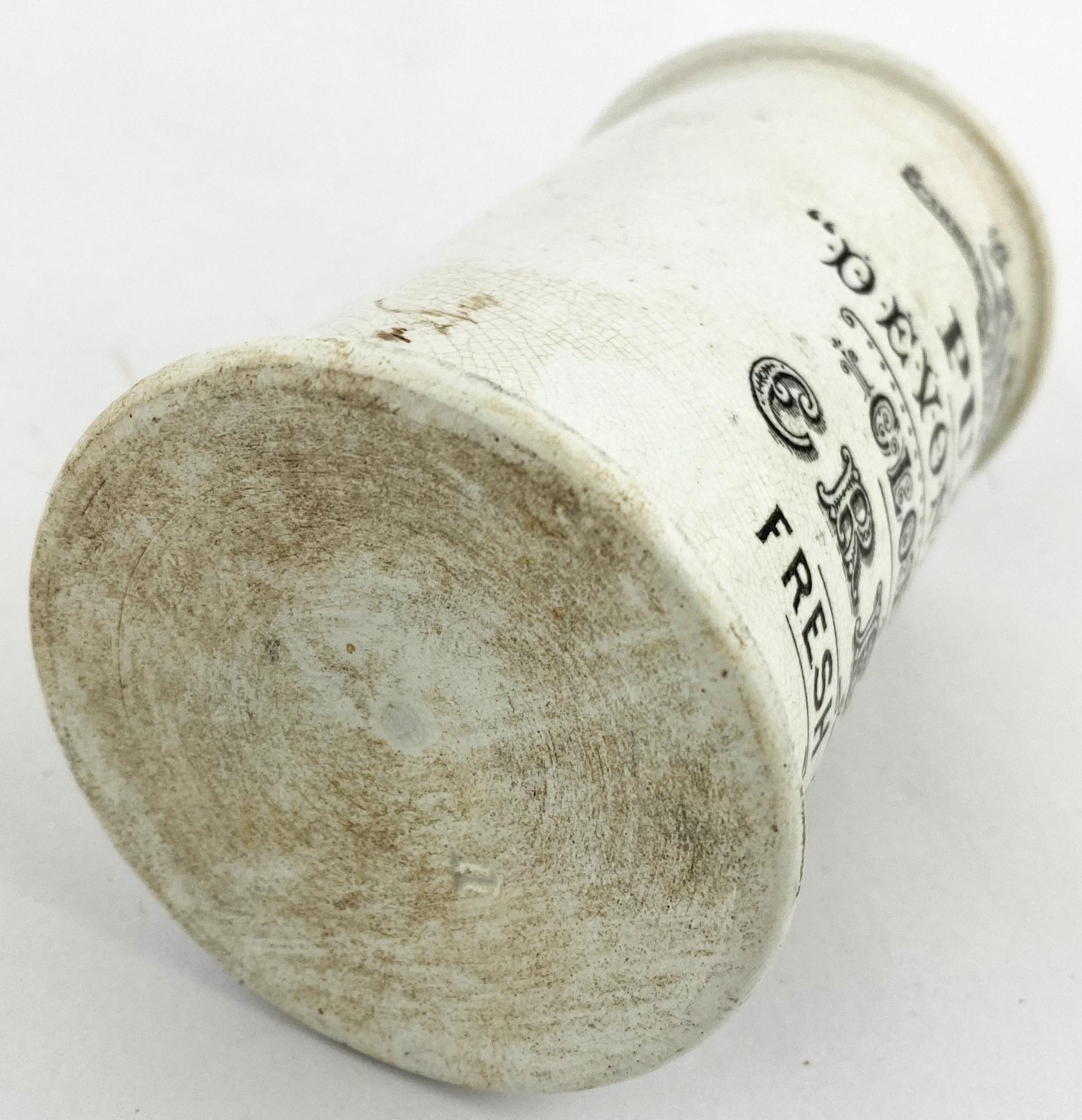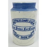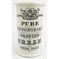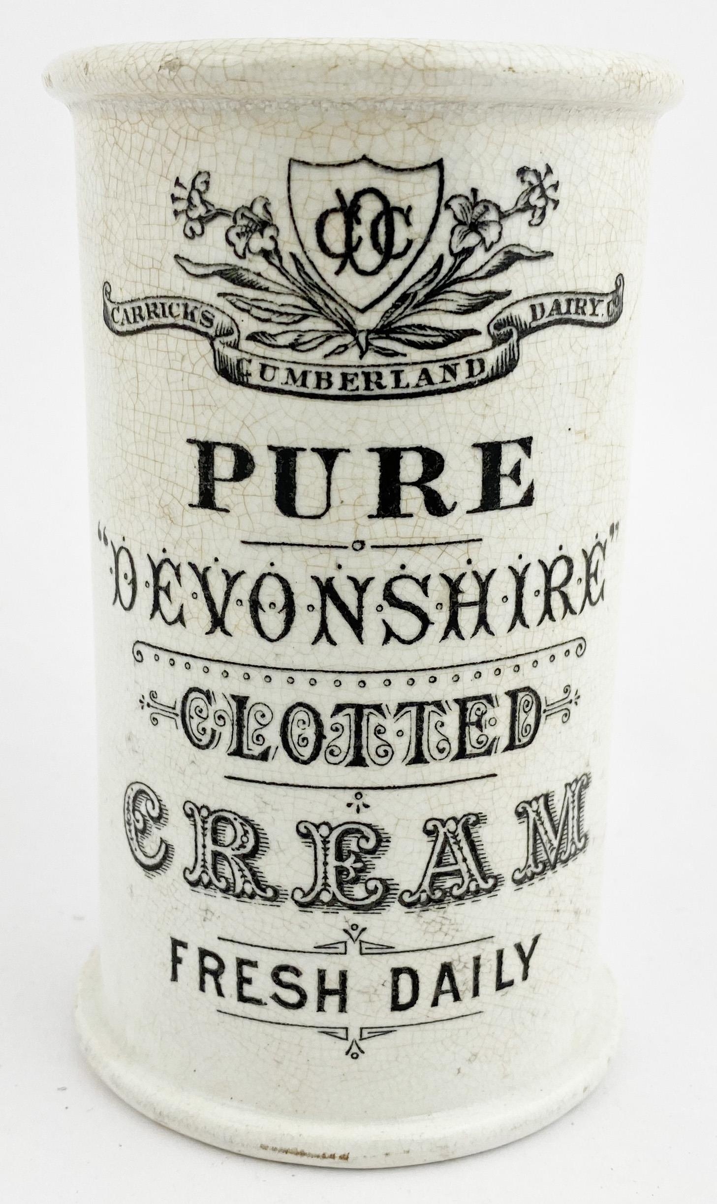 CARRICKS CUMBERLAND DAIRY CYLINDER CREAM POT. 4.7ins tall. Tall white bodied cylinder cream with a very busy transfer from the North West - entwined initials within ornate banner design to top, & five varied fonts of writing below. Rim mark & some general wear, overall very good. A rare pot!