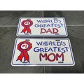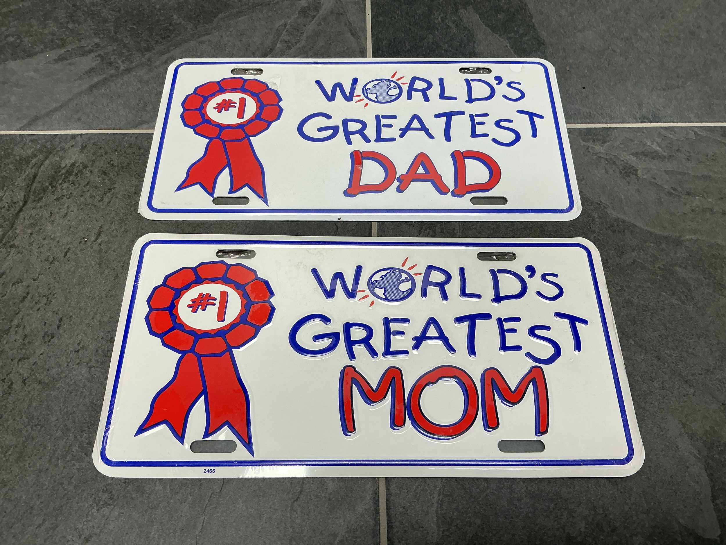 Two Tinplate Signs 'World's Greatest Mom/Dad', Approx 15cm x 30cm