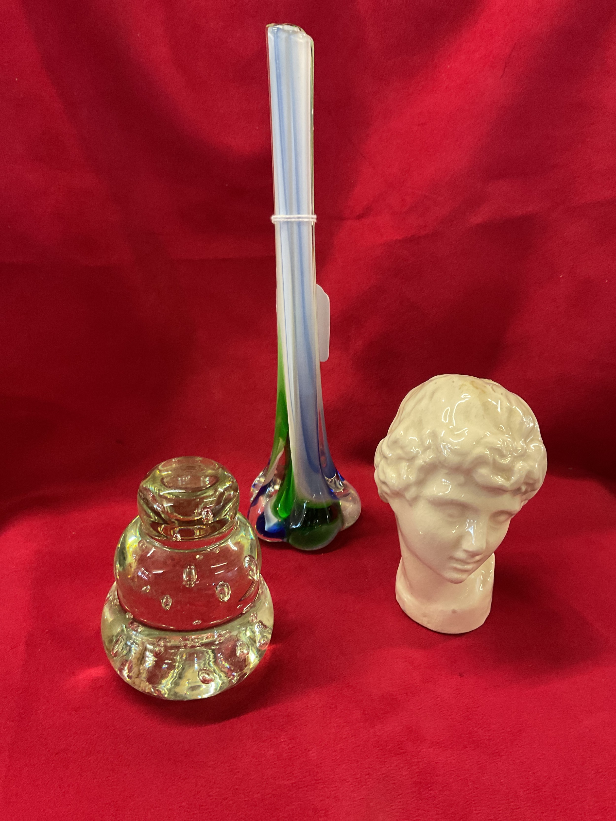 A Murano style bud vase together with a glass paperweight with bubble inclusions and a Gordon Cooke pottery bust