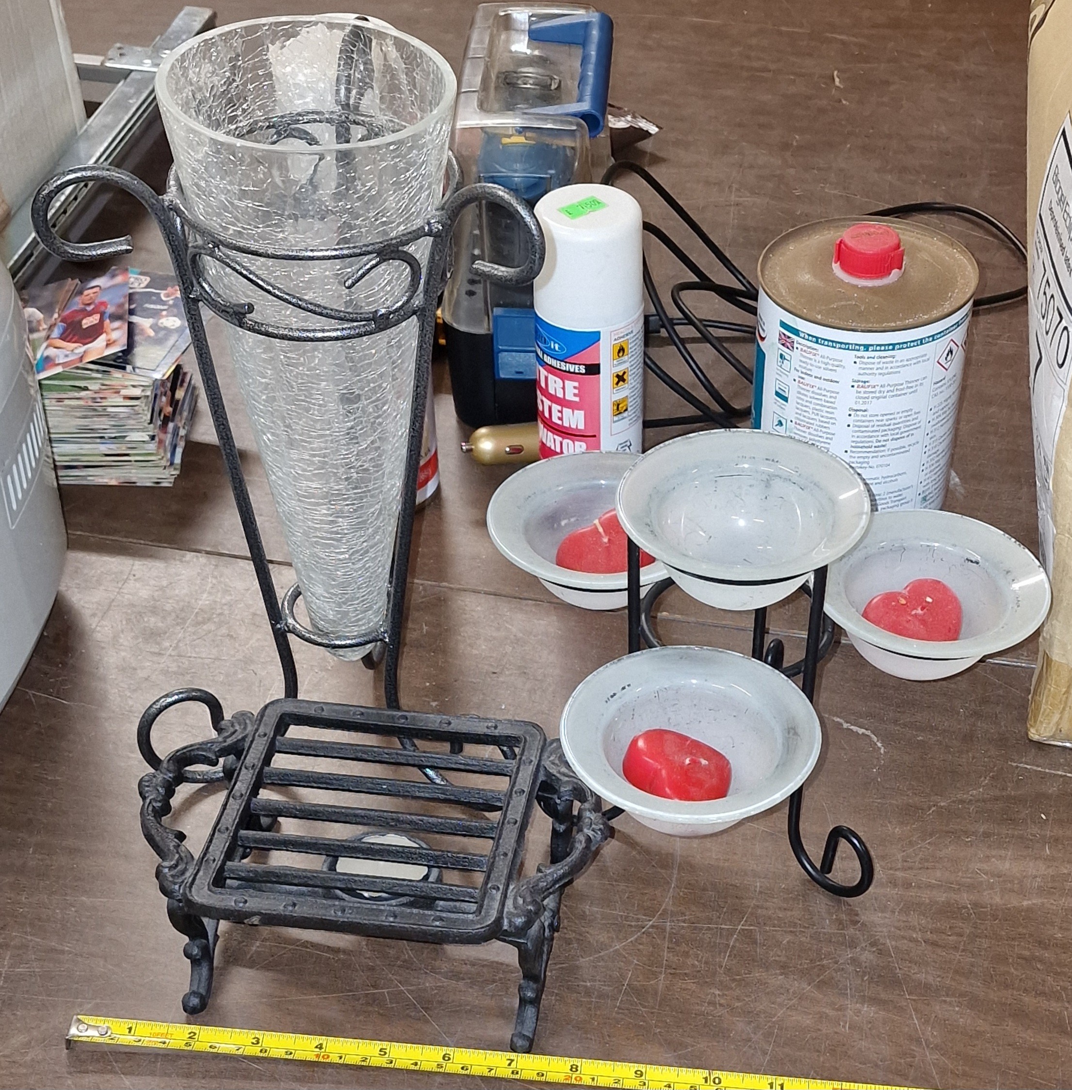 Cracked glass effect vase on metal stand, glass and metal tealight tree & cast tealight warmer