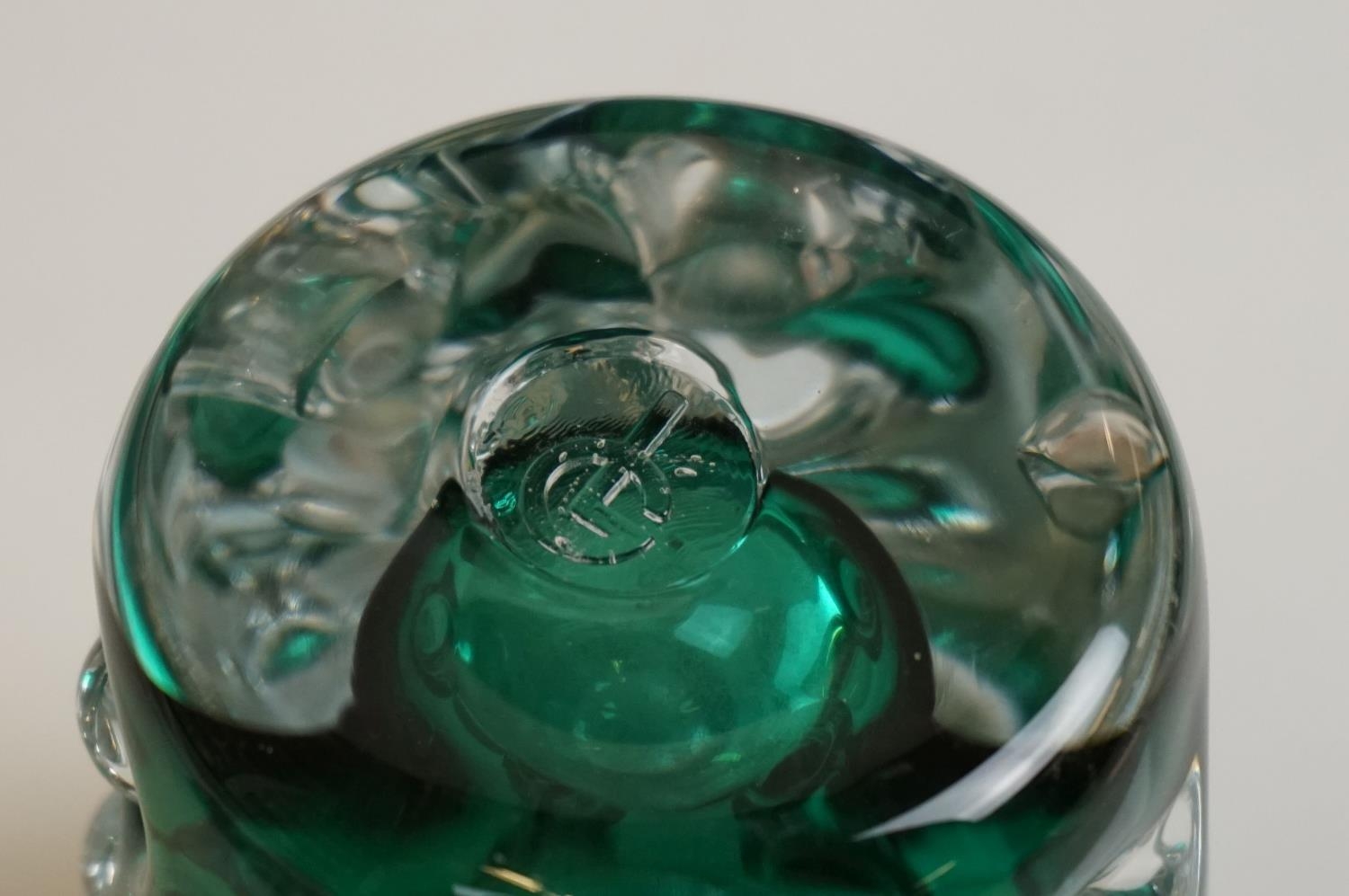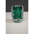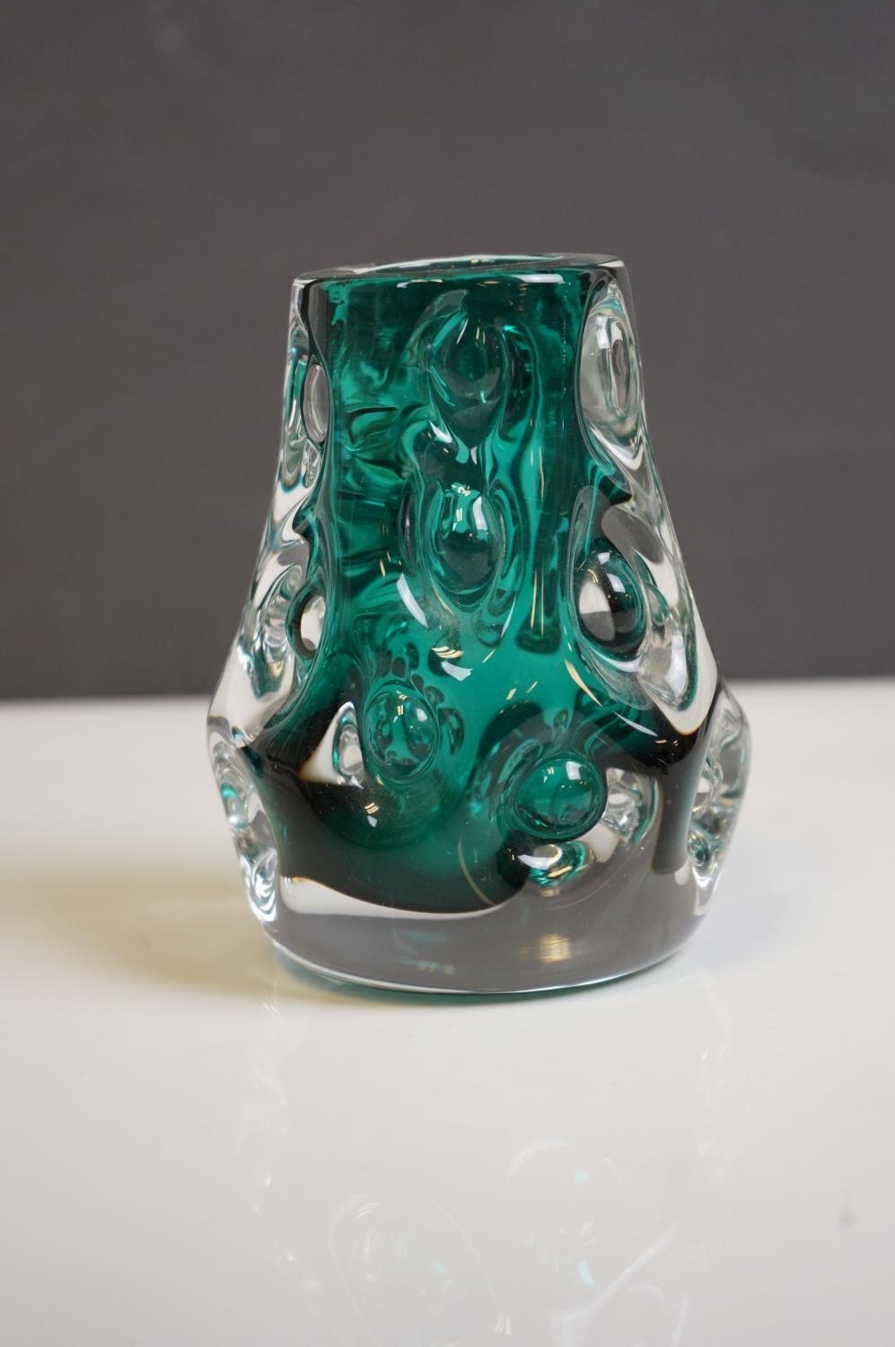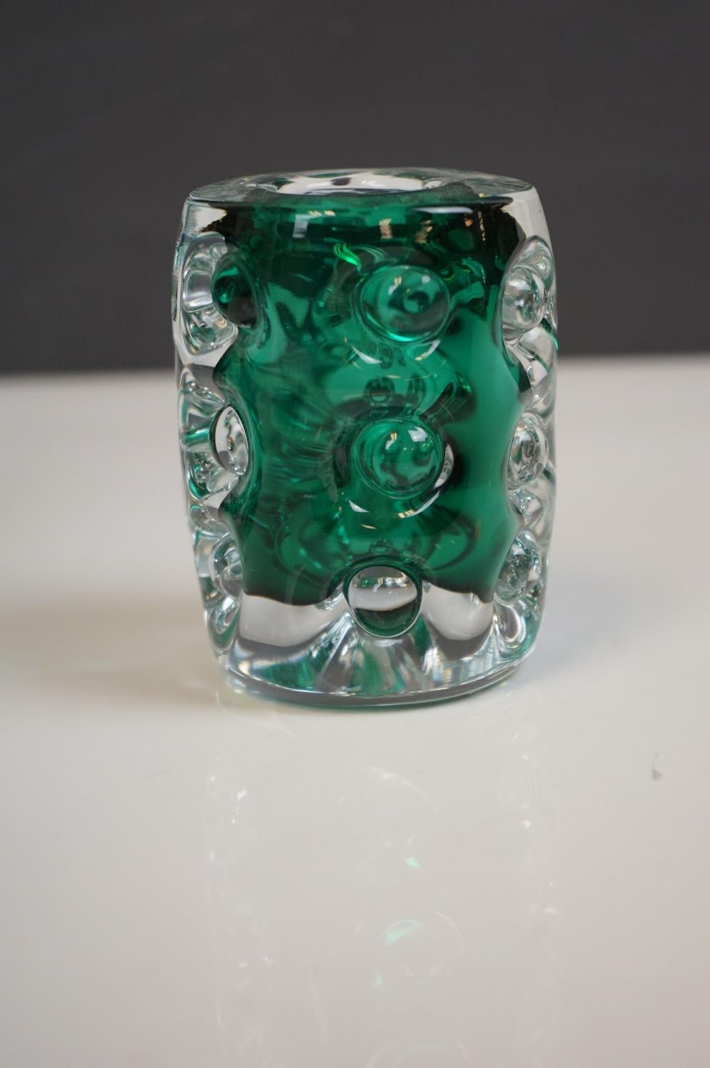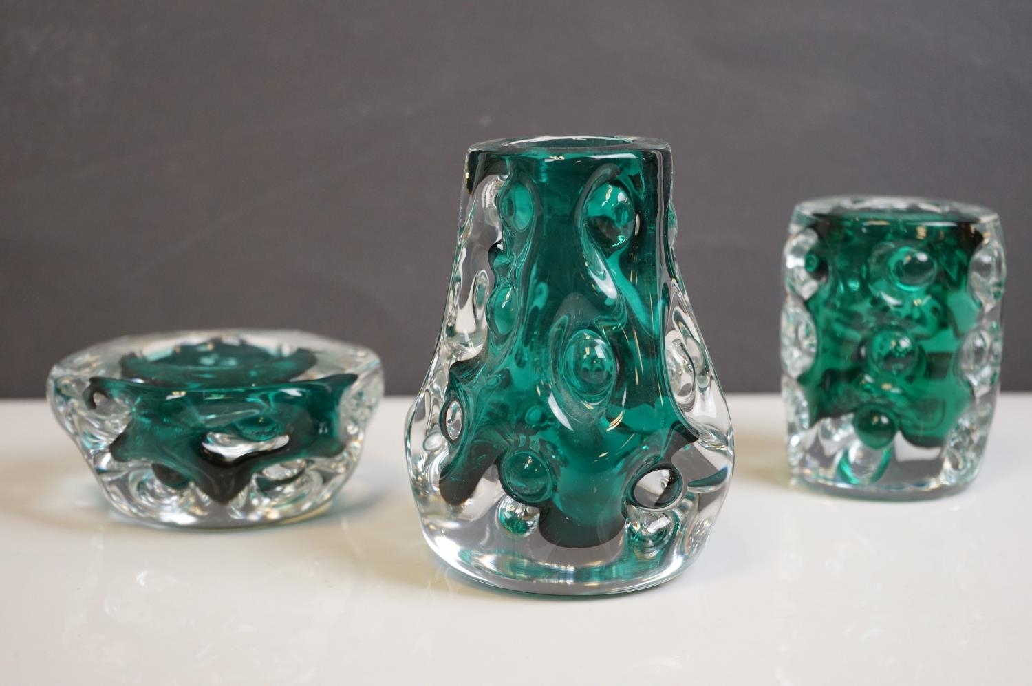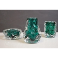 Three Liskeard Green Knobbly Glass Items including Two Vases and a Bowl, marked LG to base, largest 14cms high