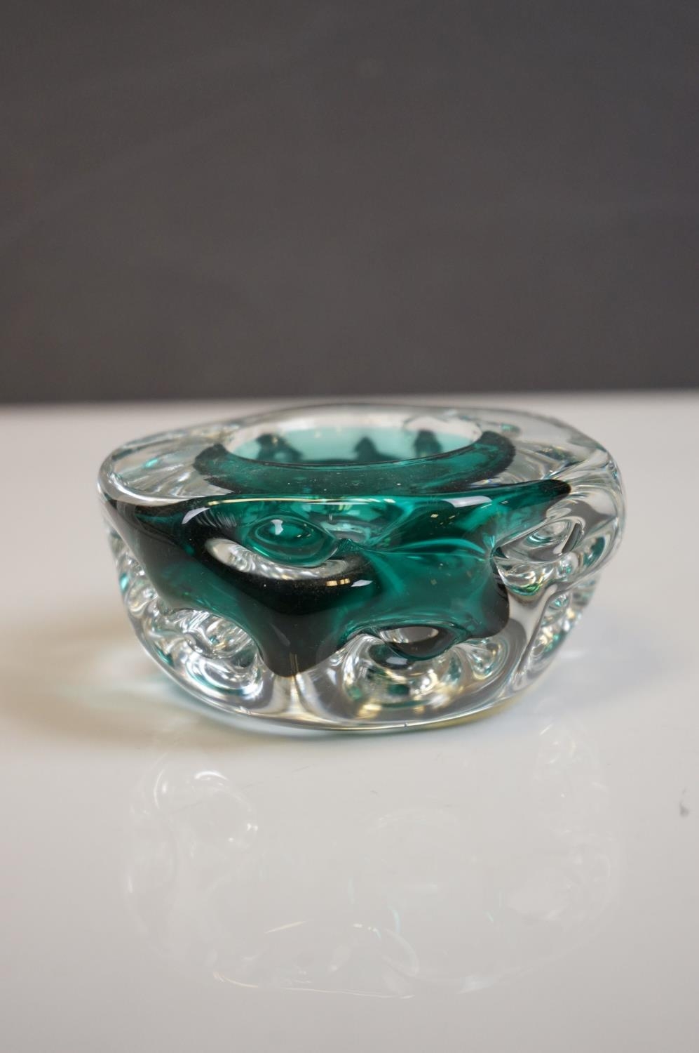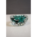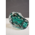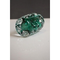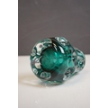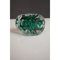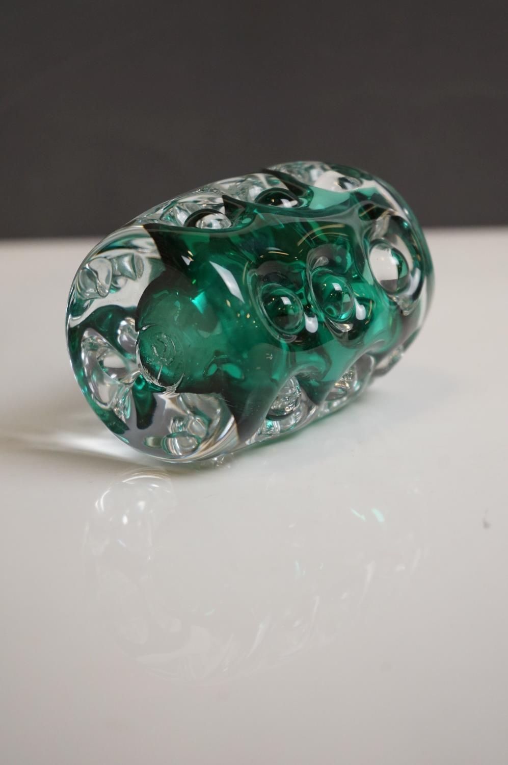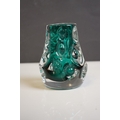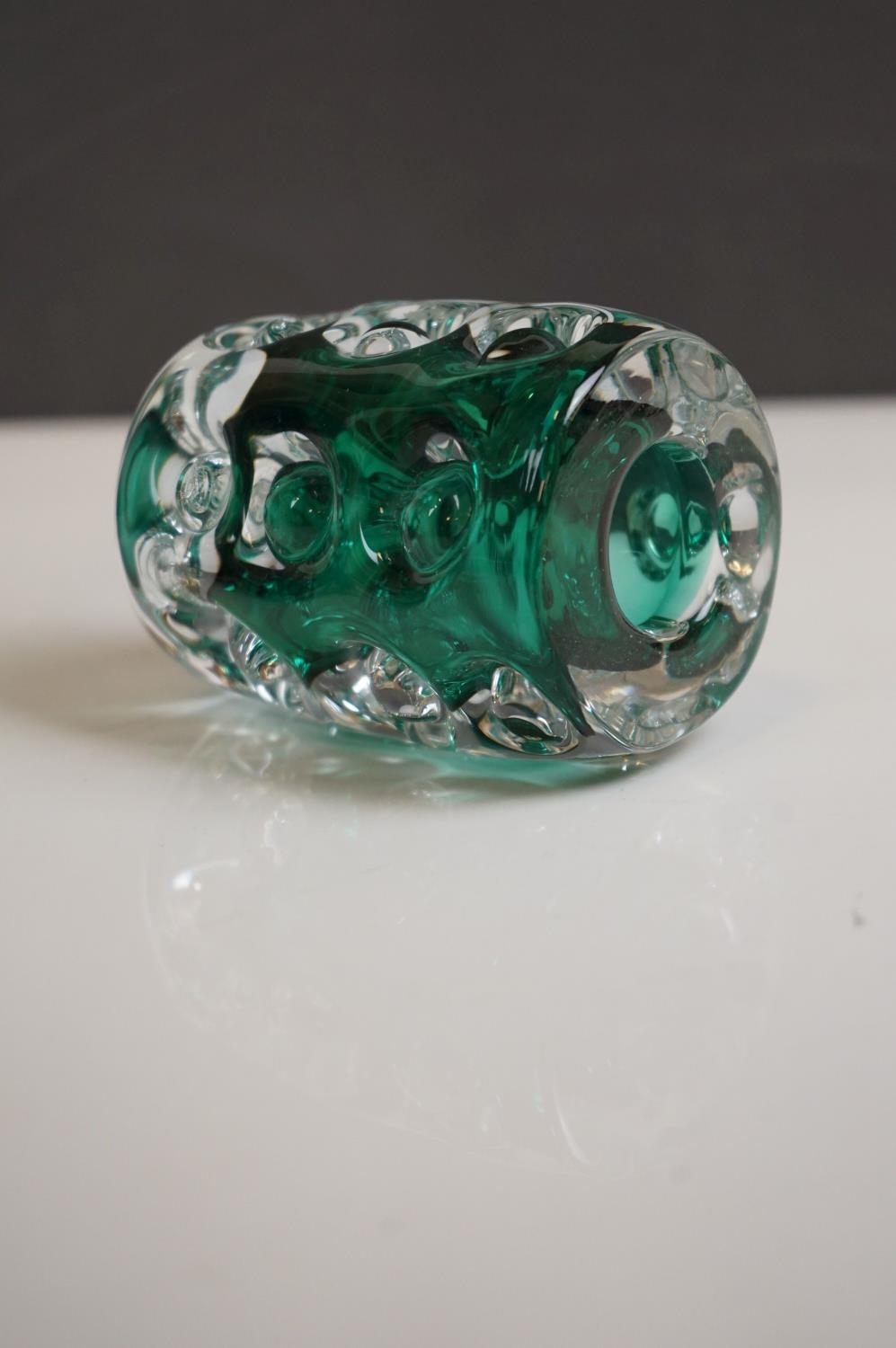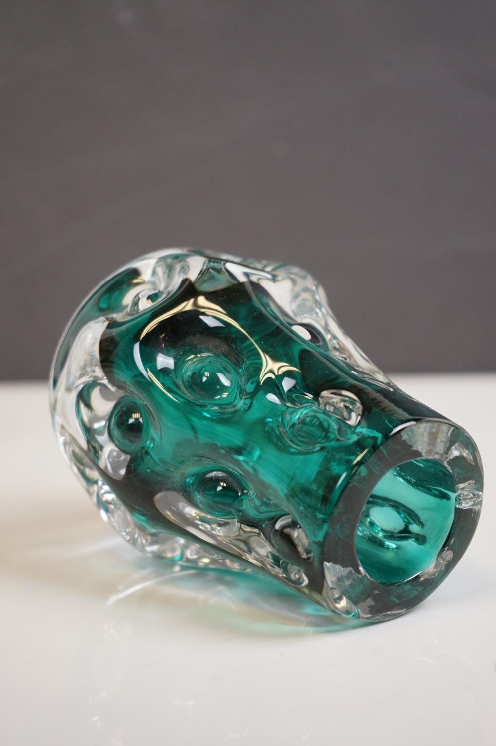 Three Liskeard Green Knobbly Glass Items including Two Vases and a Bowl, marked LG to base, largest 14cms high