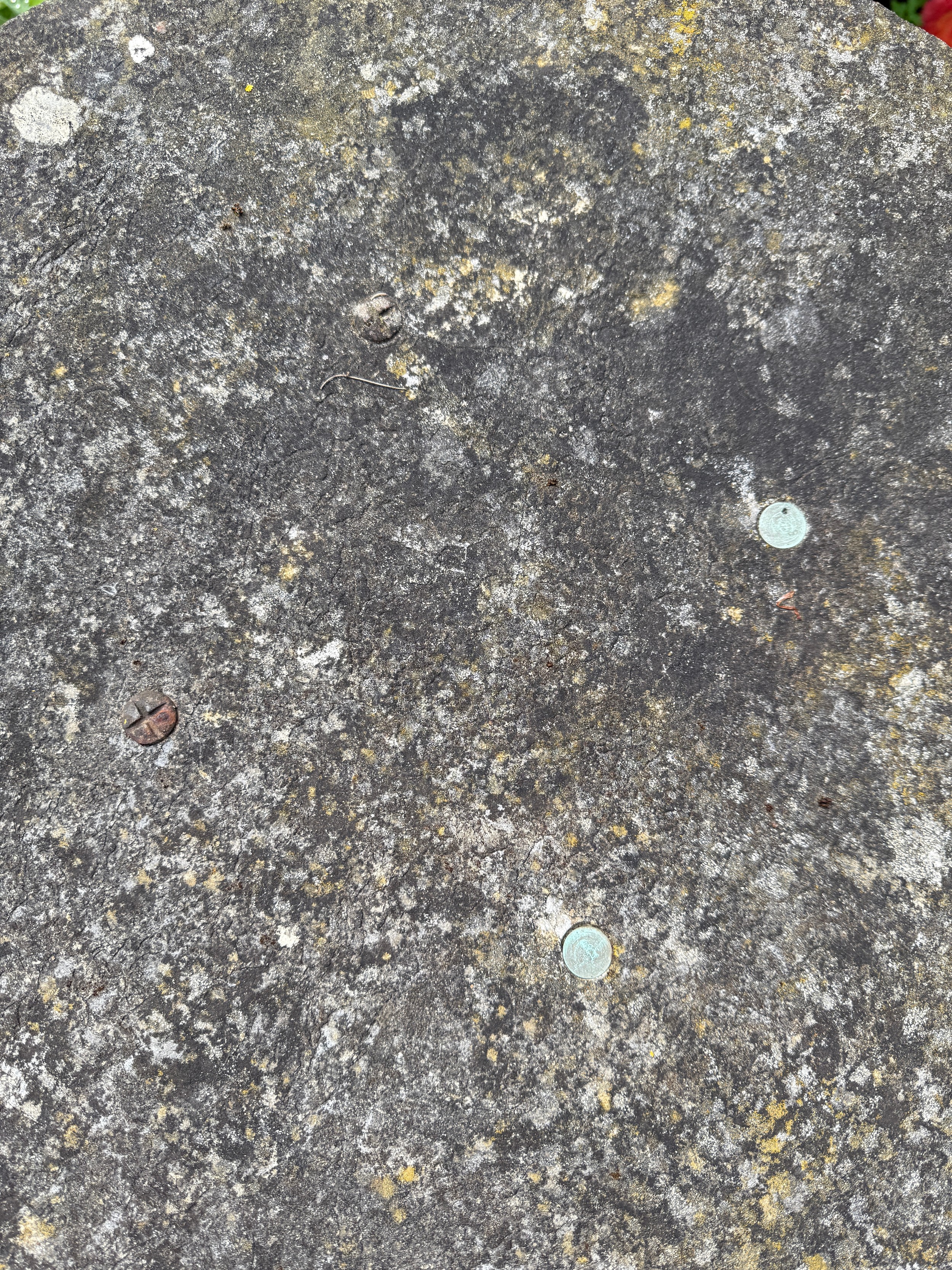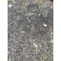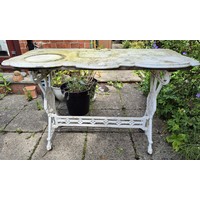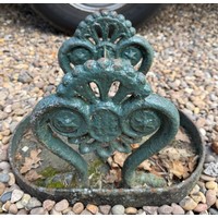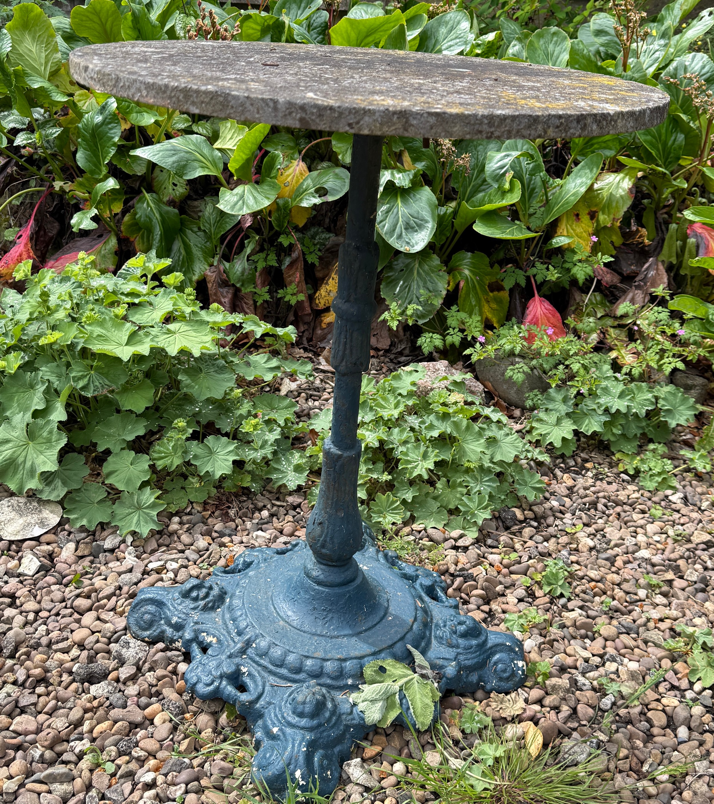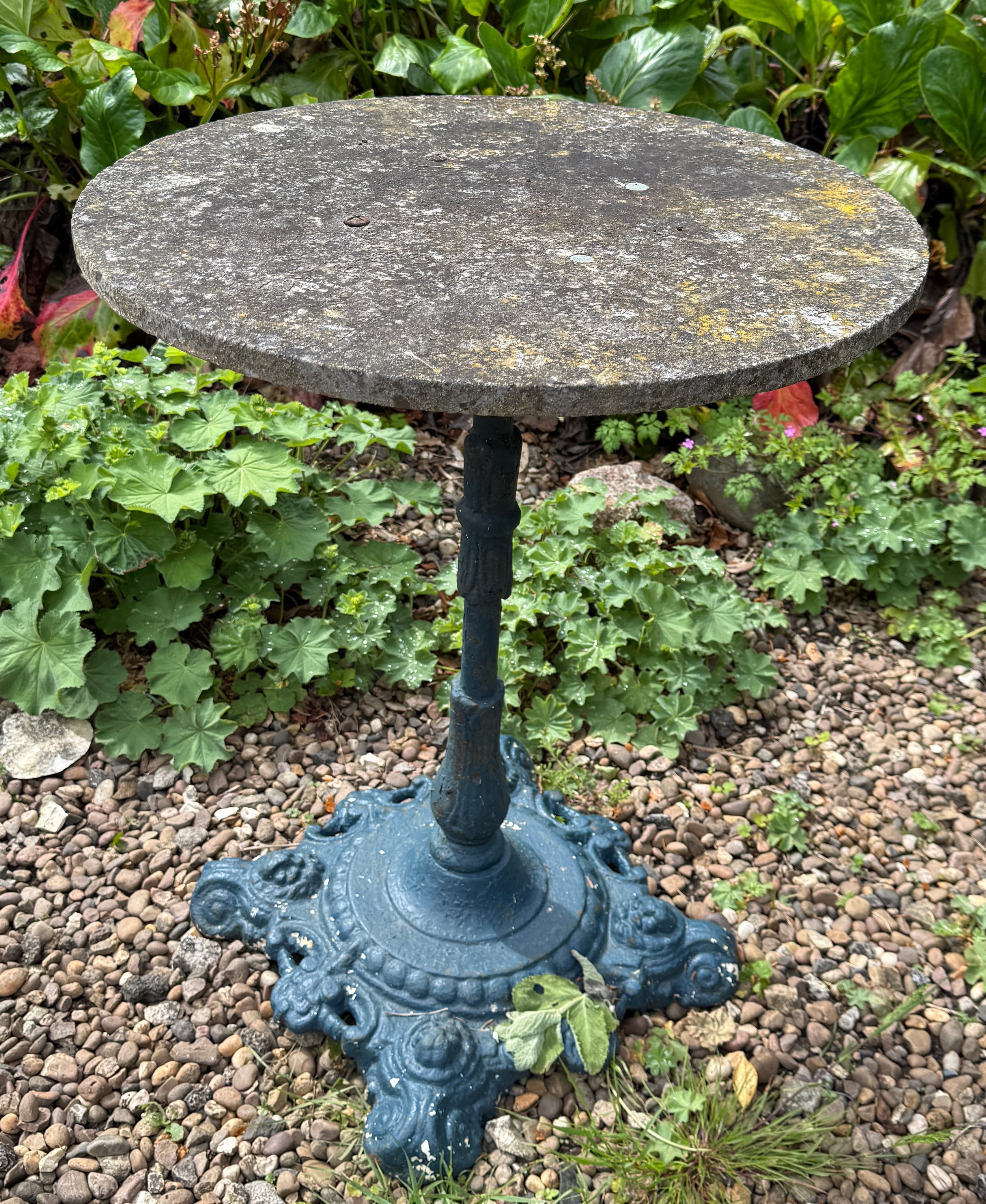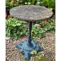 A pedestal garden table with circular concrete top on cast iron base. 77cm h x 61cm d.