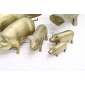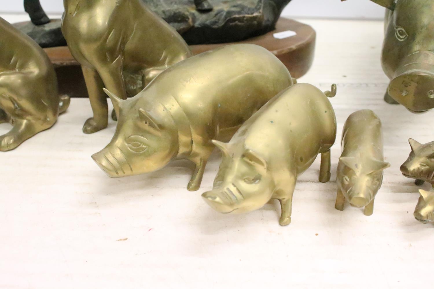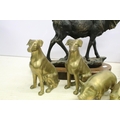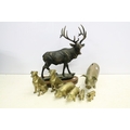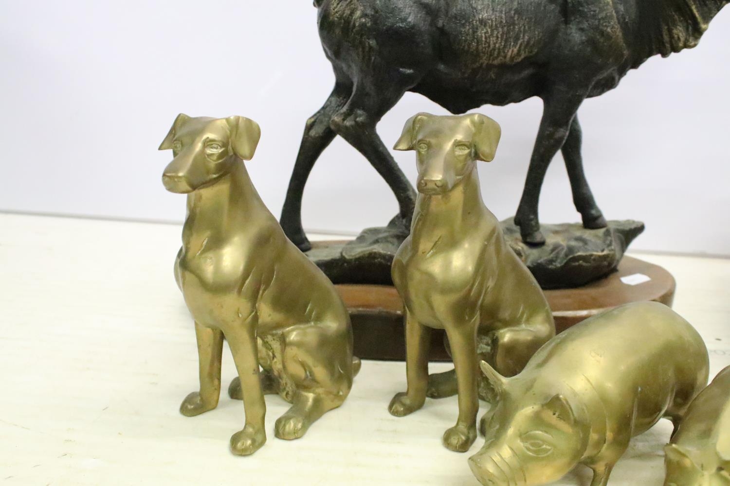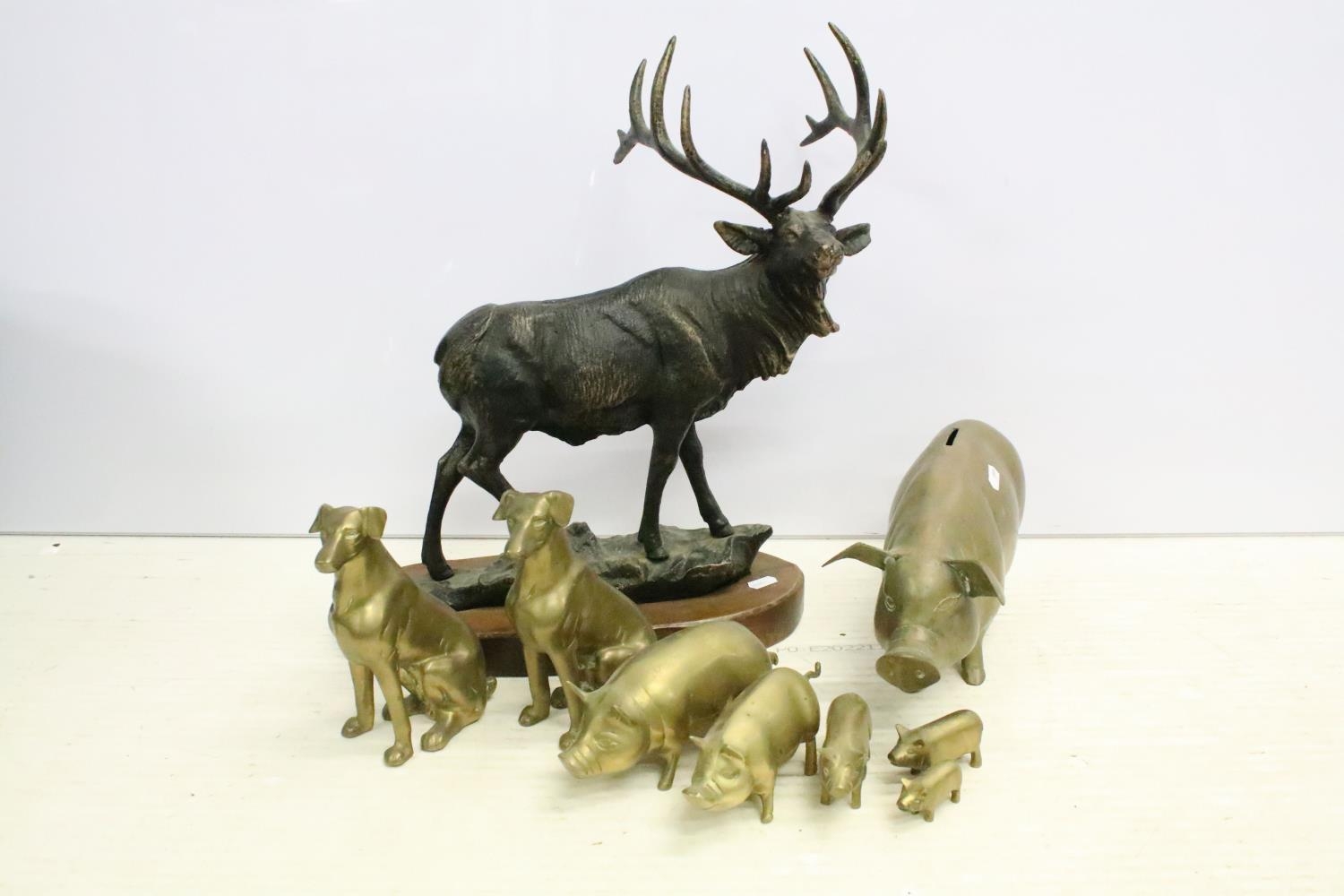 Cast metal model of a stag mounted on a wooden base (approx 45cm high), together with a group of brass pigs of varying size, and a pair of brass seated dogs