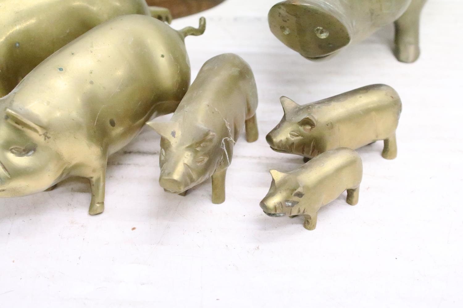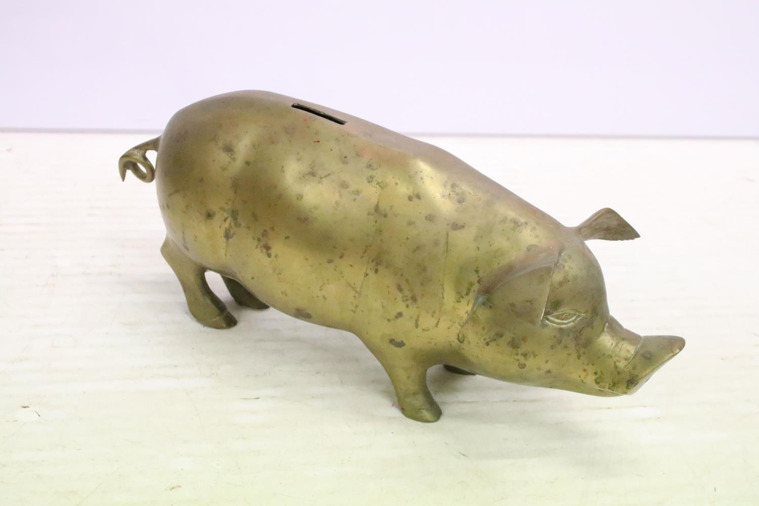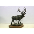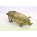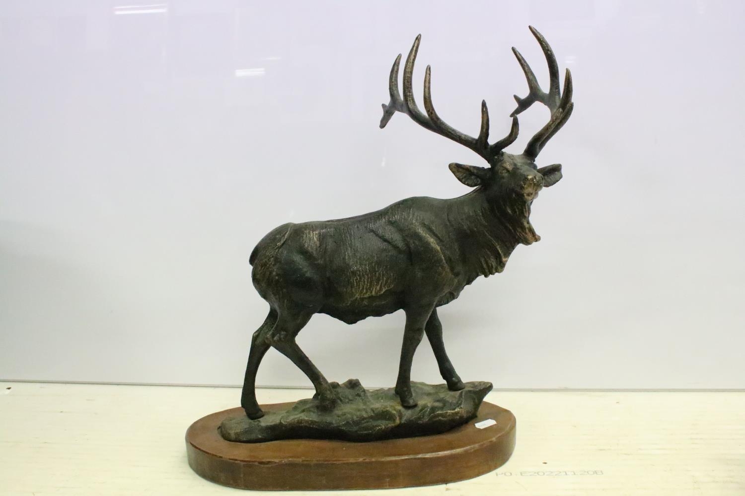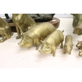 Cast metal model of a stag mounted on a wooden base (approx 45cm high), together with a group of brass pigs of varying size, and a pair of brass seated dogs