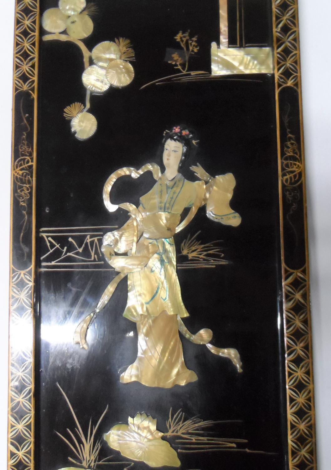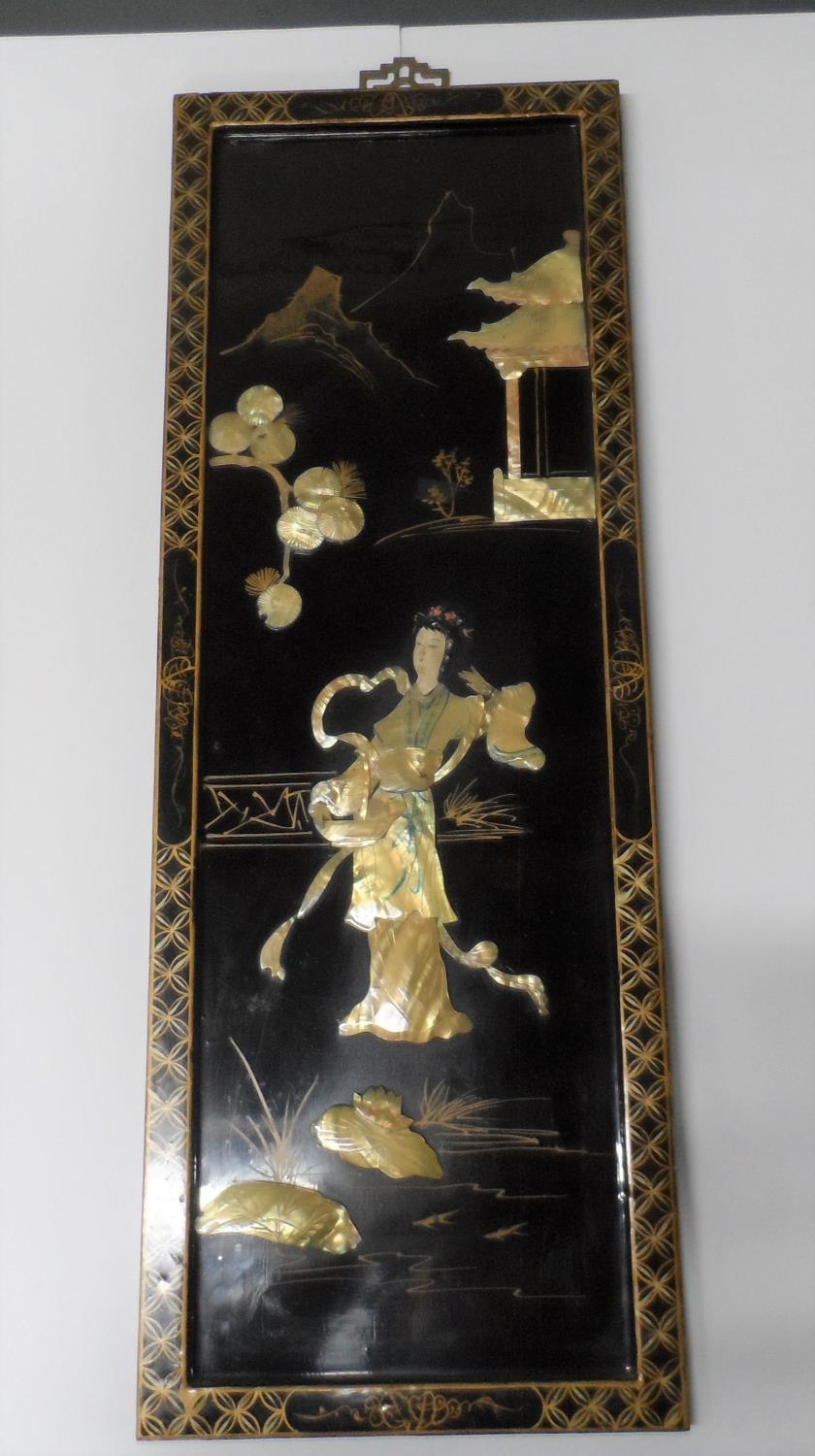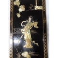 Chinese lacquered & decorated panel, inlaid with mother of pearl,