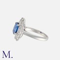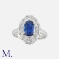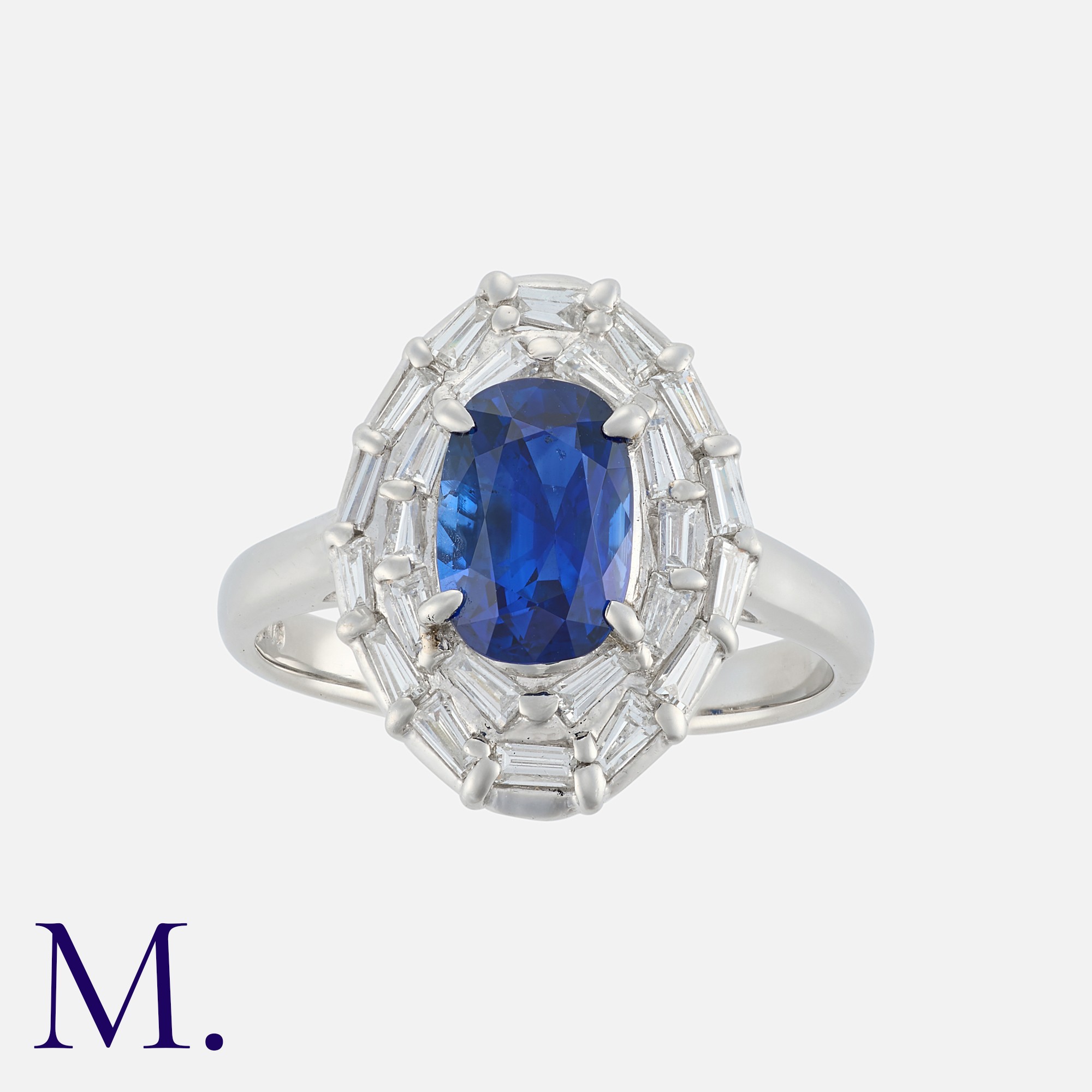 A Sapphire and Diamond Ring in platinum, set with an oval cut sapphire of approximately 1.73 carats, within a border of tapered baguette cut diamonds totalling approximately 0.57 carats. Marked pt900 D0.57 1.739.