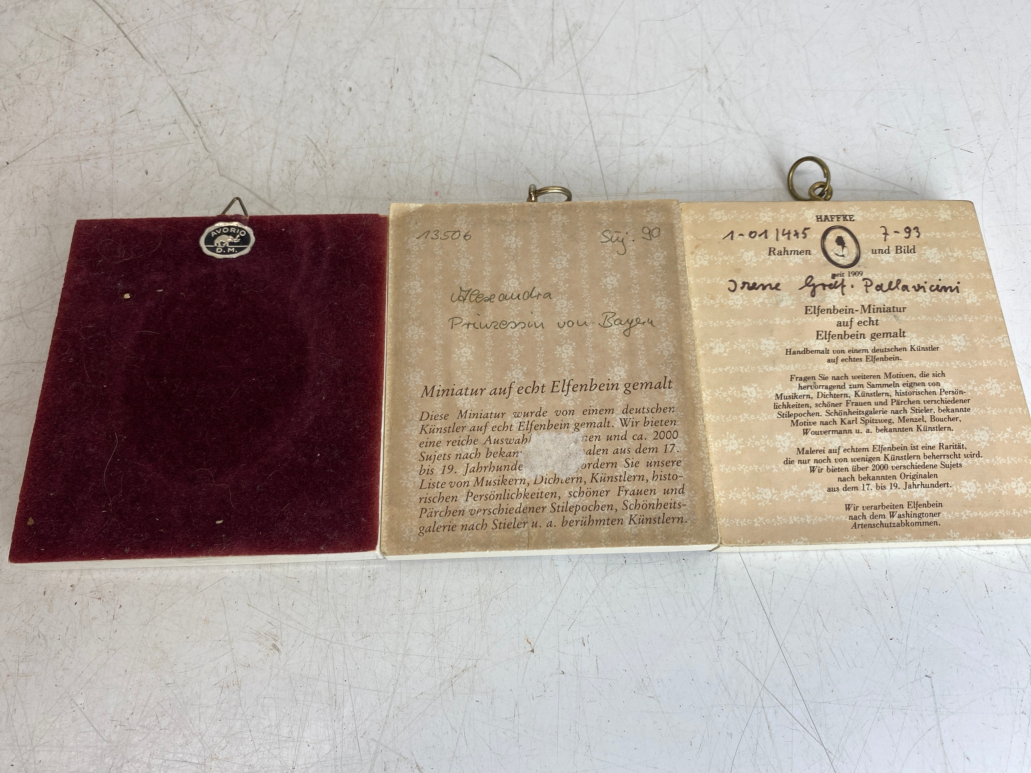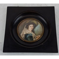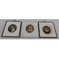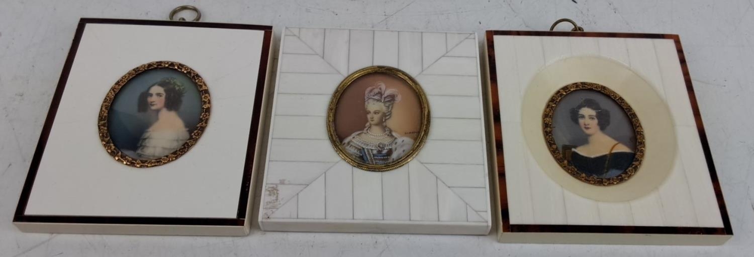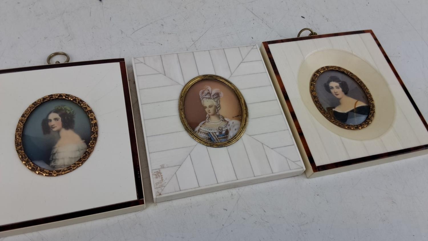 A pair of antique German hand painted miniatures in a decorative bone and tortoise shell frame and another signed Dimarch, measuring 9cm x 10cm approx each.