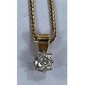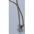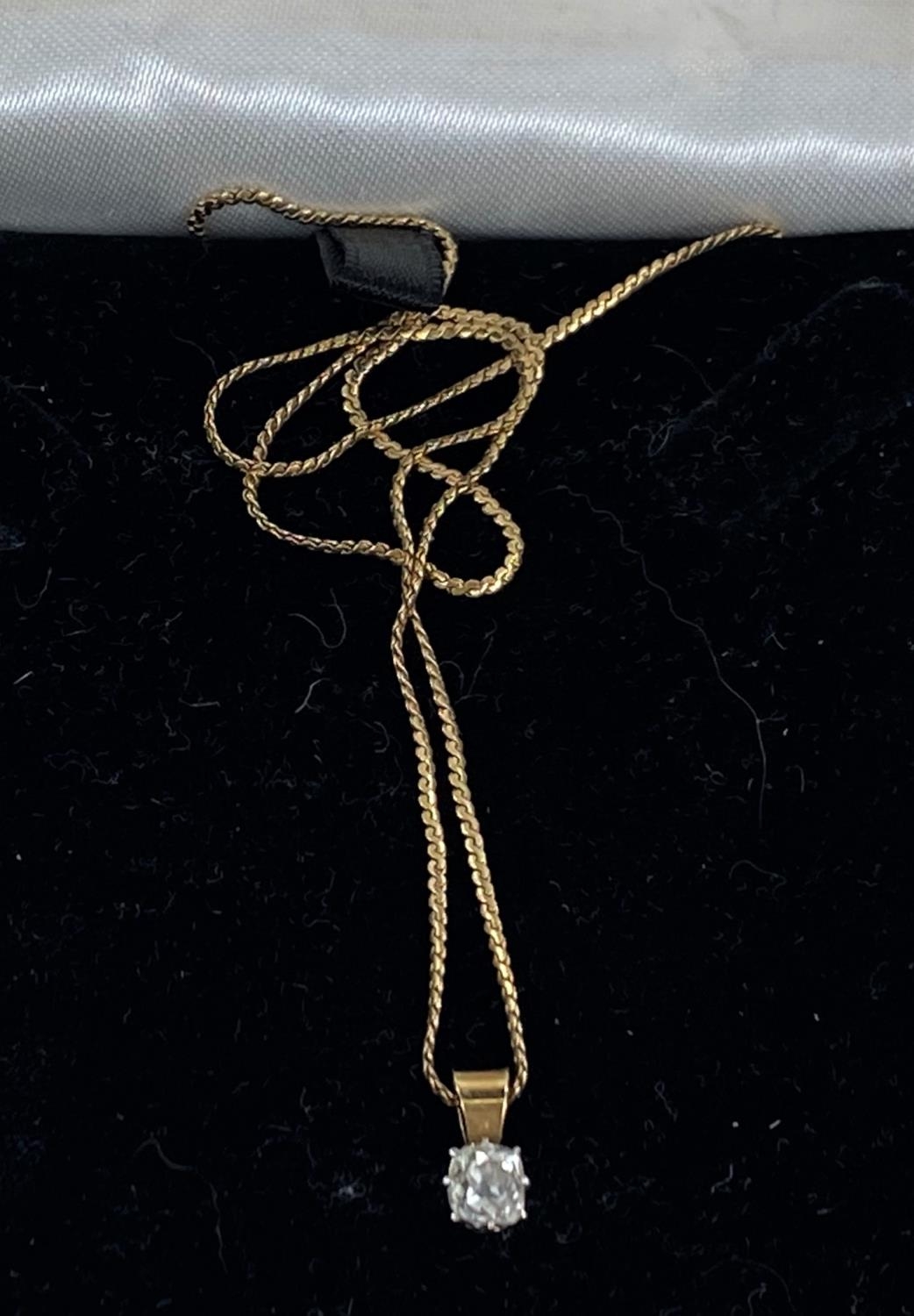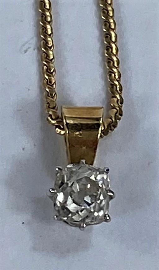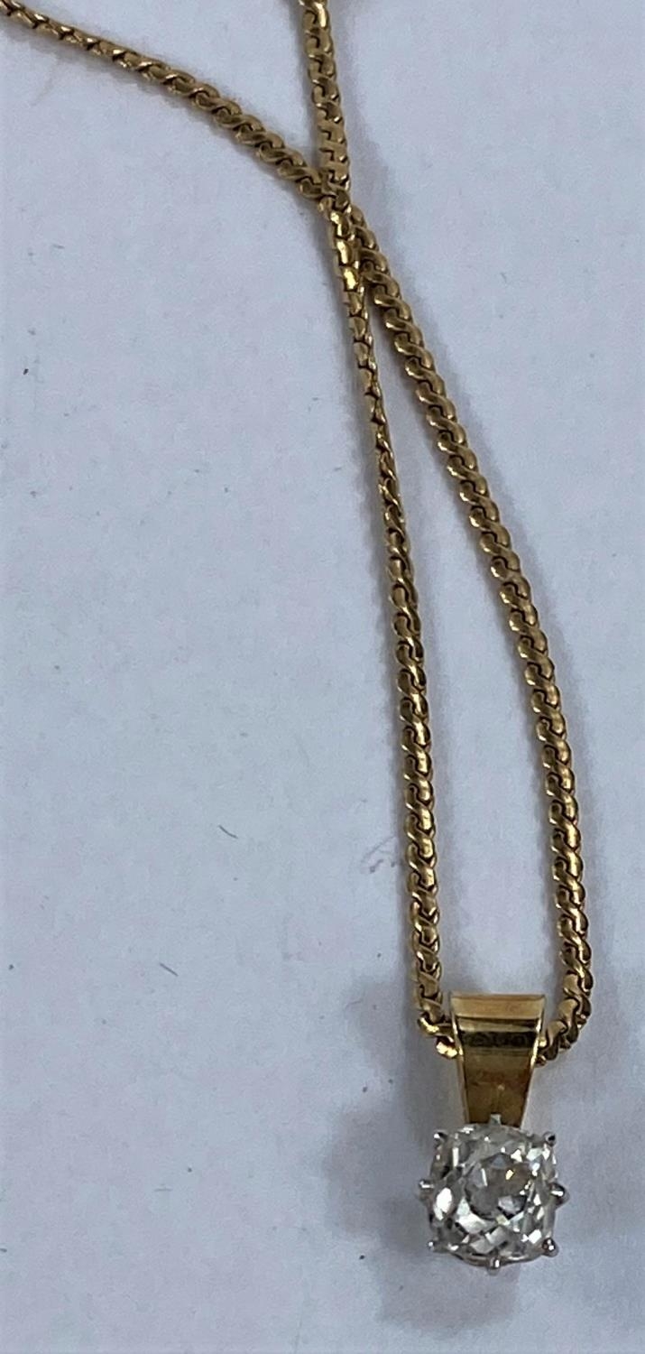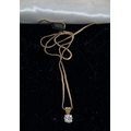 A pendant set single rounded rectangular diamond on fine yellow metal chain, stamped '750', 4.8 gm