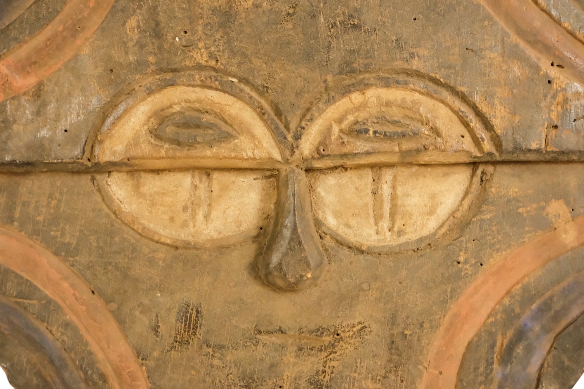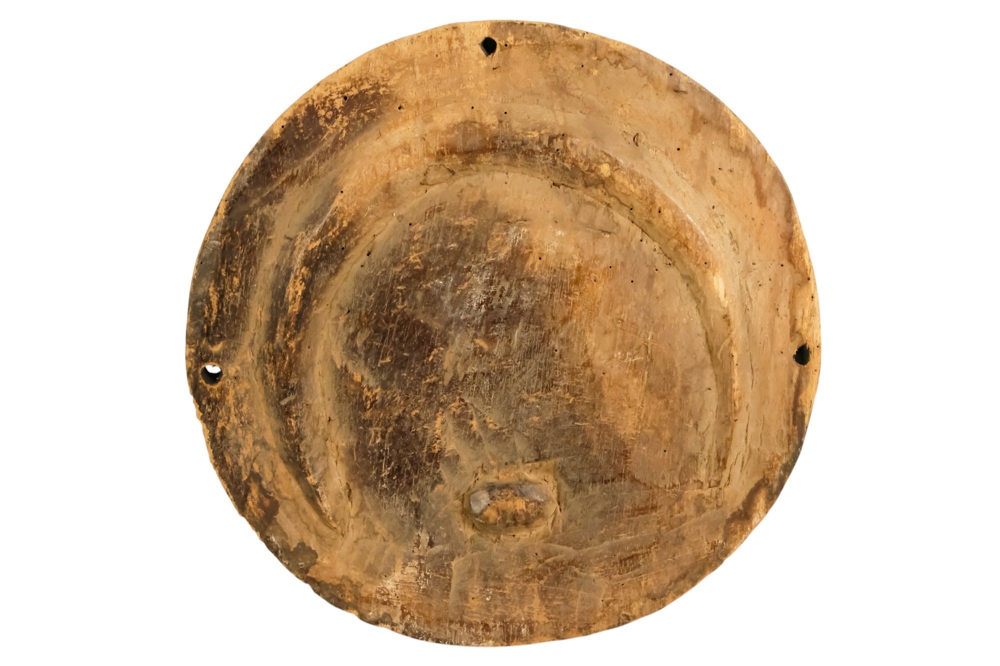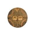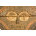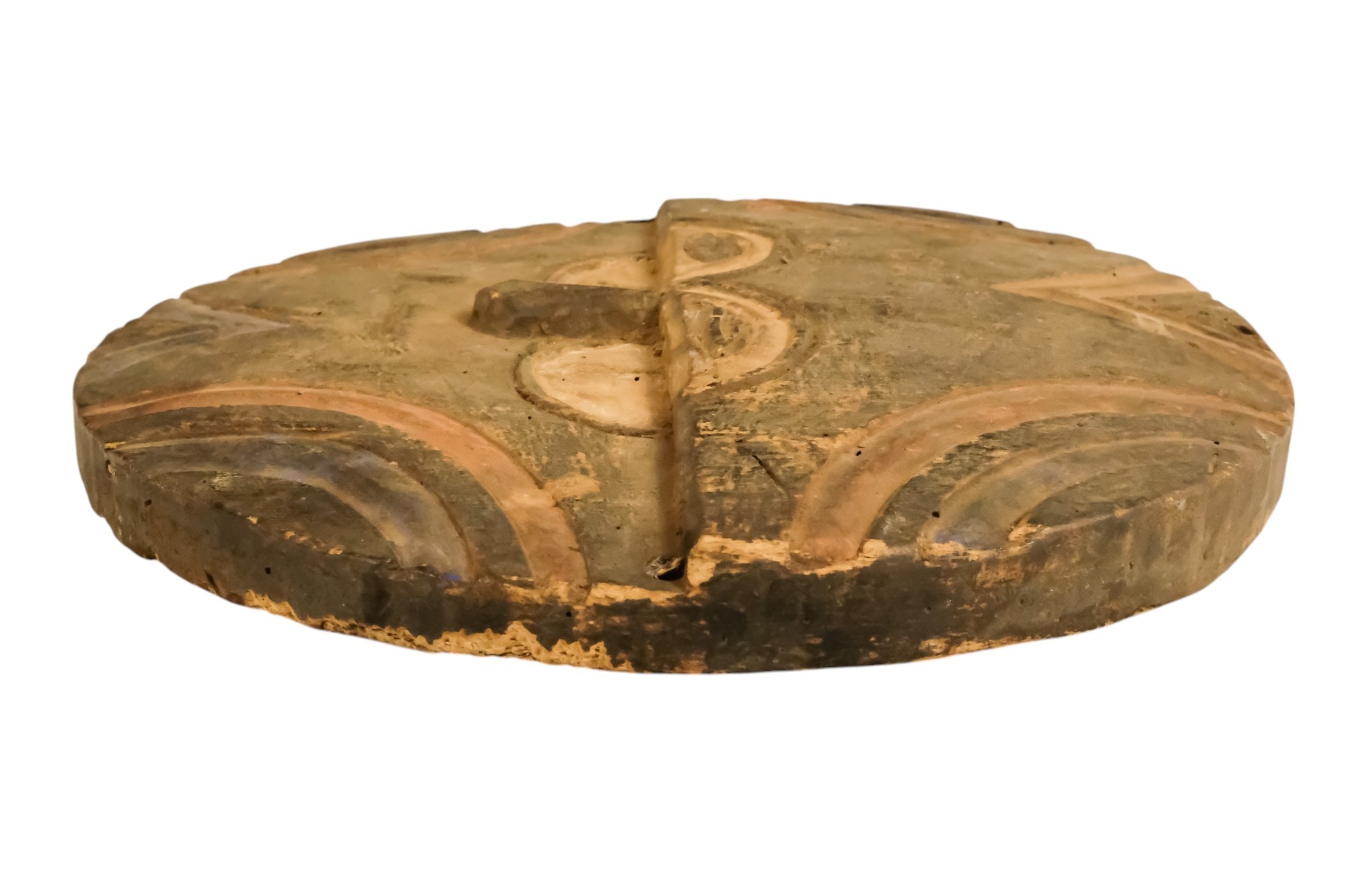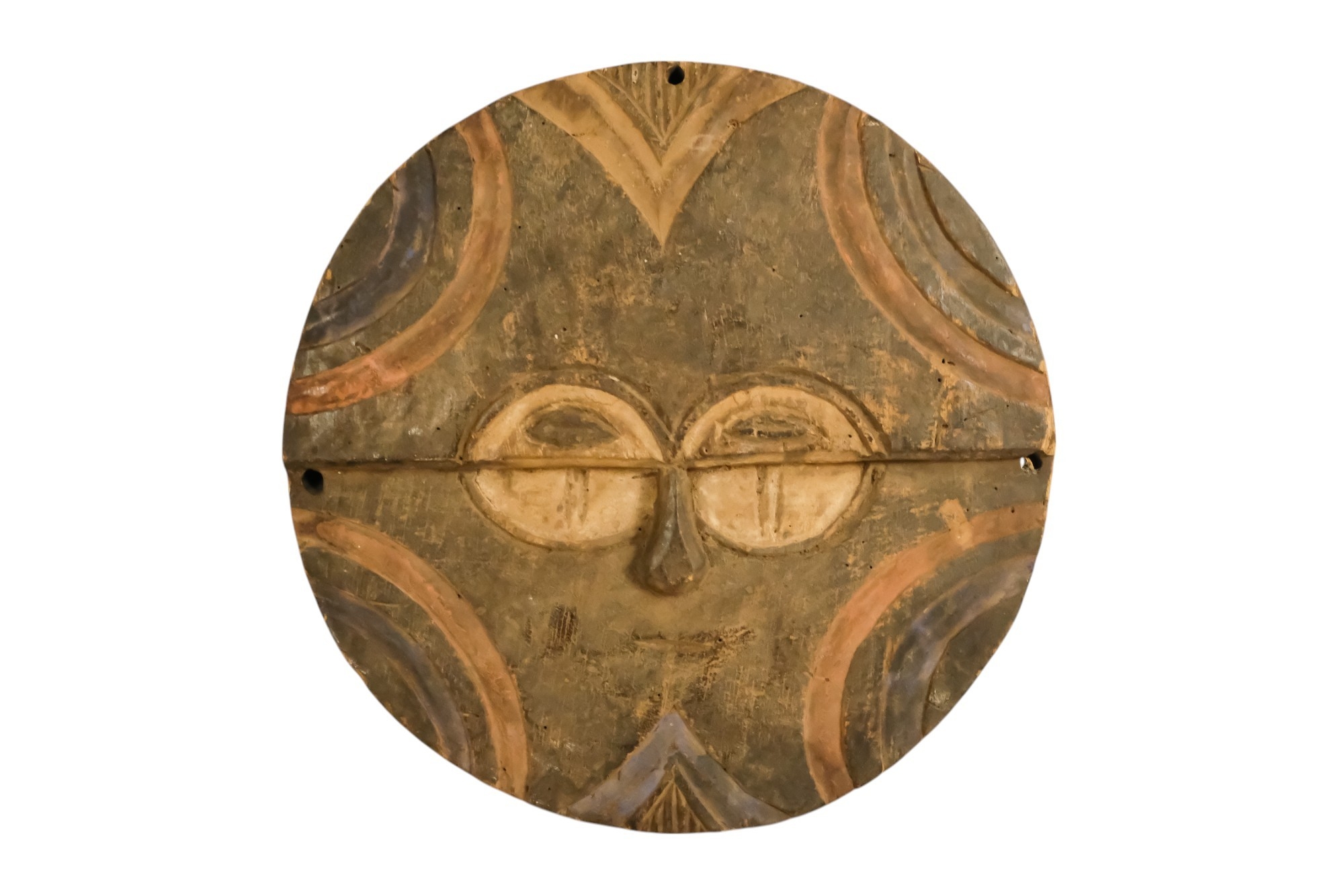A carved African hardwood mask - circular with polychrome geometric design, 31cm diameter.