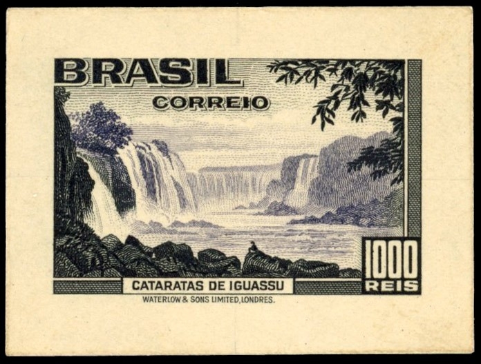 Brazil: 1938 Tourist Propaganda 1000r Iguazú waterfalls Waterlow & Sons die proof in purple and blac