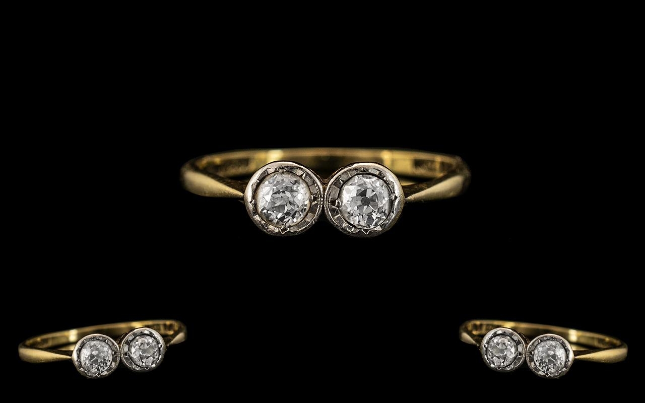 Antique Period 18ct Gold and Platinum Two Stone Diamond Set Ring. The Cushion Cut Diamonds of Good Colour, Clarity and Sparkle. Est Diamond Weight 0.40 pts. Ring Size P - Q. All Aspects of Condition Is Excellent.