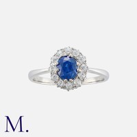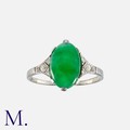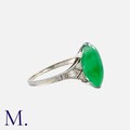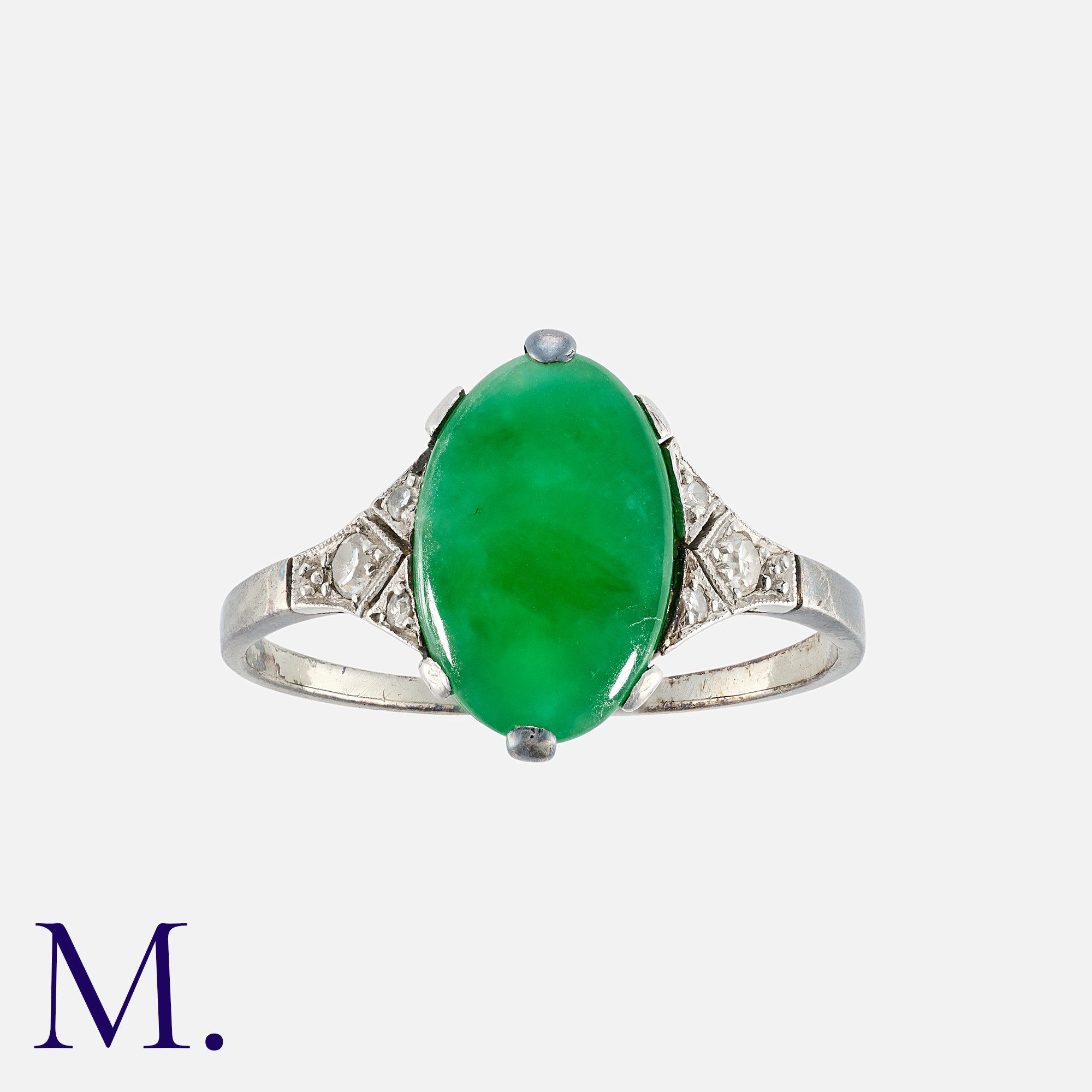 An Art Deco Jade Ring in platinum, set with an oval cabochon of jade with diamond accents either side. Unmarked; tests indicate platinum