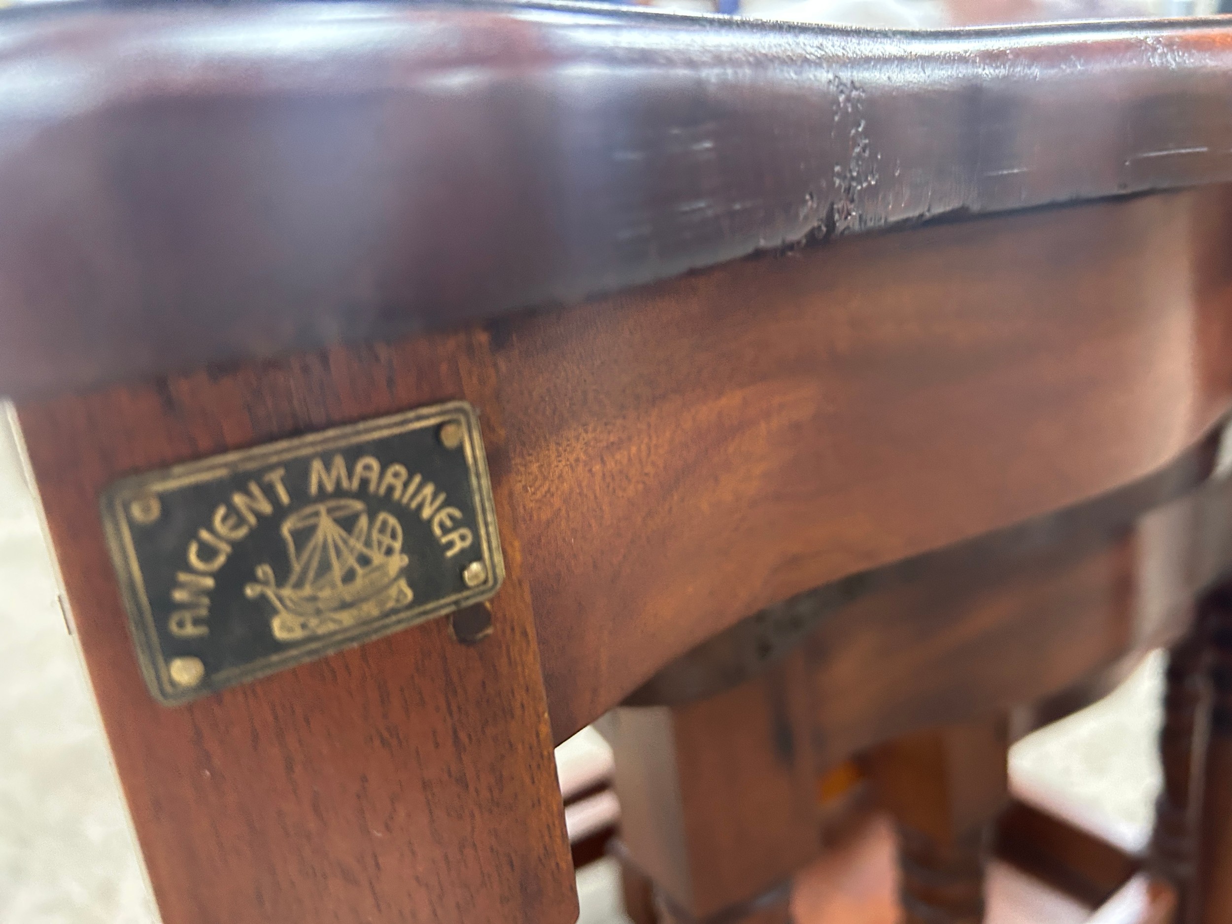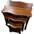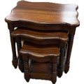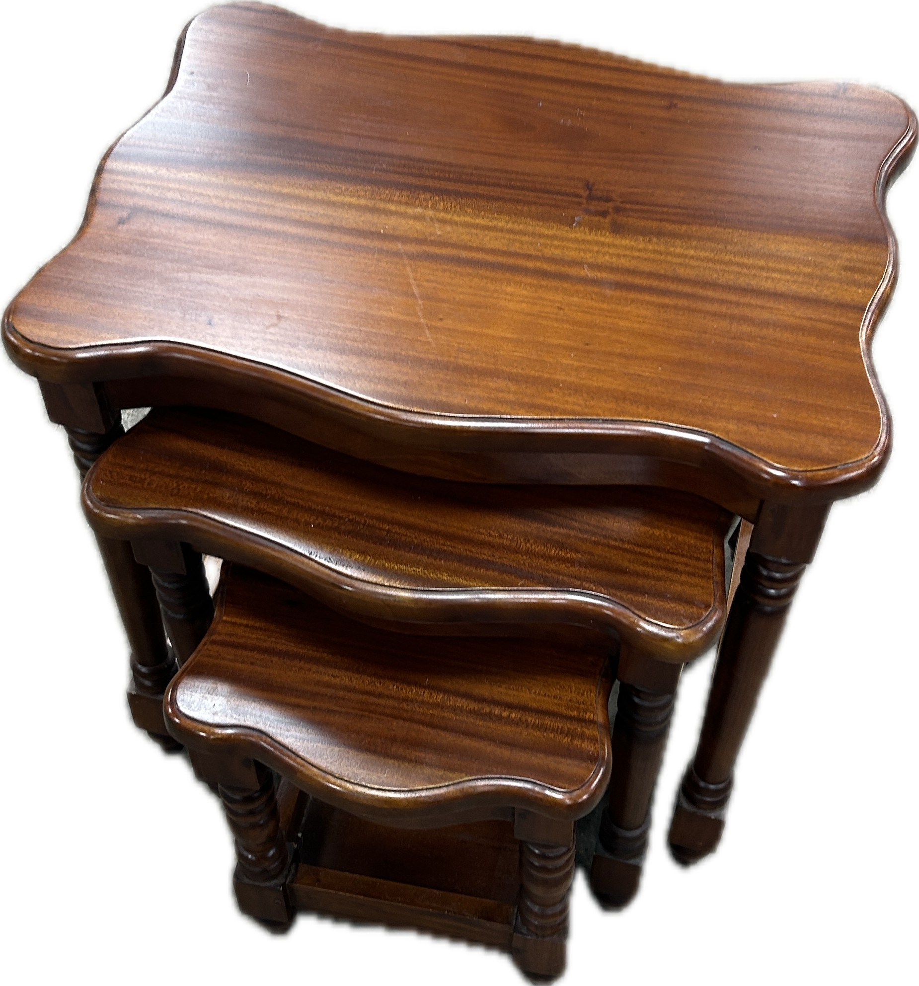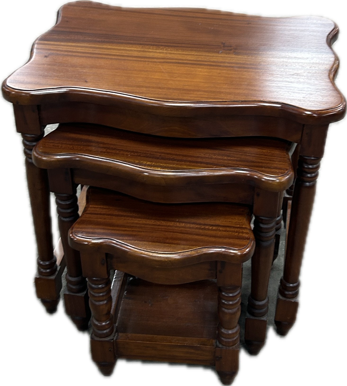 Mahogany nest of three tables maker Ancient Marinea largest measures approximately: 22 inches tall x 24 wide and 19 deep