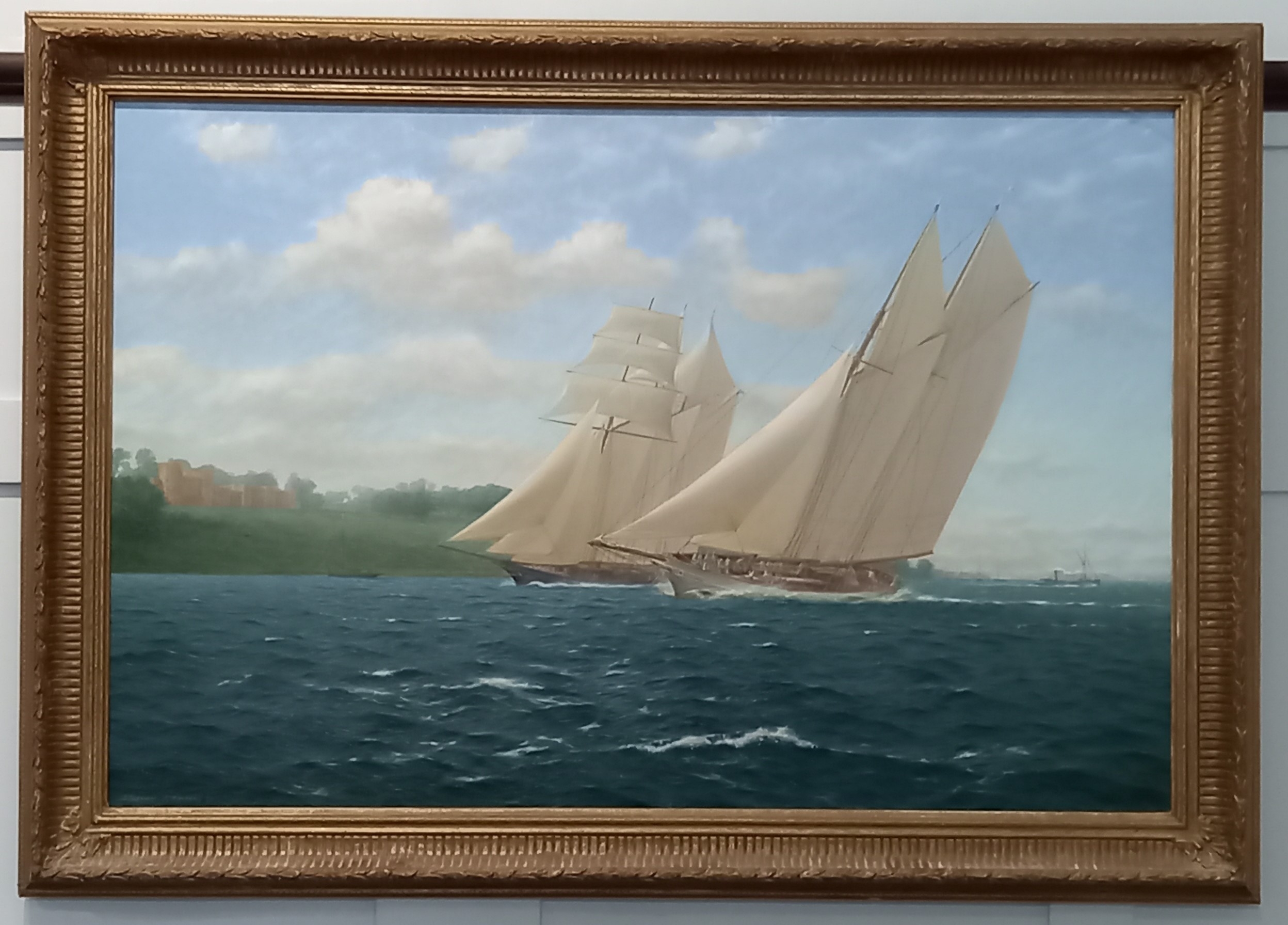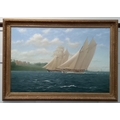 Stephen J Renard (20th Century b.1947) Racing schooners of a headland, with shipping in the distance, oil on canvas, signed and dated '90, 59cm by 90cm