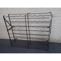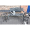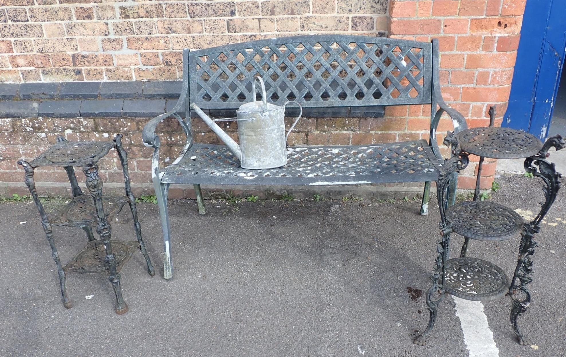 A METAL GARDEN BENCH, WITH LATTICE BACK120cm wide (seat/side joints need repair), with two cast iron conservatory stands, and a galvanized watering can (4)