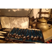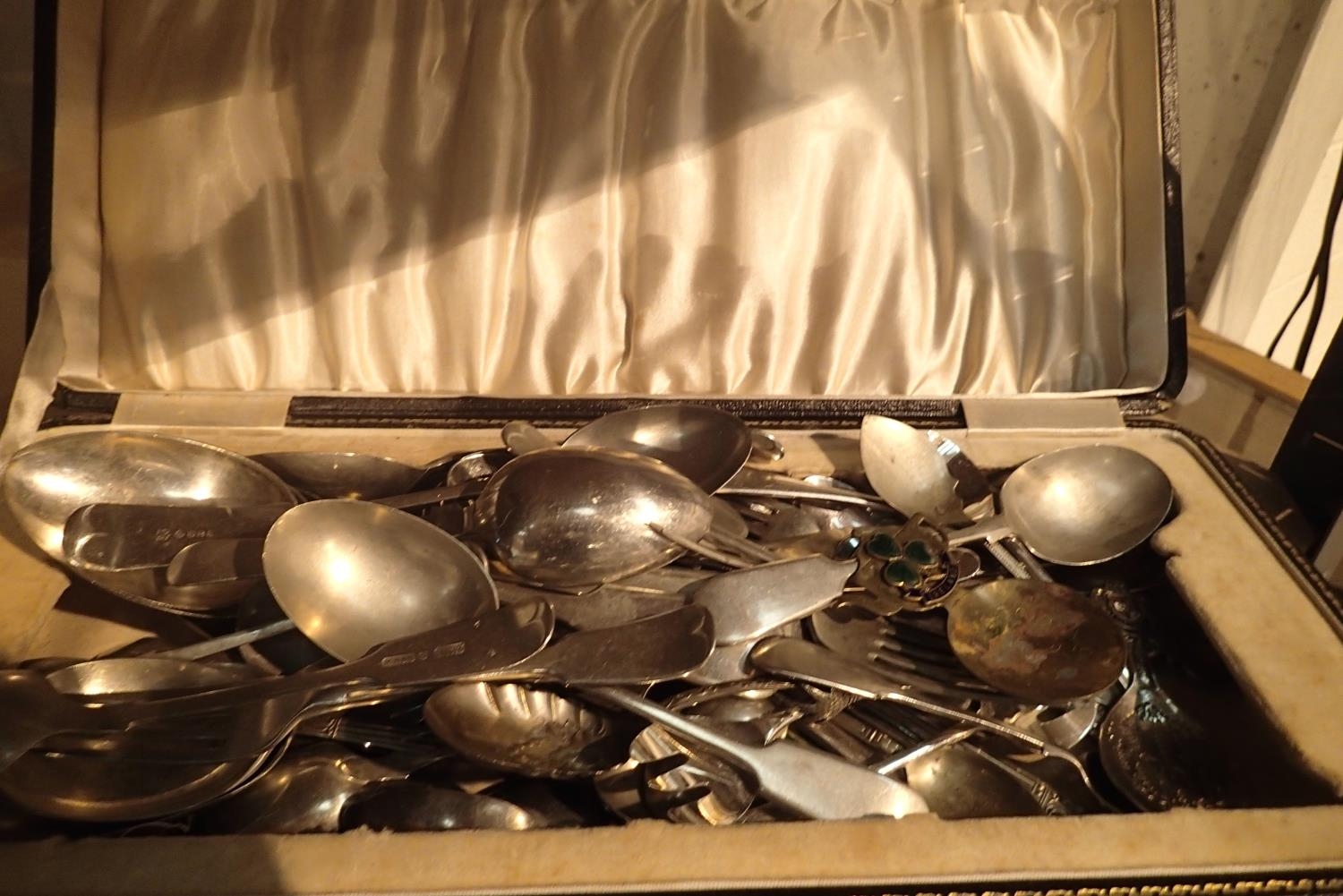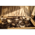 Mixed box of cutlery to include silver plate examples and caddy spoons. Not available for in-house P&P, contact Paul O'Hea at Mailboxes on 01925 659133