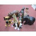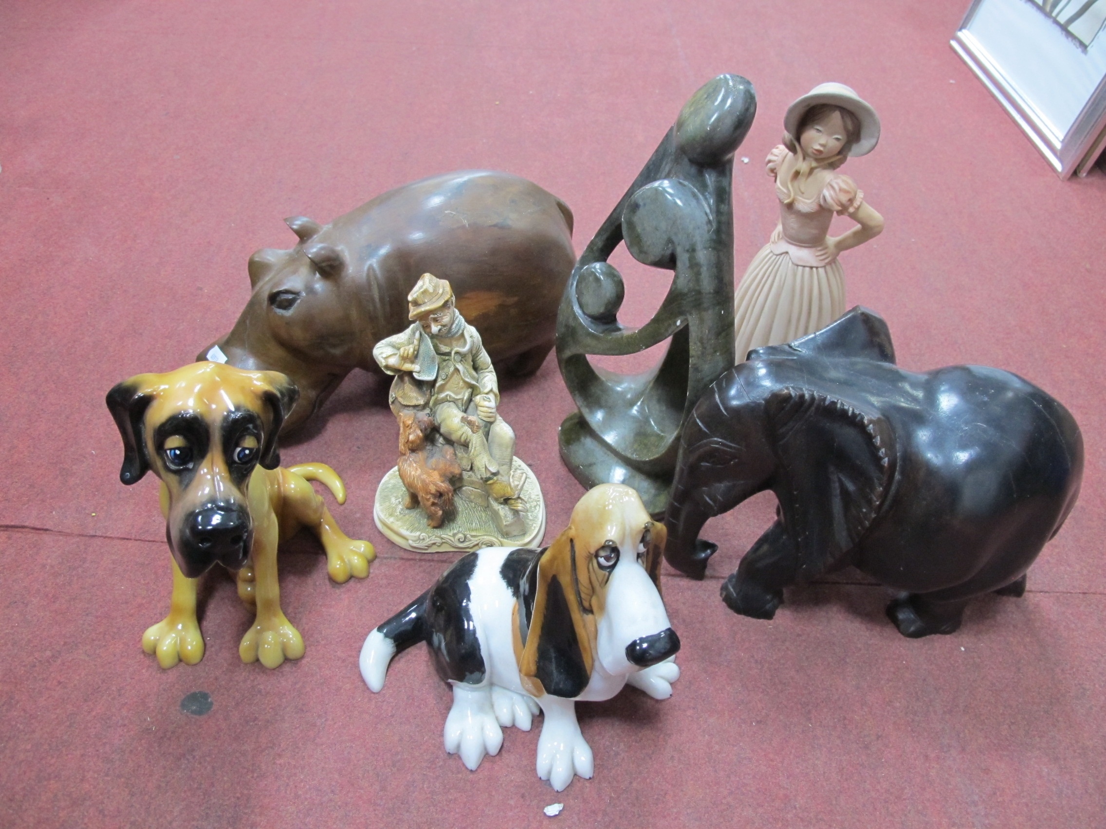 Collection of figurines to include carved hardwood elephant and hippopotamus, young girl in bonnet marked 'Lara 16/3000', two dogs and stone family hugging etc. 1 Box.