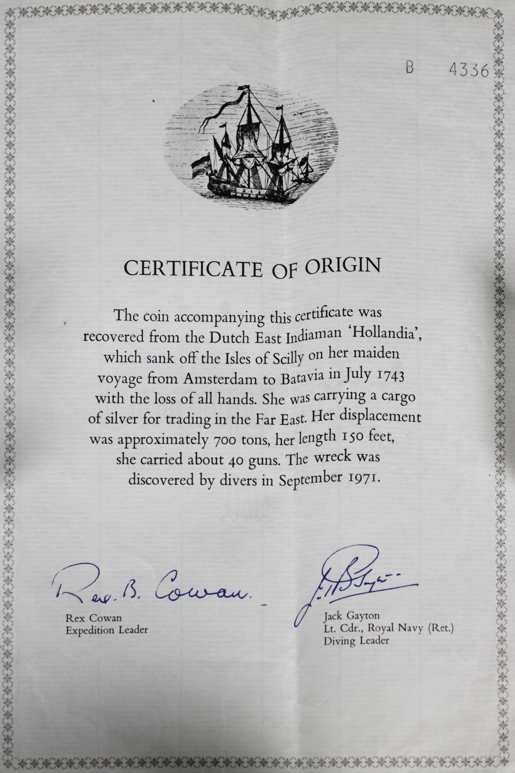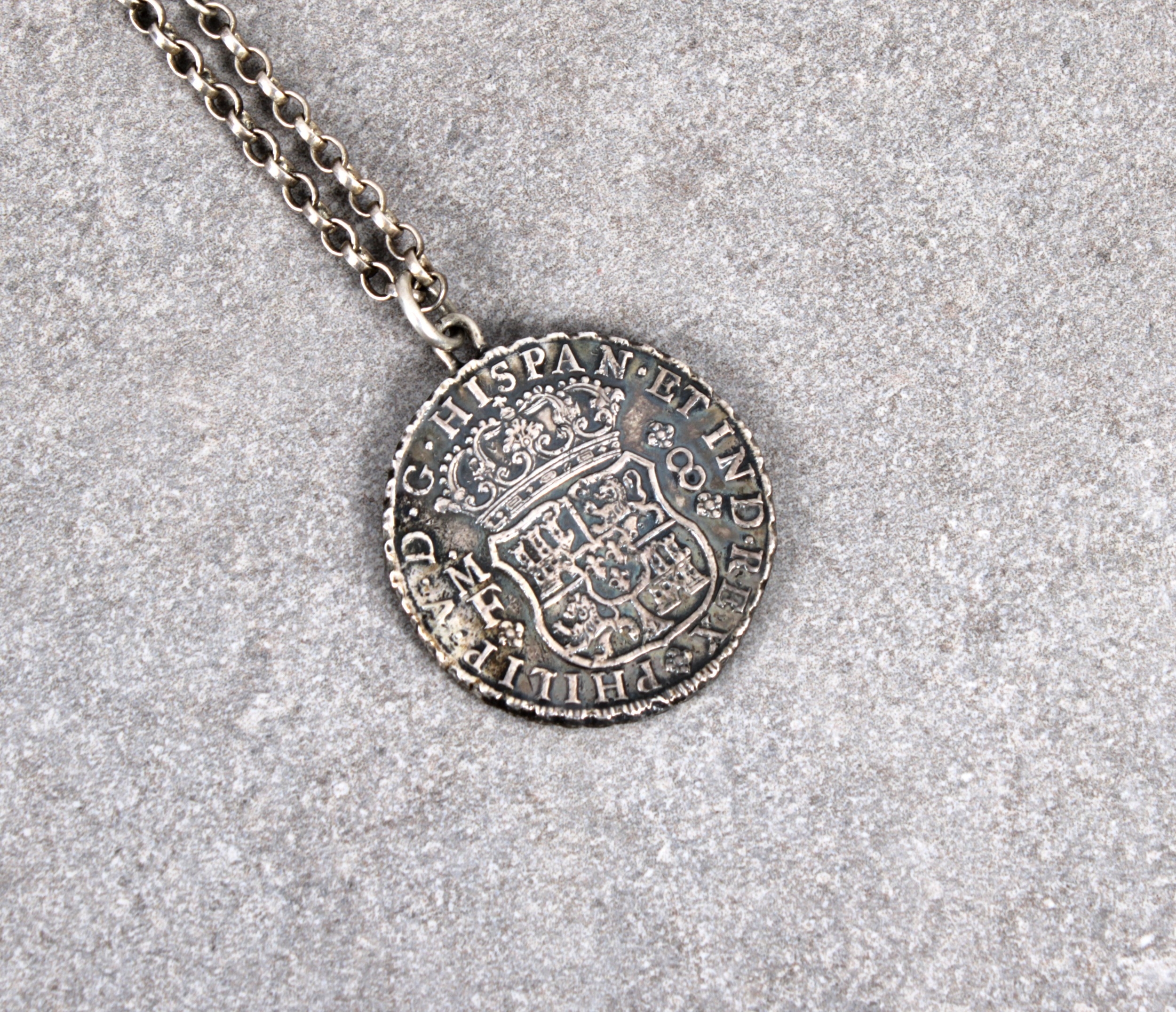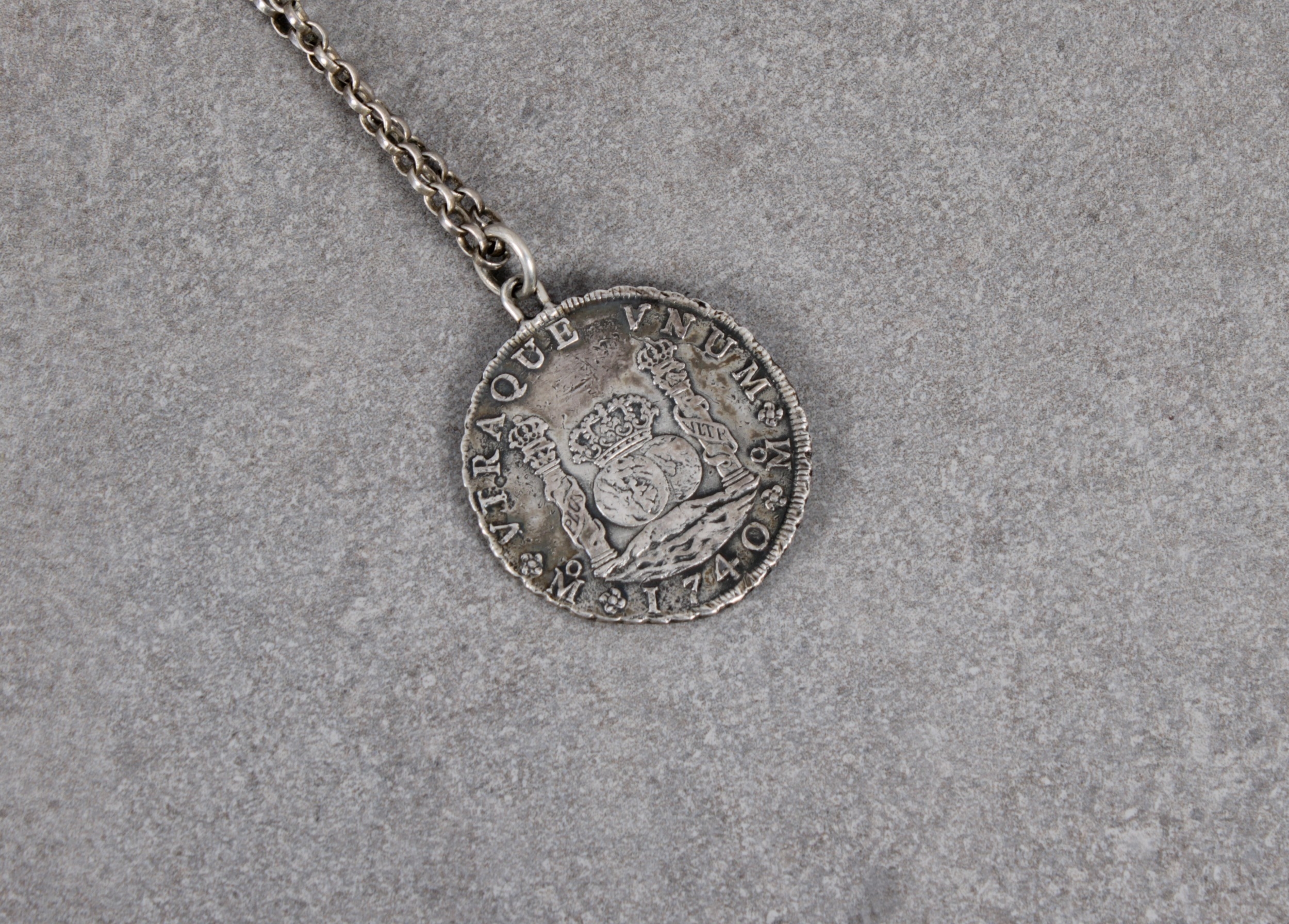HOLLANDIA SHIPWRECK COIN - A 1740 Philip V of Spain Pillar Dollar (Piece of Eight) recovered from the wreck of the Hollandia mounted with attached loop with chain, accompanied by Certificate of Origin. * (Hollandia was a ship of the Dutch East India Company wrecked on Annet, Isles of Scilly on 13 July 1743, 276 fatalities, the wreck was discovered in 1971)