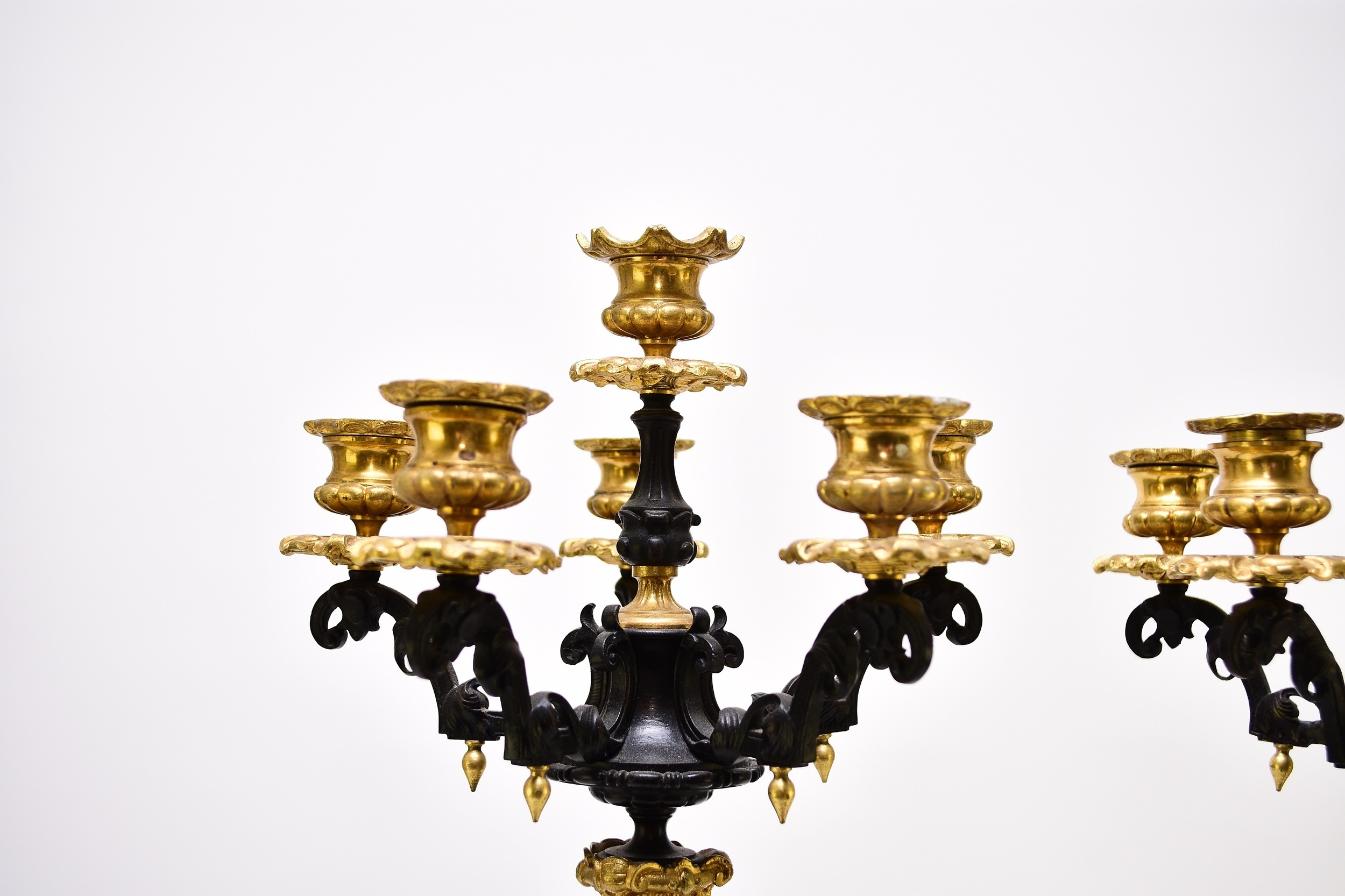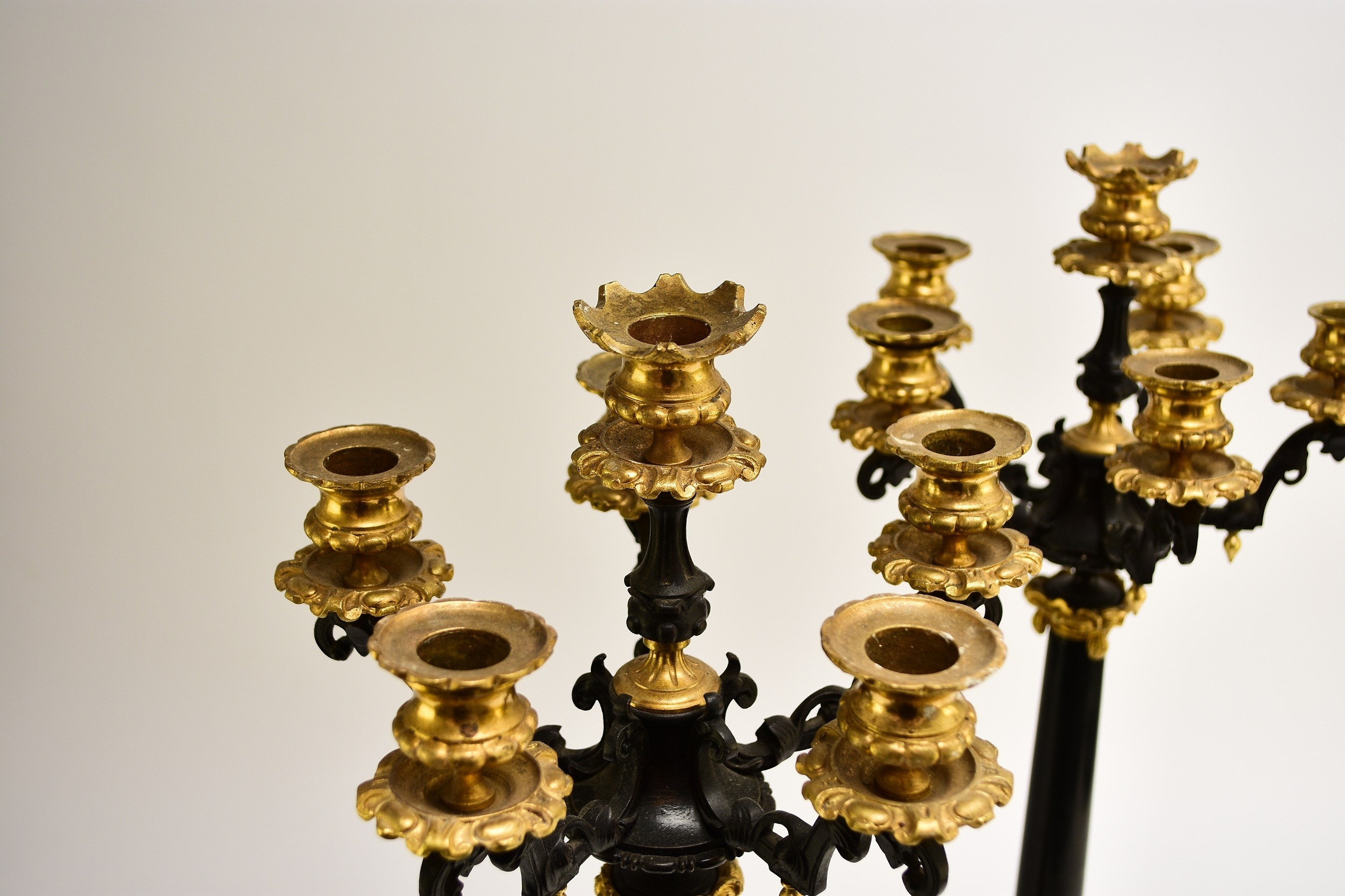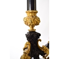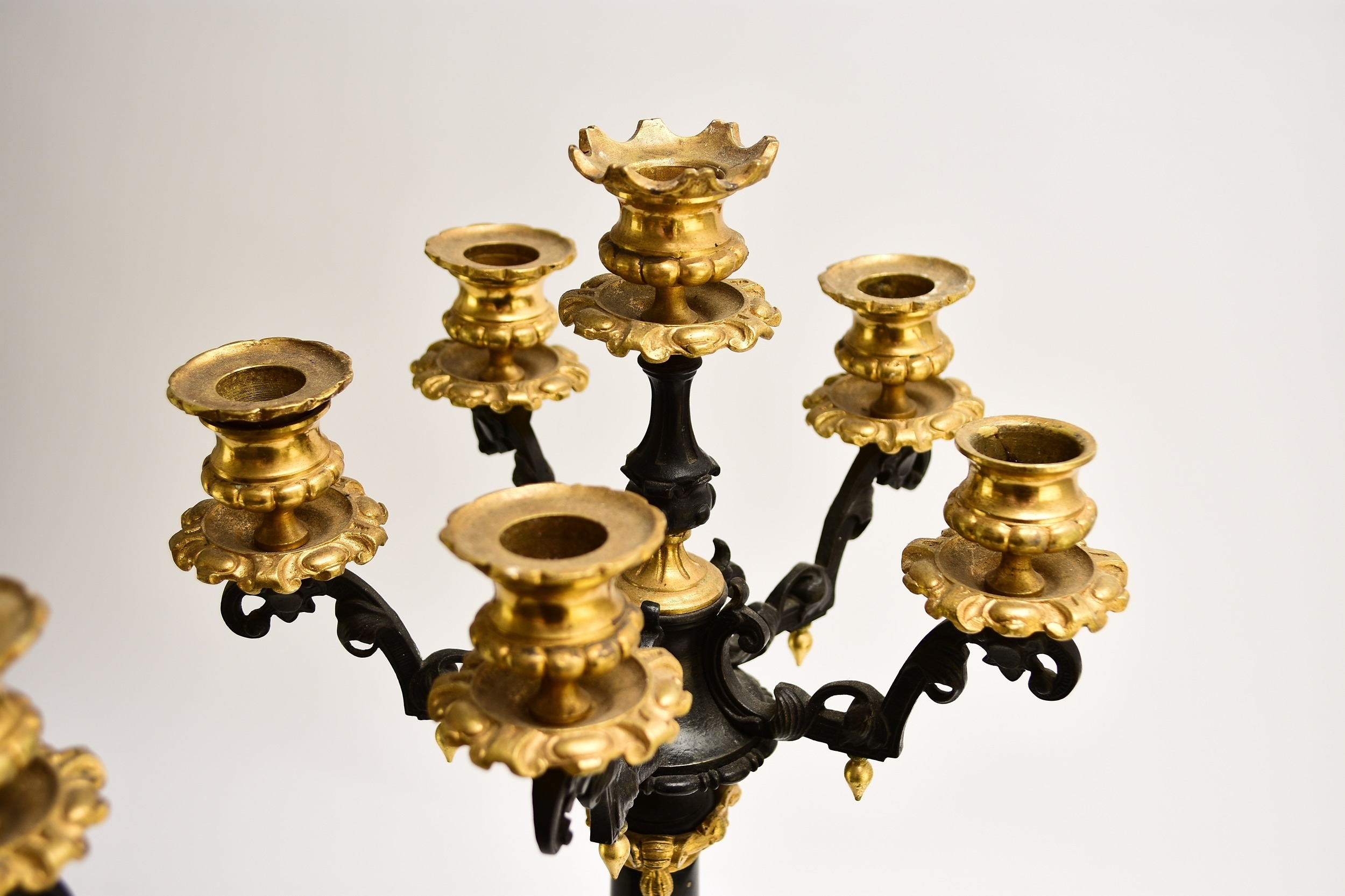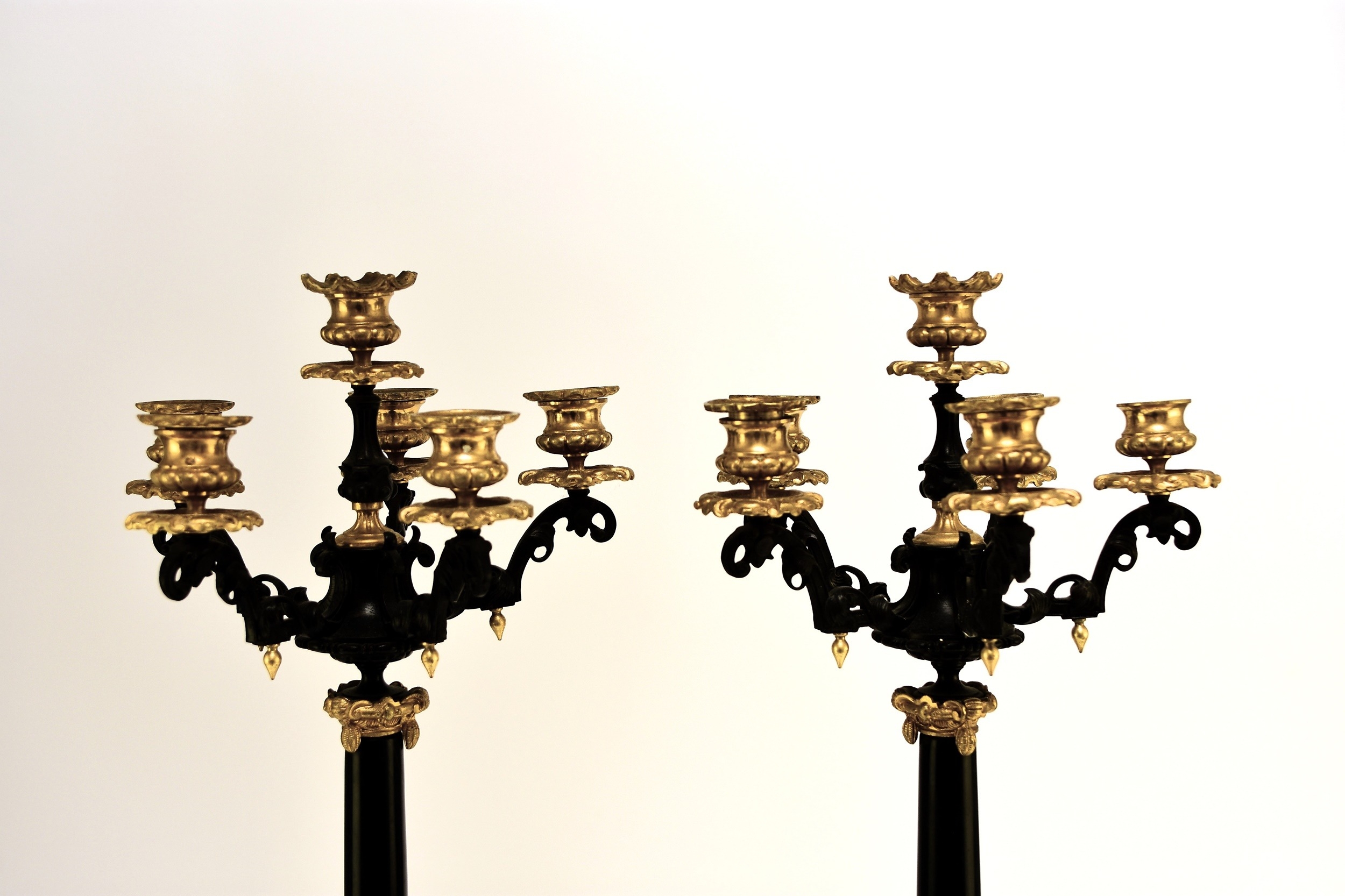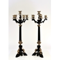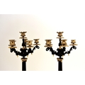 A pair of bronze, ormolu and marble candelabra, late 19th century With five scroll branches having gilt urn nozzles around a central conforming nozzle, the black marble stems raised on moulded trefoil scroll bases. 62cm high (2) Acquired from Corry's Antiques, Leicester, in 1995. Condition:Both good with only minor/negligible signs of age.
