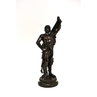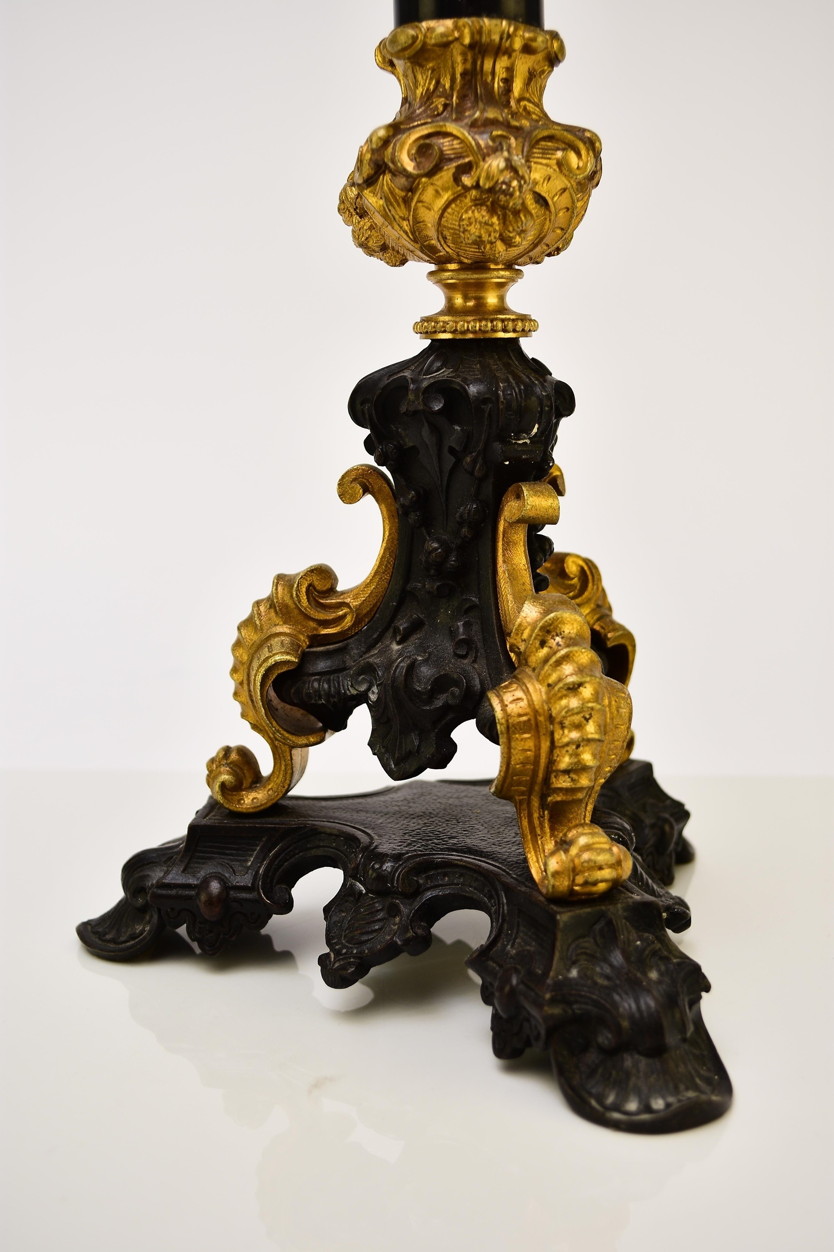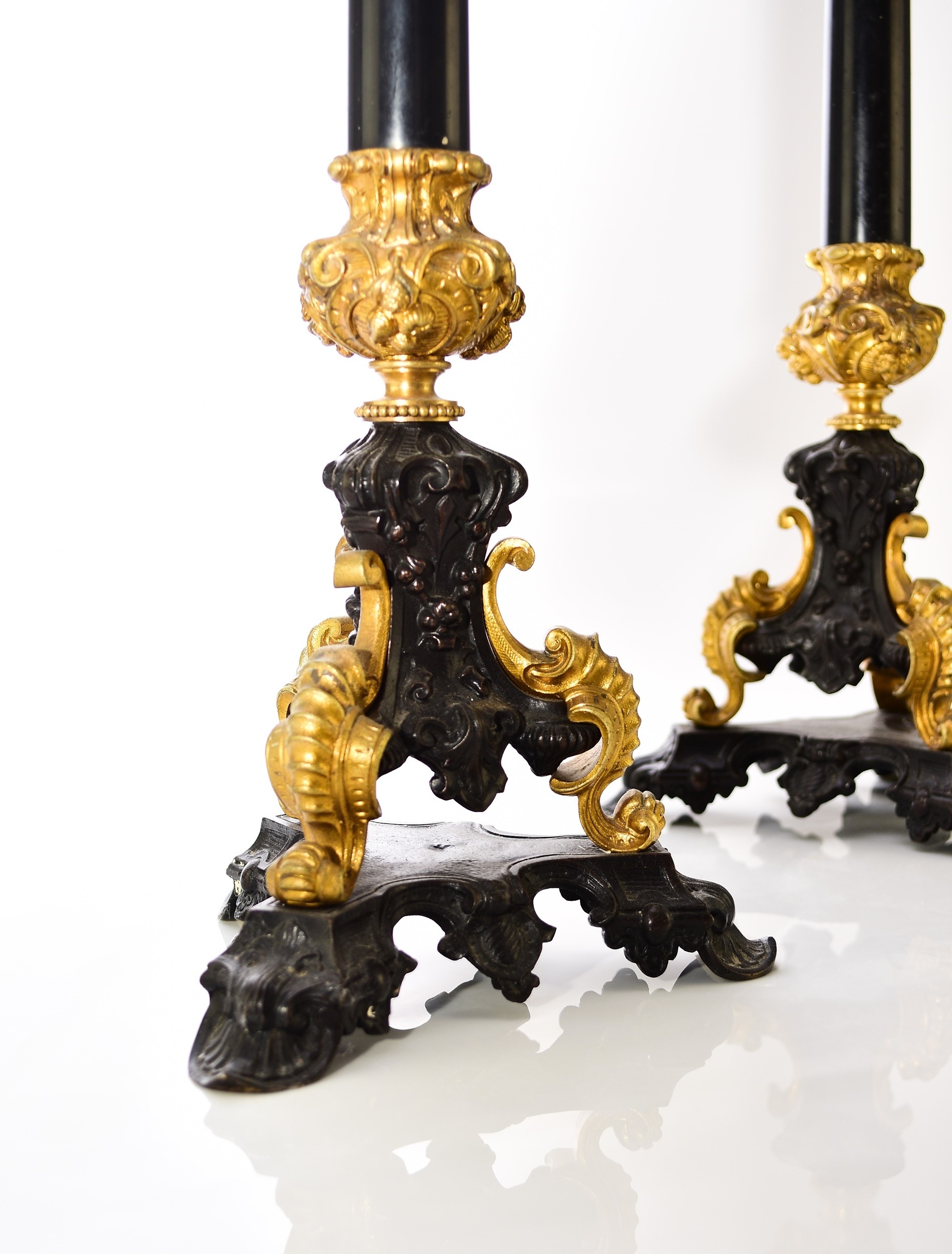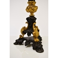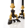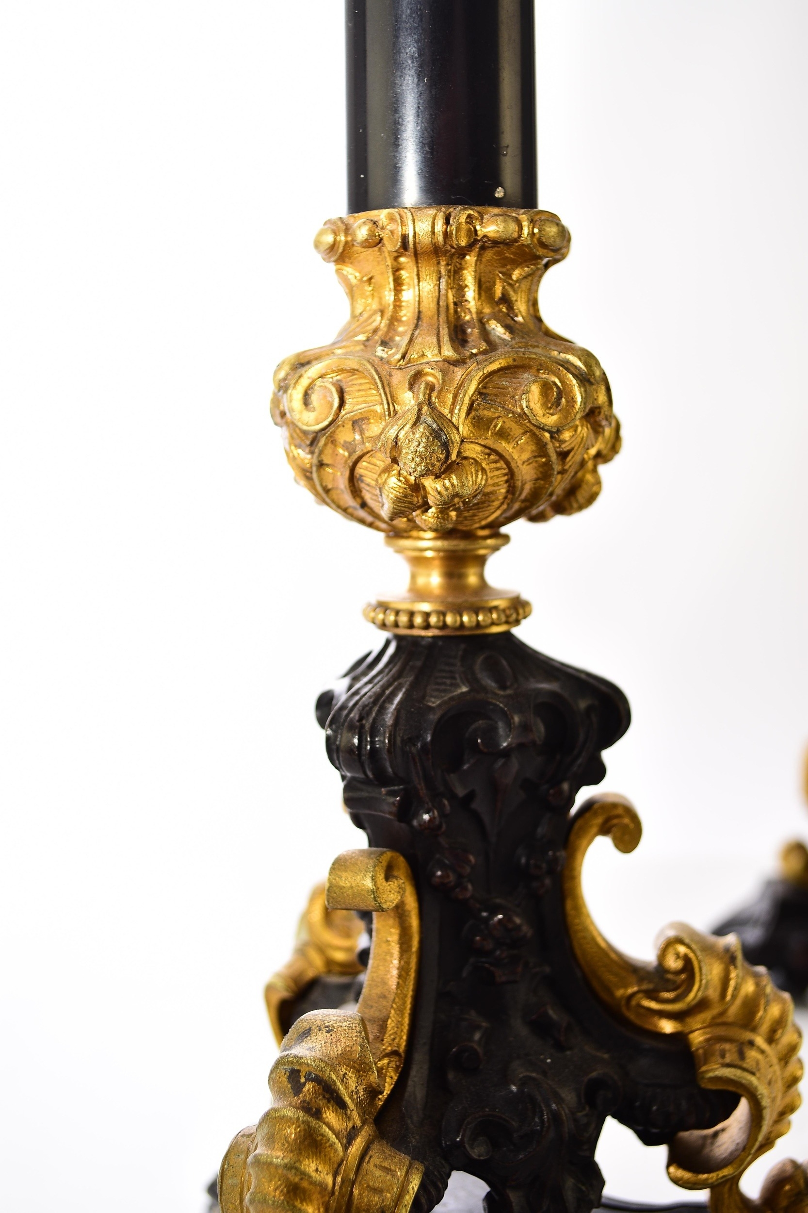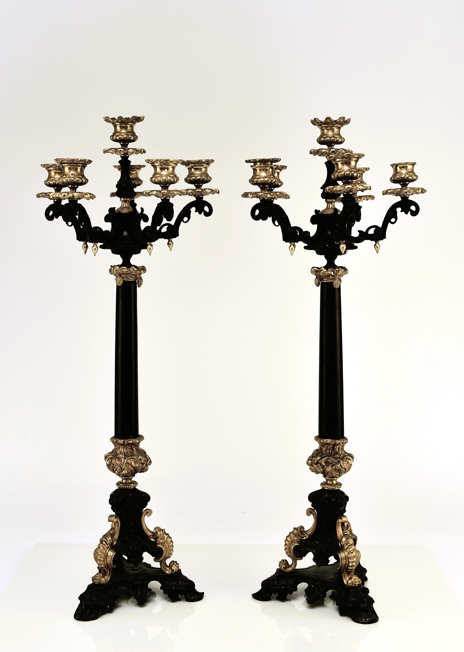 A pair of bronze, ormolu and marble candelabra, late 19th century With five scroll branches having gilt urn nozzles around a central conforming nozzle, the black marble stems raised on moulded trefoil scroll bases. 62cm high (2) Acquired from Corry's Antiques, Leicester, in 1995. Condition:Both good with only minor/negligible signs of age.