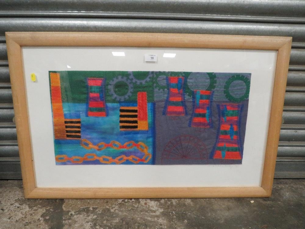 A BLACK COUNTRY INTEREST FRAMED AND GLAZED TAPESTRY PICTURE SIGNED CHARLOTTE HODGE LOWER RIGHT - OVERALL SIZE 89.5CM X 56CM