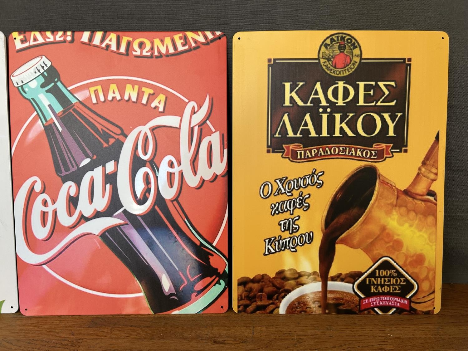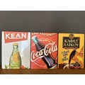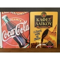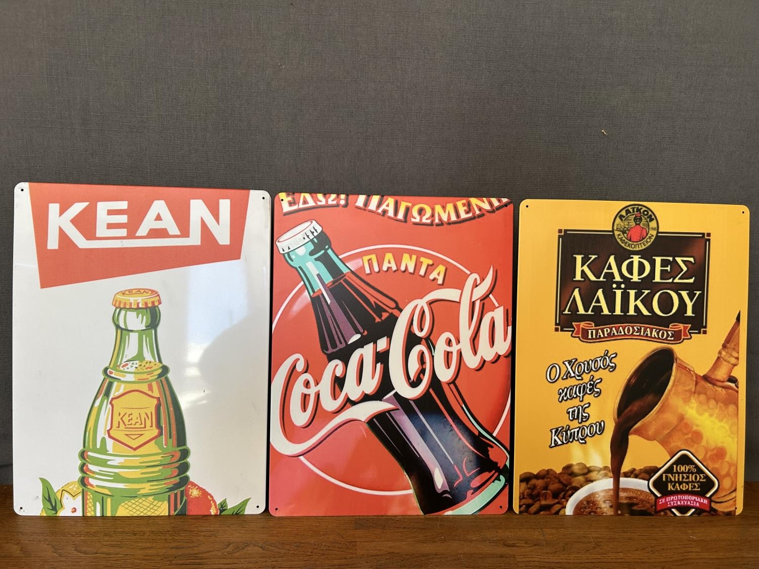x3 Collectible Cyprus Tin Signs of Coca-Cola, KEAN and 'Laiko' Cyprus Coffee (40 x 30cm/each)