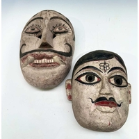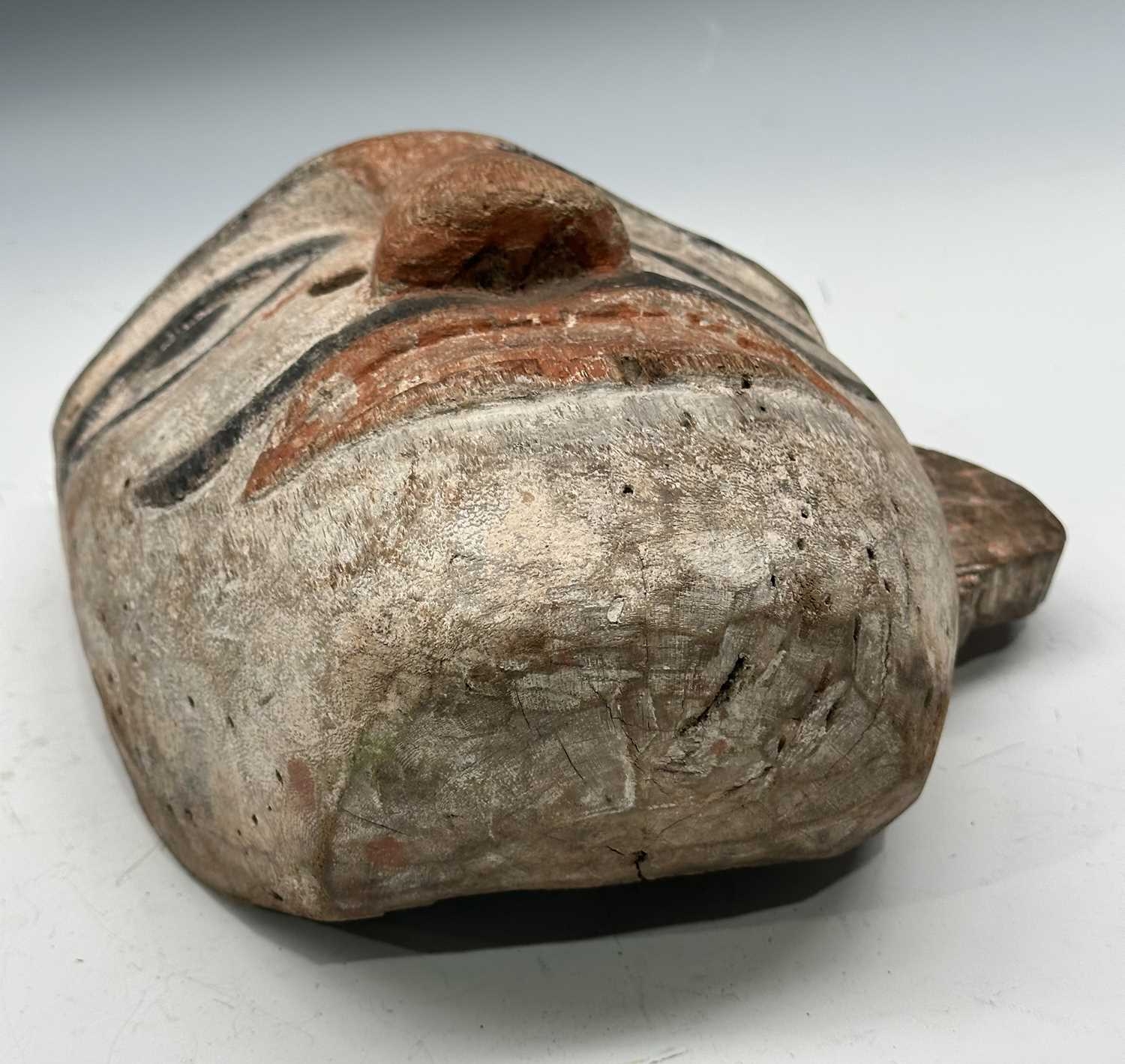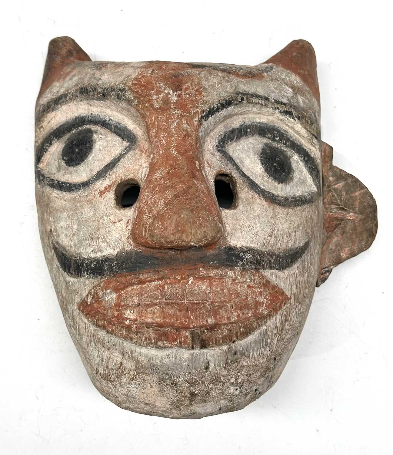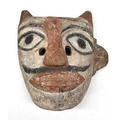 A dancer's mask modelled as a stylised, anthropomorphised tiger, carved wood, with pointed red/orange ears above a painted white face with two coal-lined staring eyes, two pierced eye holes flanking a red/orange striped nose, a curling black moustache and toothy grimace, late 19th century, Terai district, Southern Nepal, 29 by 21cm Note: Bengal tigers, a real threat to Terai villages, have been incarnated through wearable masks or mounted on posts, functioning as deterrents. Provenance: The Alain Rouveure Collection
