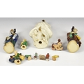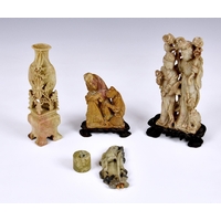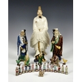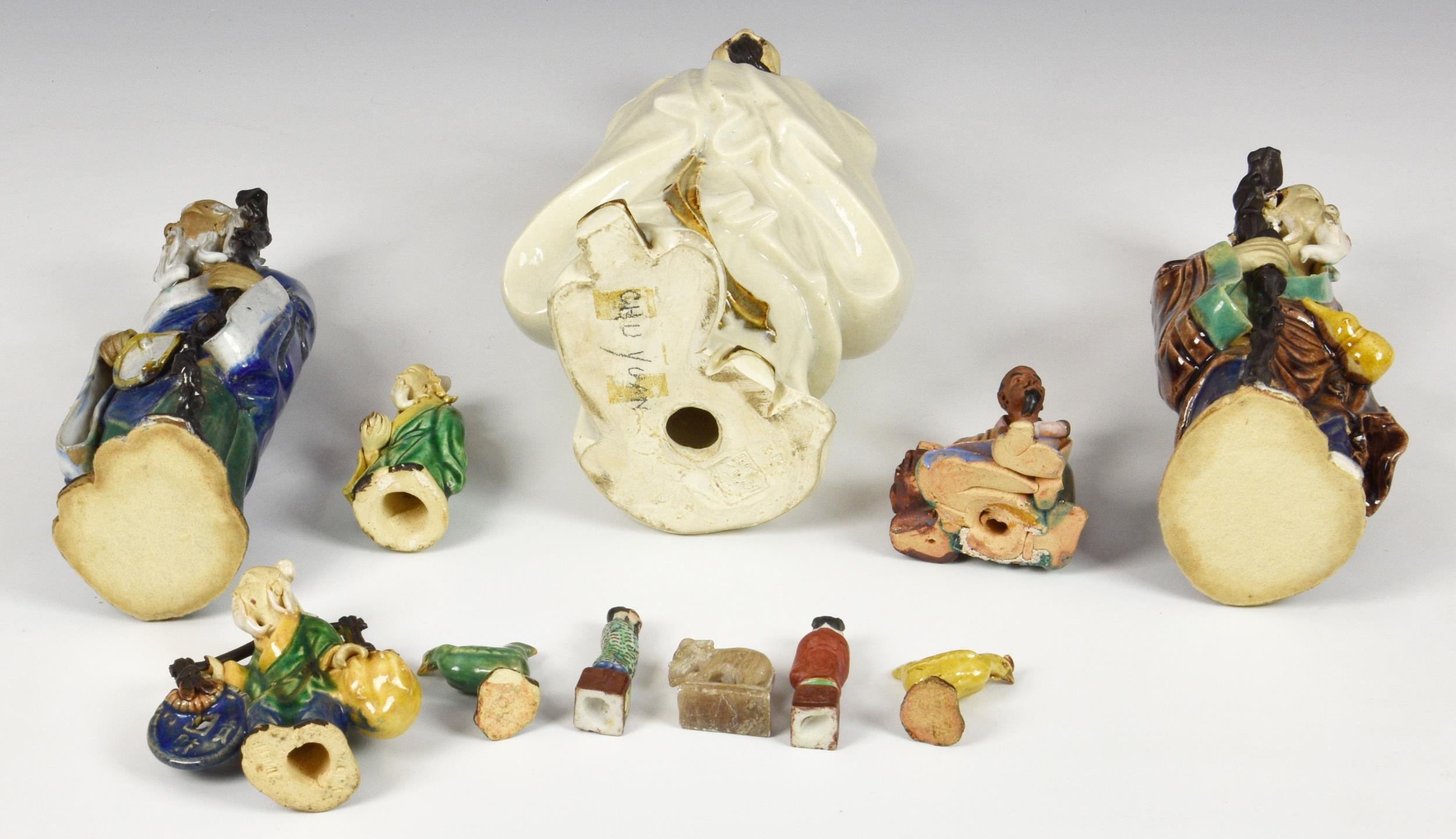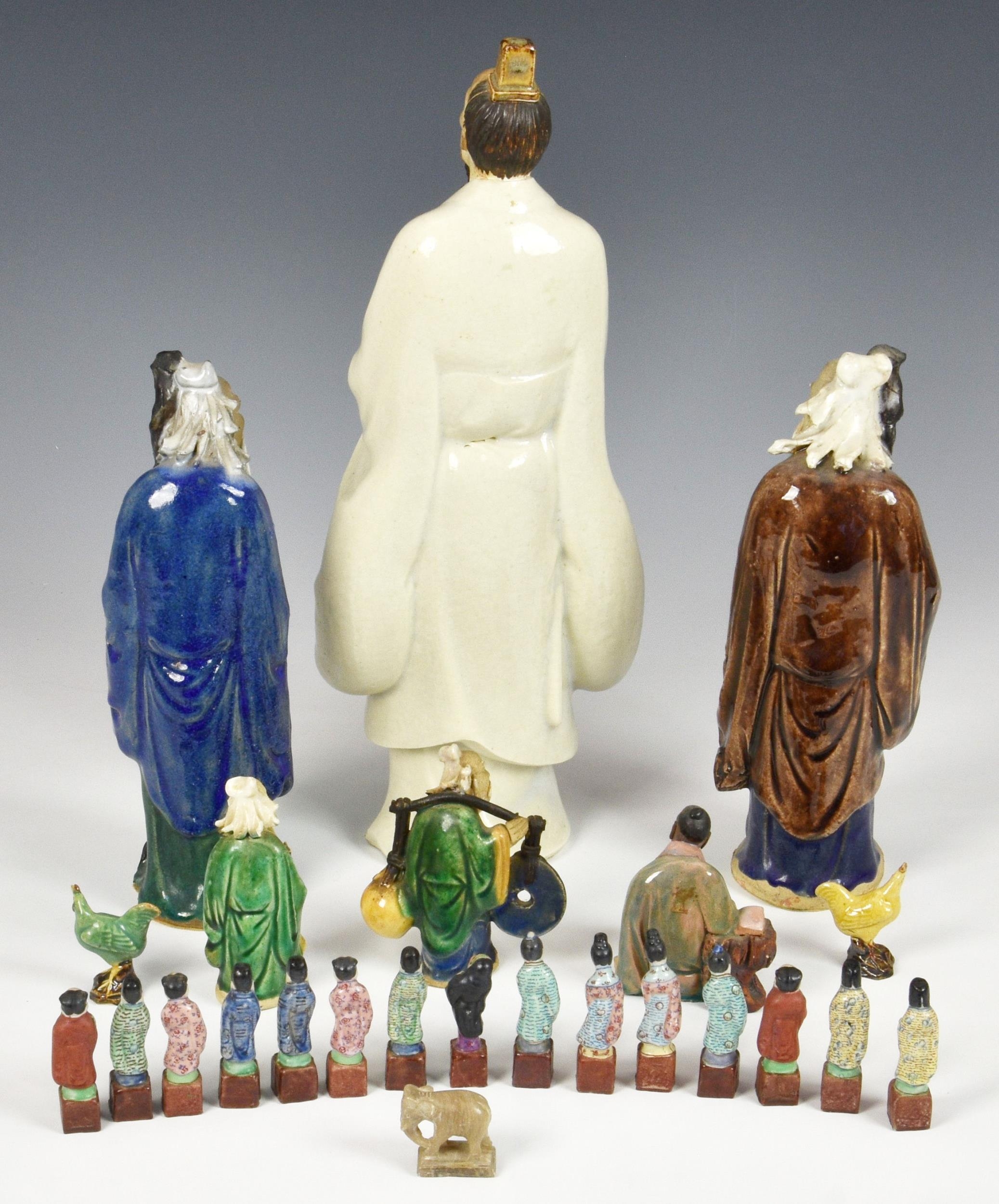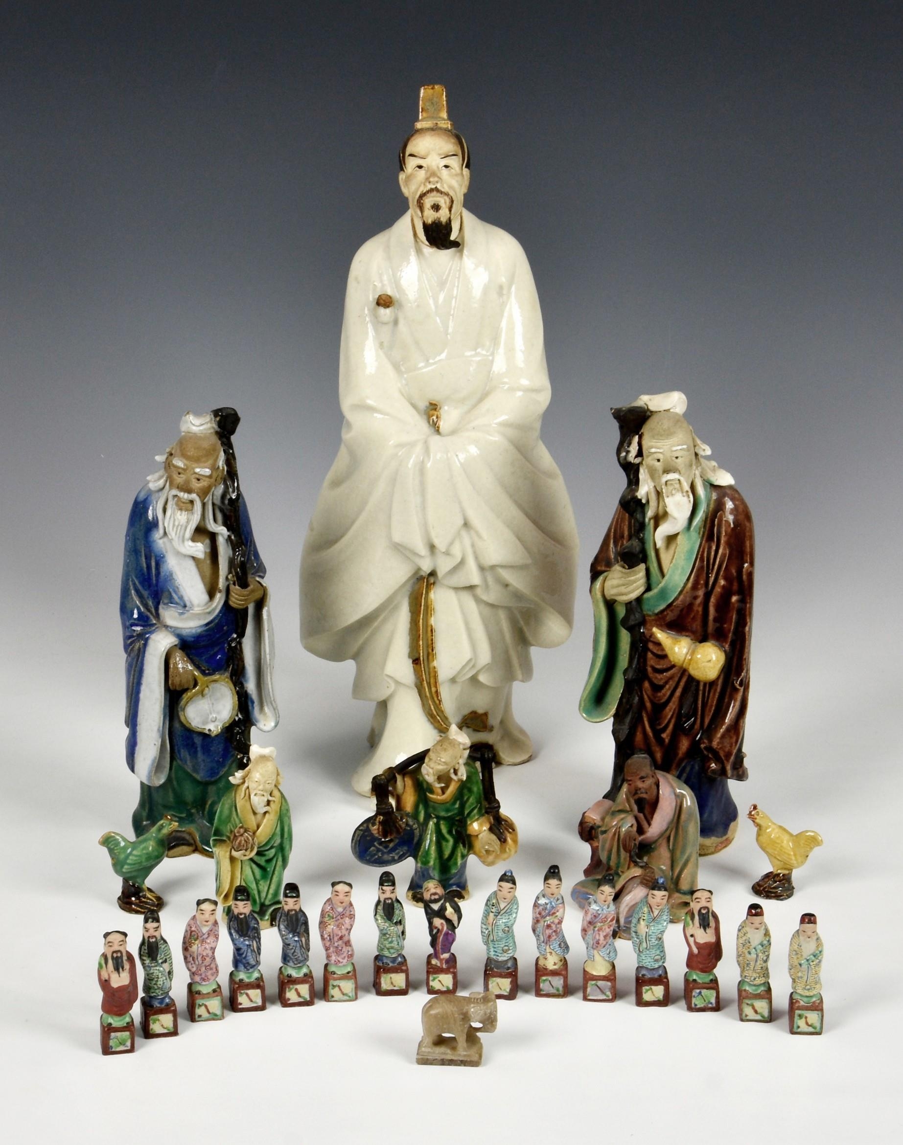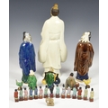 A collection of Chinese stoneware and porcelain figures, 20th century, comprising a large stoneware figure of the poet Qu Yuan, seal mark to base, 13 ½in. (34.25cm.) high; together with two smaller glazed stoneware figures of Shou Lao; fifteen miniature famille rose figures, approx. 2 ¼in. (5.75cm.) high; and six others. (24) * Qu Yuan: small chip to tip of beard. - Shou Lao: One with repair to hand. The other VGC. - Miniature figures: VGC. - Seated figure: small chip to tip of beard. - Others: All VGC.