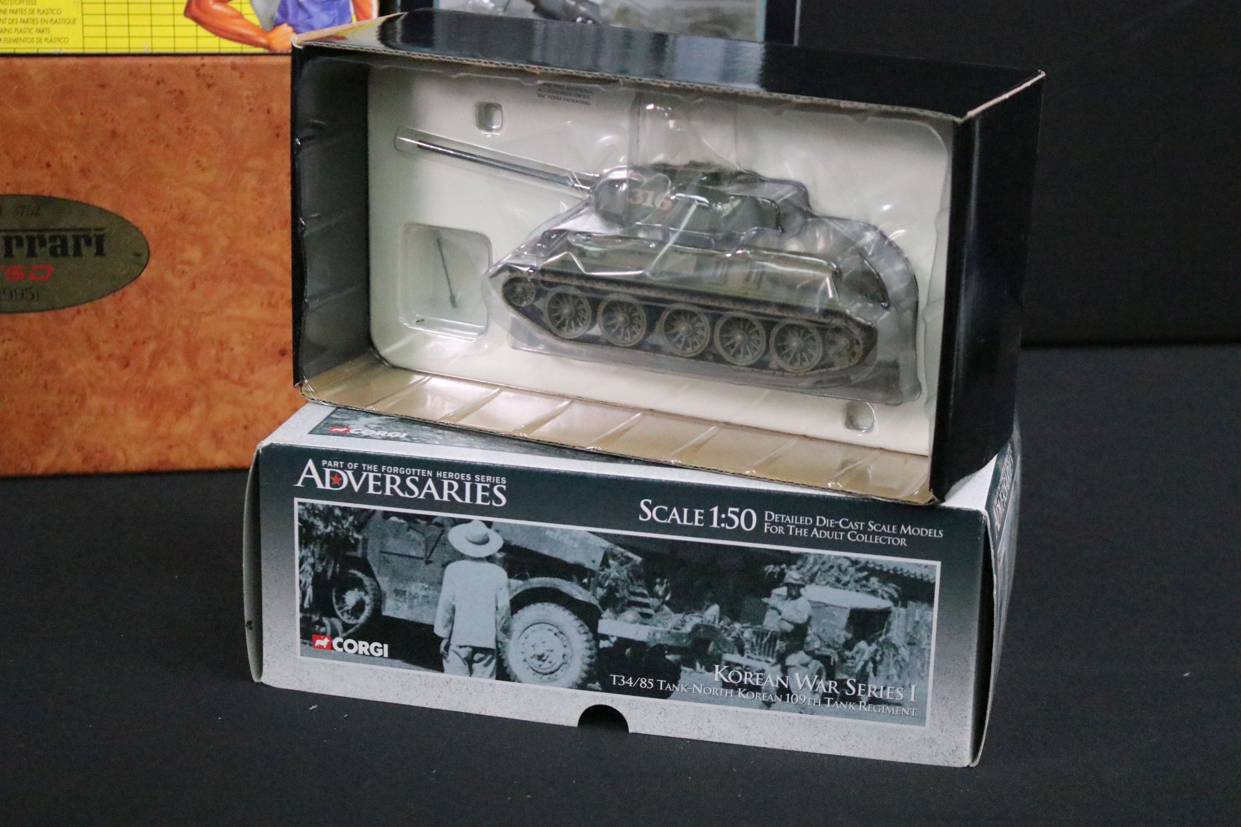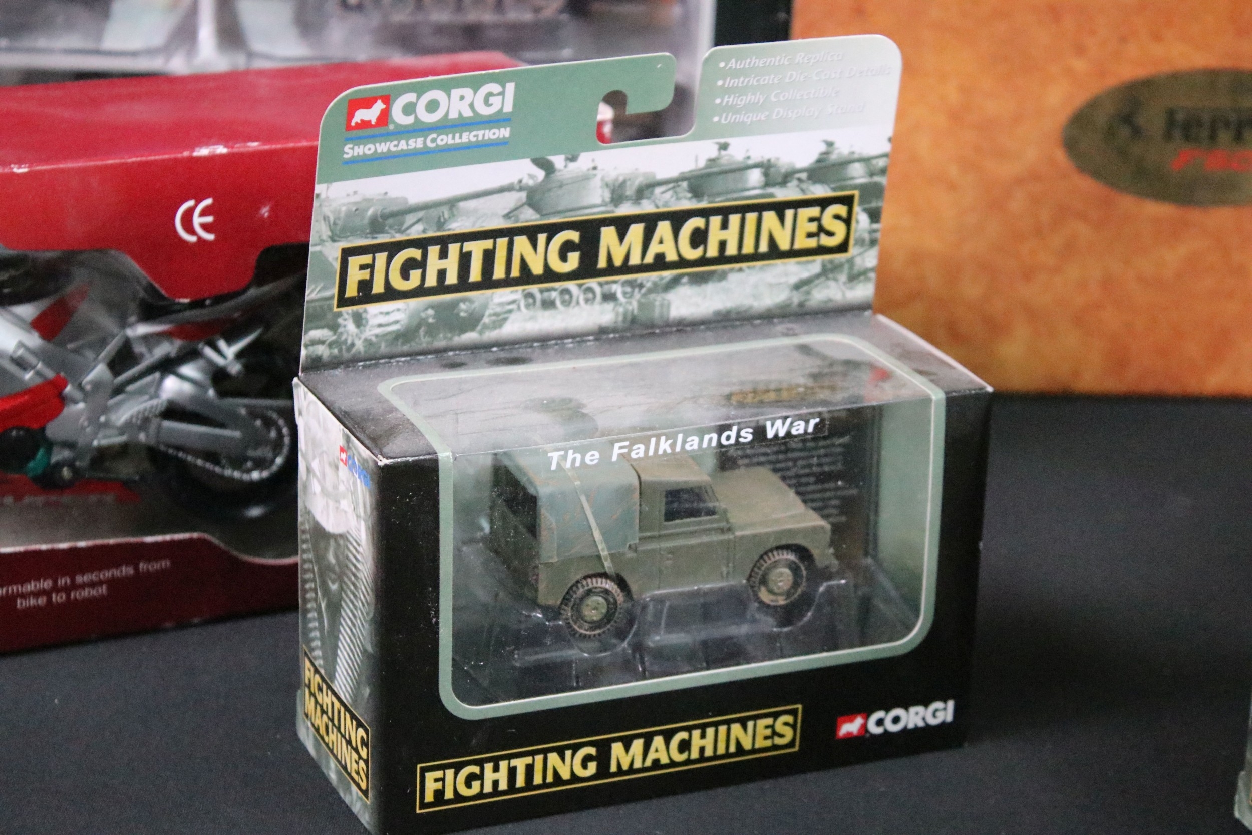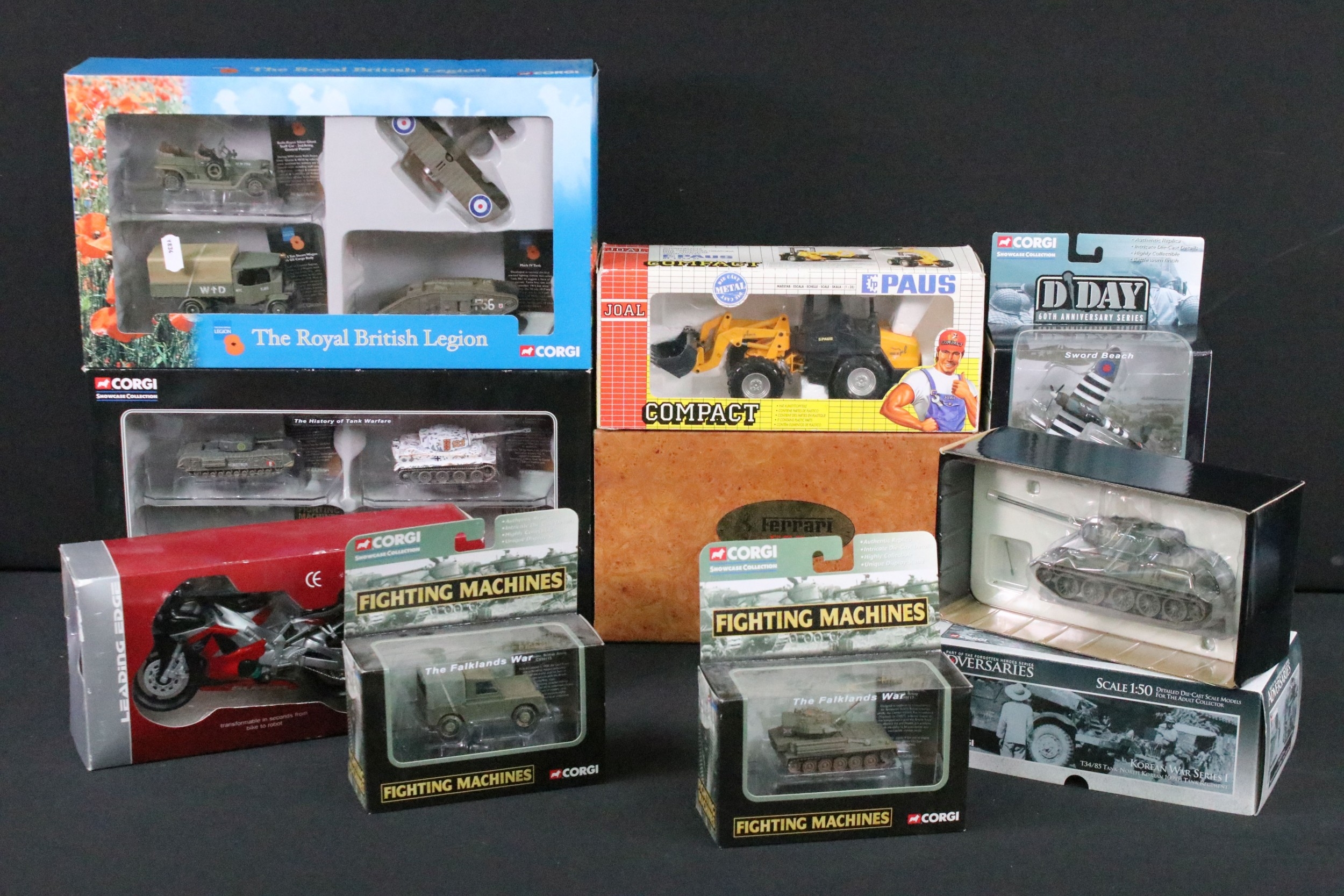 Six boxed Corgi War related diecast models featuring 2 x Fighting Machines The Falklands War models (CS90117 Scorpion Light Tank & CS90115 Land Rover), 1 x Korean War Series I US 51601 T34/85 Tank, 1 x The Royal British Legion CSVR 01004 WW1 Set, 1 x Fighting Machines CSCW25004 The History Of Tank Warfare set & 1 x 60th Anniversary Commemorative series CSCW21002 Sword Beach set plus 3 x boxed diecast models (1 x The Leading Edge Robo-Bike, 1 x Joal Compact 153 hp Paus & 1 x Burago Ferrari F50 1995), diecast ex, boxes vg