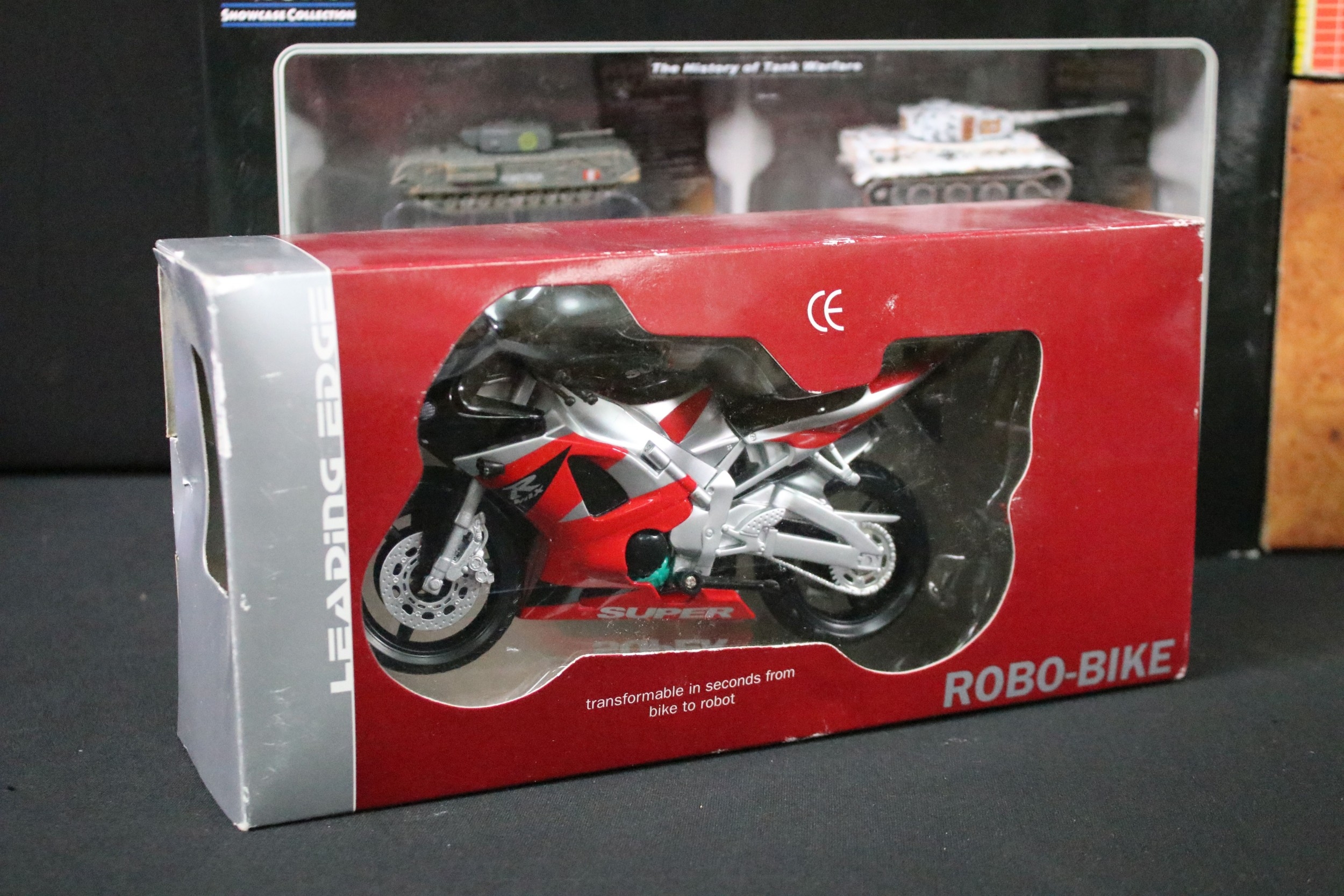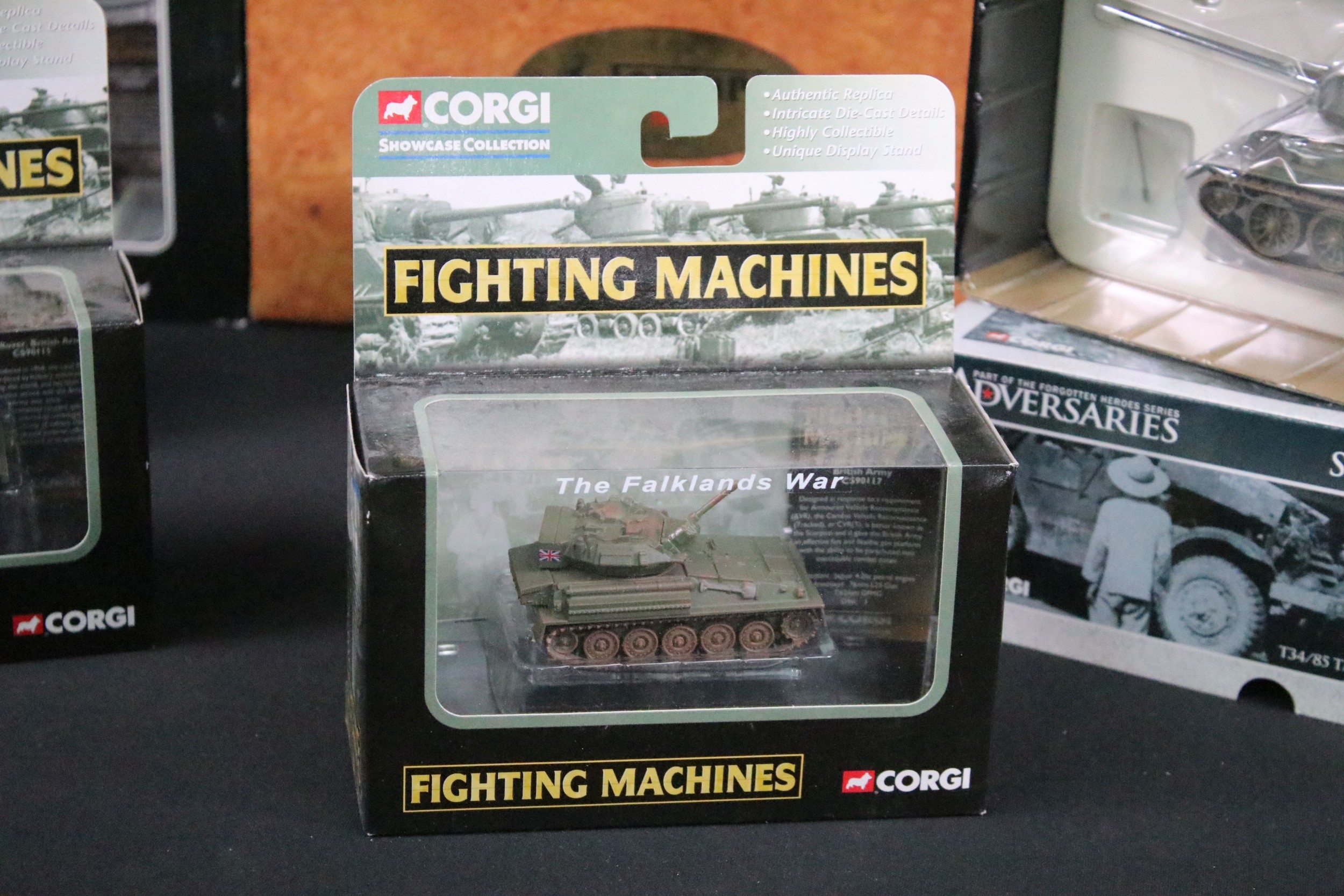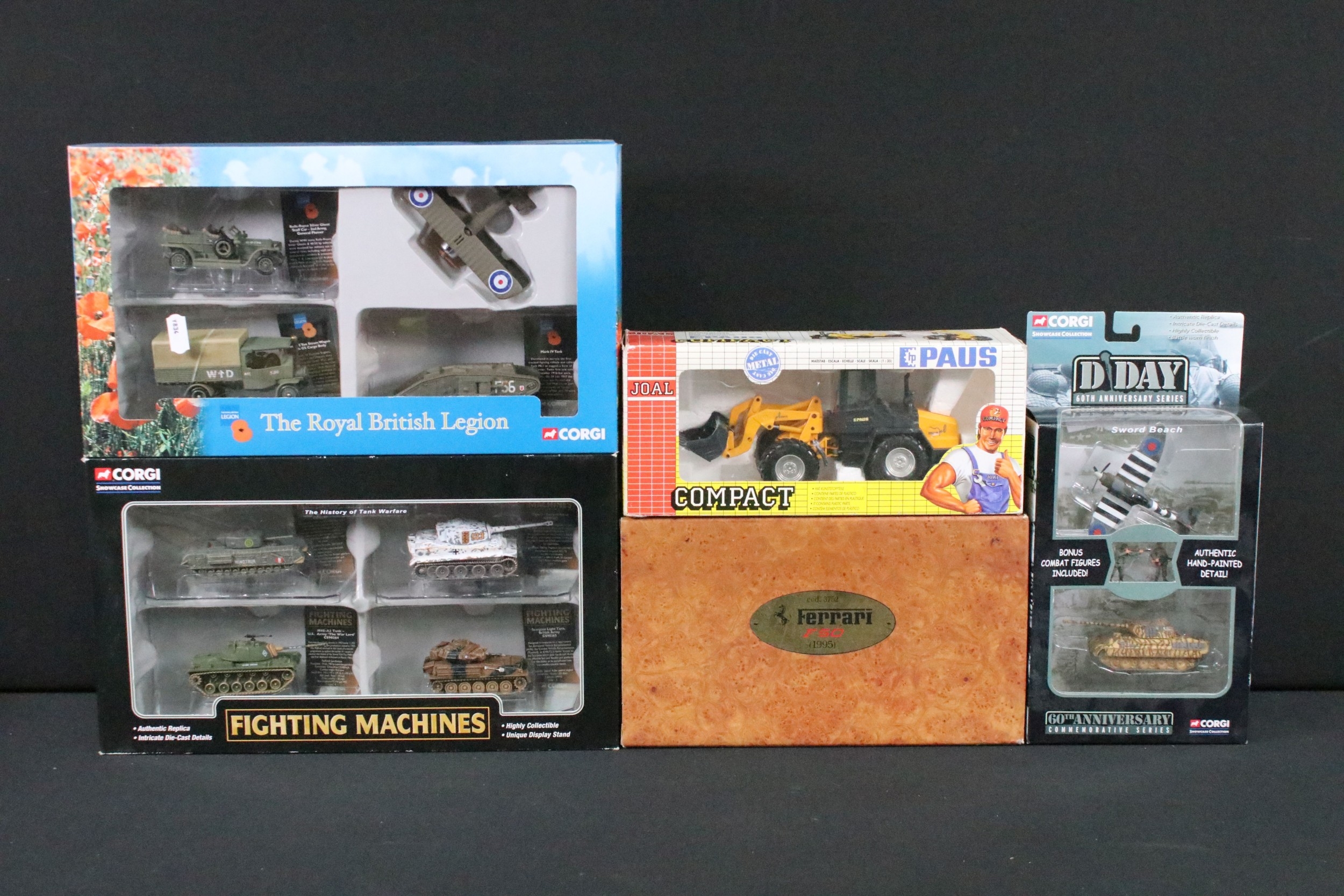 Six boxed Corgi War related diecast models featuring 2 x Fighting Machines The Falklands War models (CS90117 Scorpion Light Tank & CS90115 Land Rover), 1 x Korean War Series I US 51601 T34/85 Tank, 1 x The Royal British Legion CSVR 01004 WW1 Set, 1 x Fighting Machines CSCW25004 The History Of Tank Warfare set & 1 x 60th Anniversary Commemorative series CSCW21002 Sword Beach set plus 3 x boxed diecast models (1 x The Leading Edge Robo-Bike, 1 x Joal Compact 153 hp Paus & 1 x Burago Ferrari F50 1995), diecast ex, boxes vg